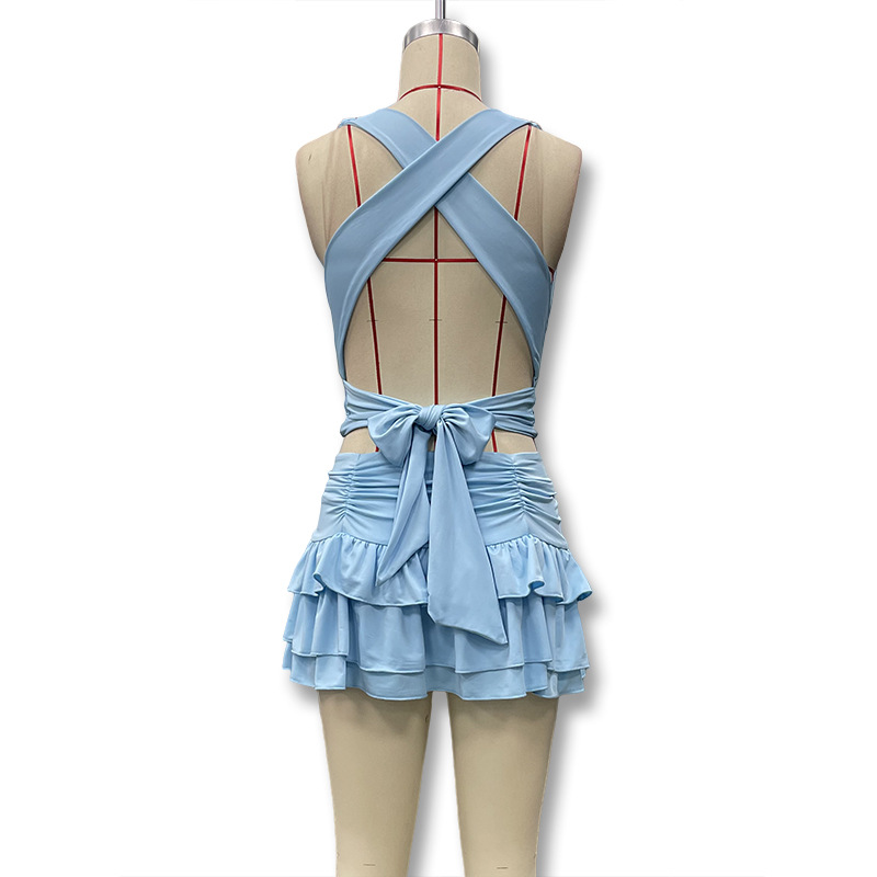 국경을 넘나드는 새로운 유럽과 미국 의류, 섹시한 중공 스윙 칼라, 등이 없는 스트랩 탑, 여성용 하이 웨이스트 케이크 스커트 투피스 세트스토어 가기