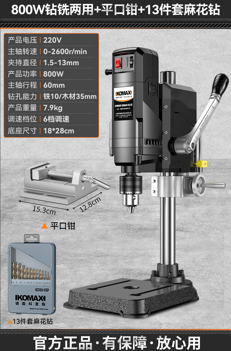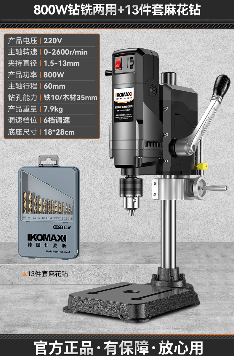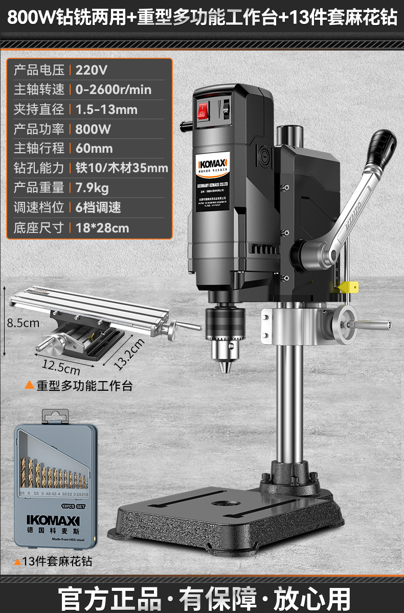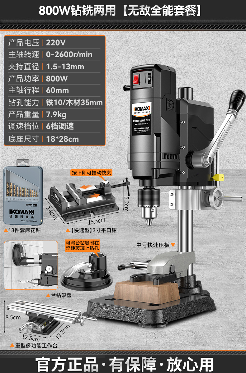 • 800W 드릴링 및 밀링 + 견고한 다기능 작업대 + 트위스트 드릴 13개 세트