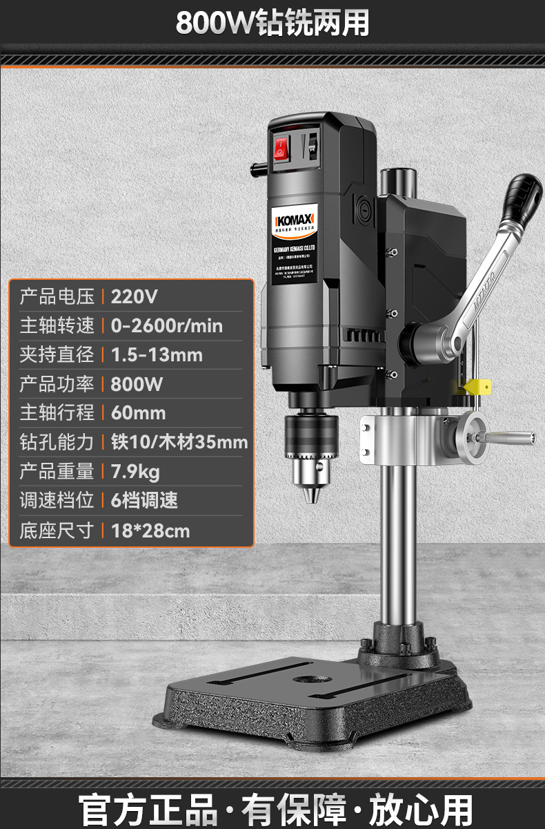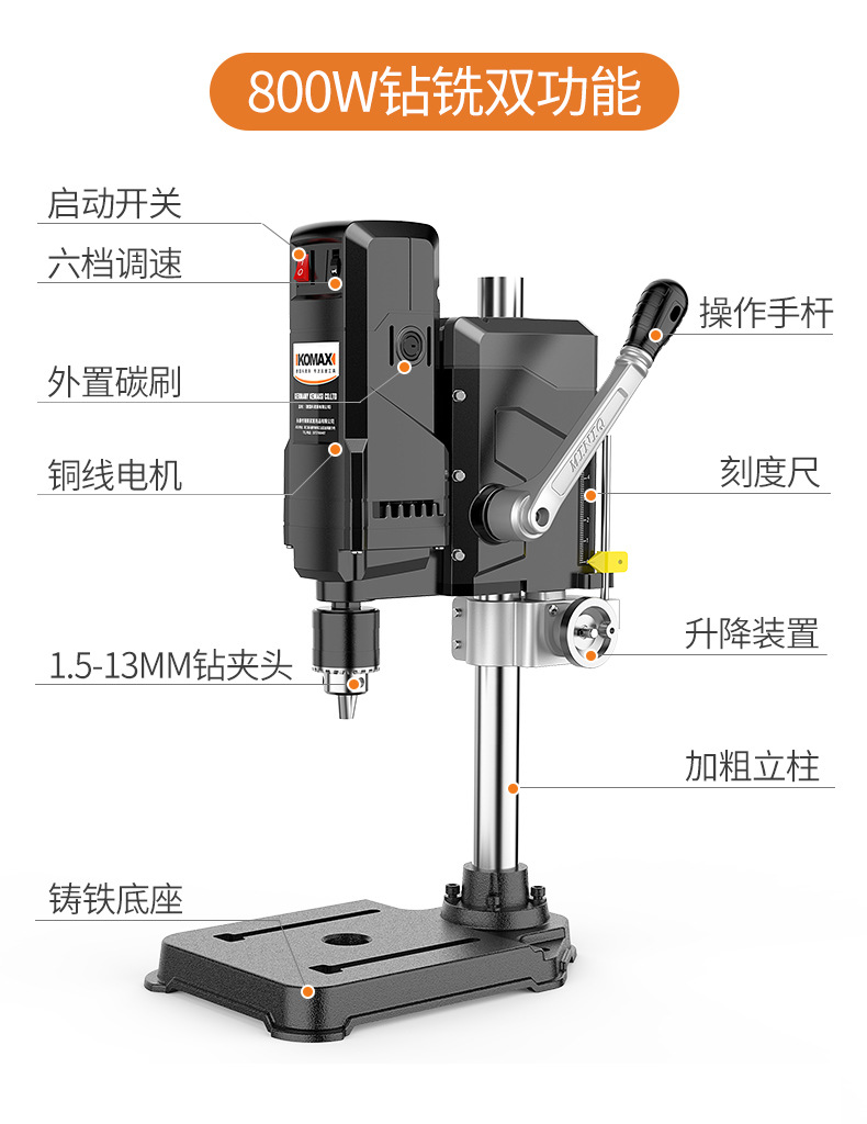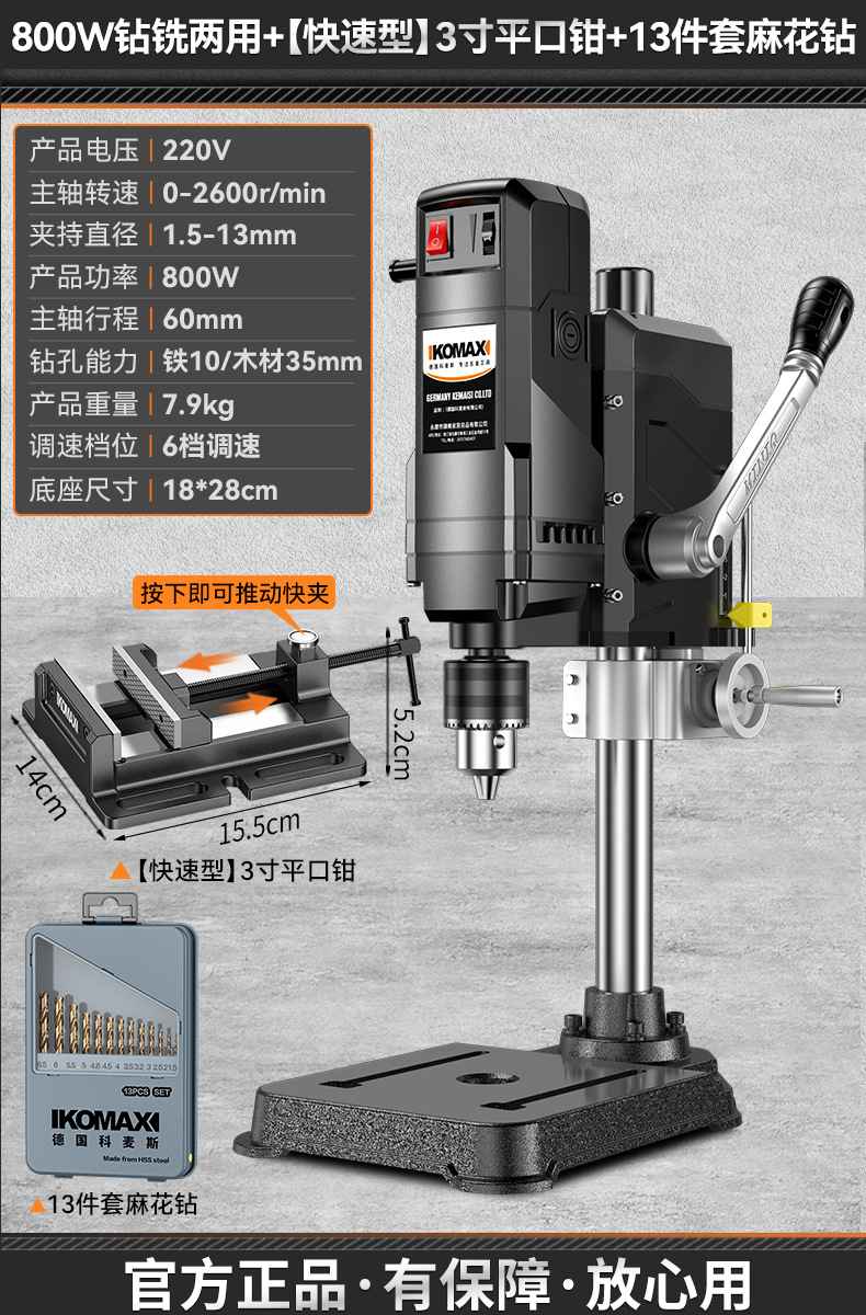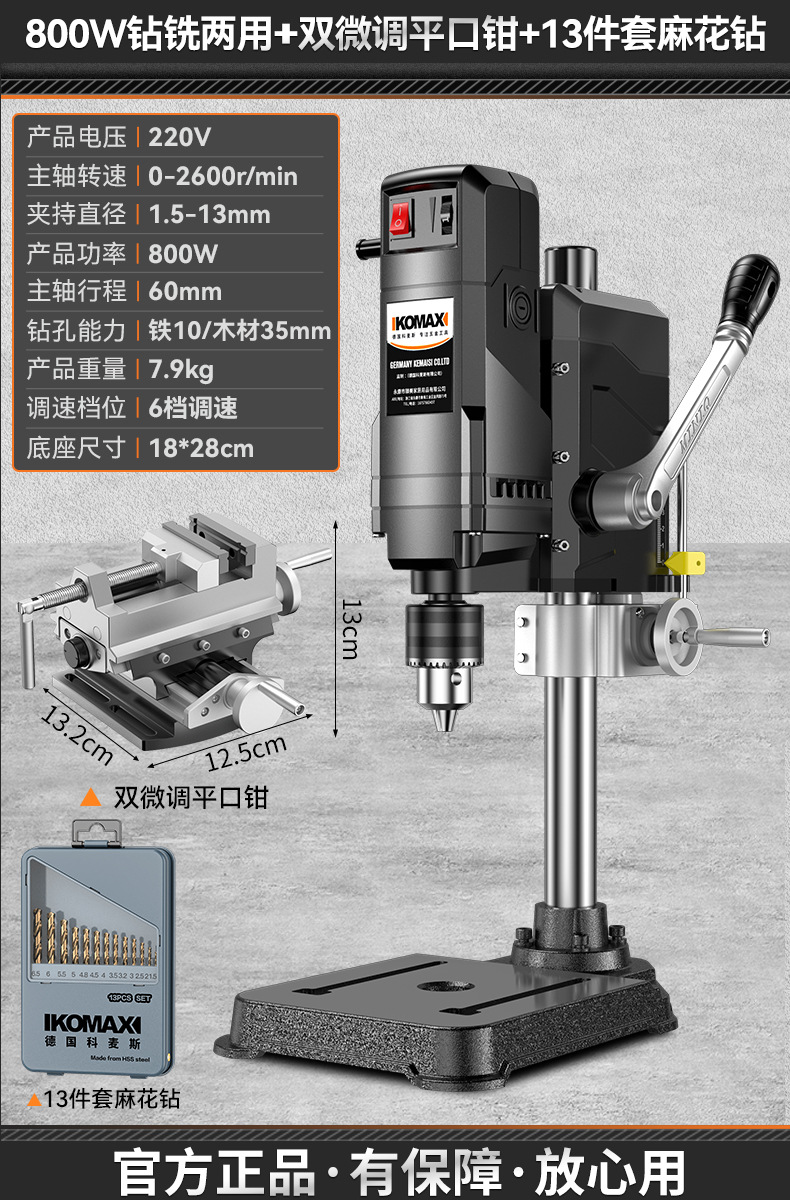 • 800W 드릴링 및 밀링 + 견고한 다기능 작업대 + 트위스트 드릴 13개 세트