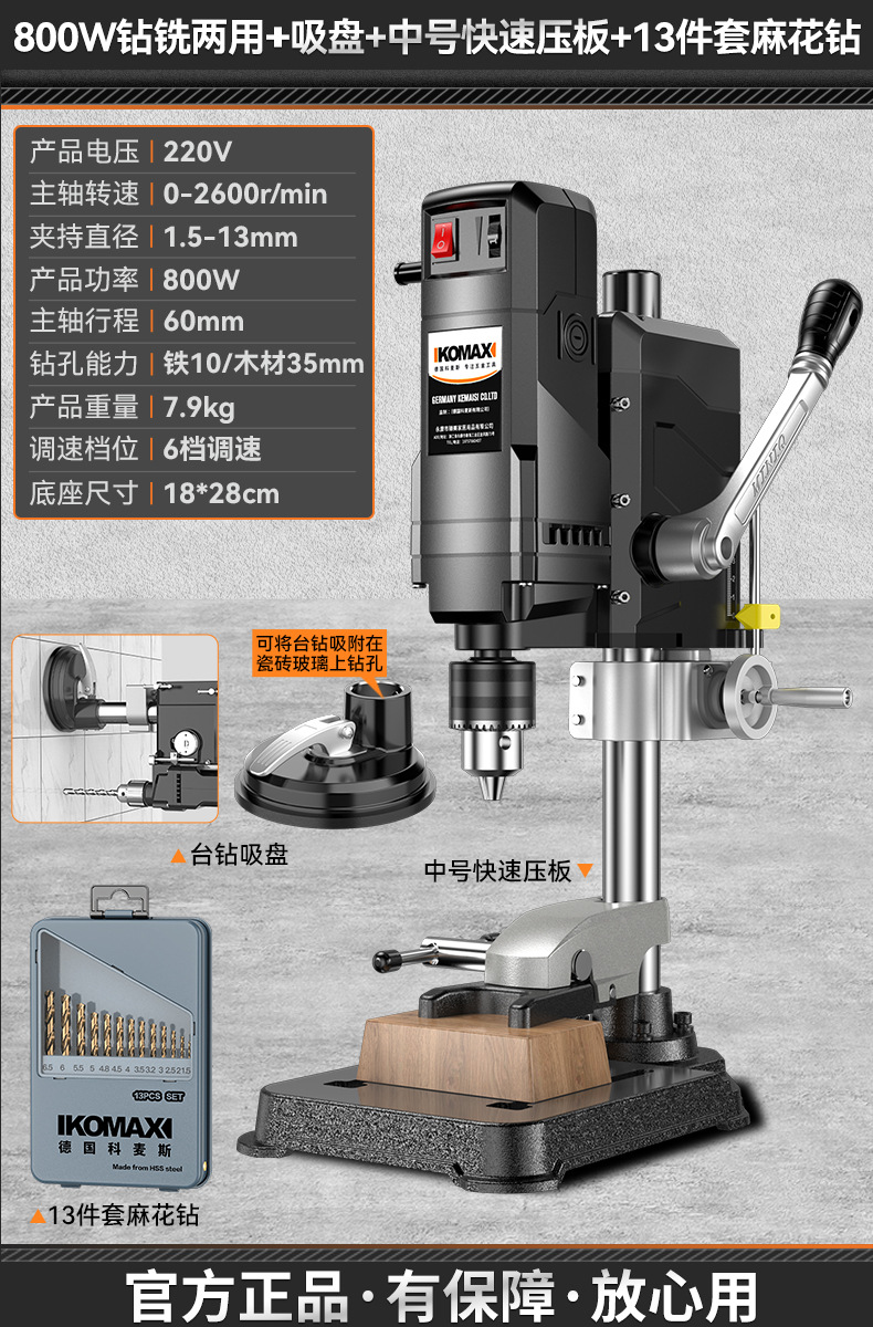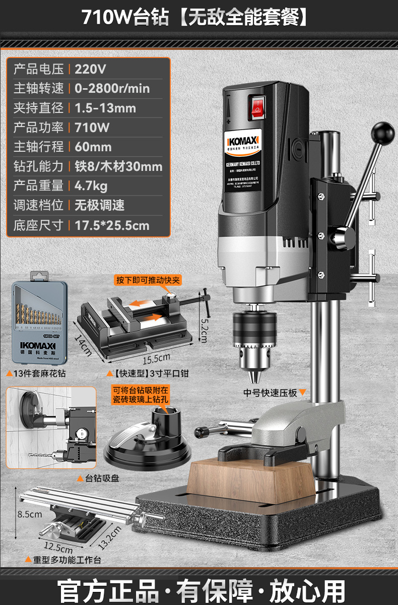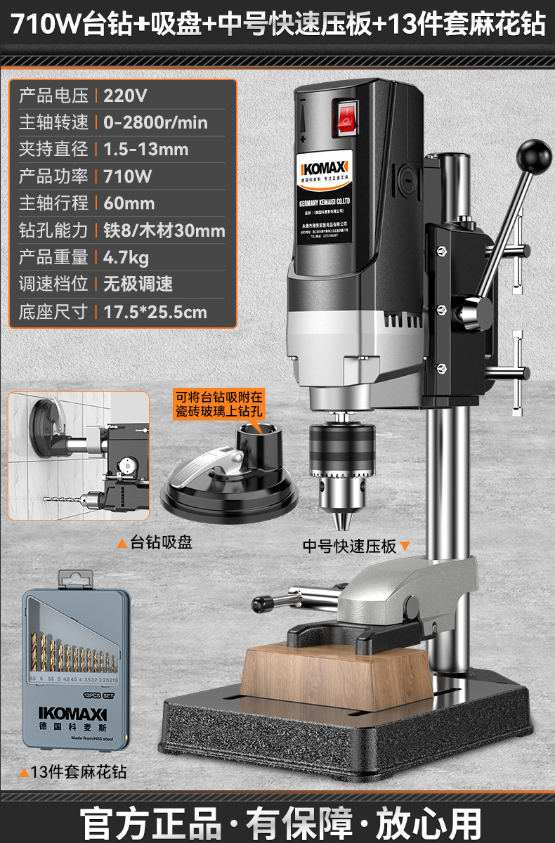 • 710W 벤치 드릴 + 흡입 컵 + 중형 퀵 프레스 플레이트 + 트위스트 드릴 13개 세트