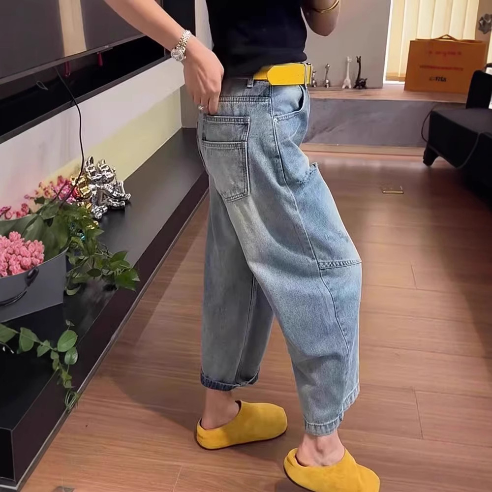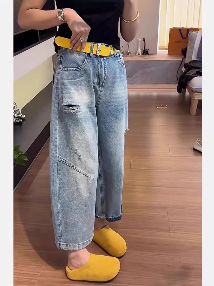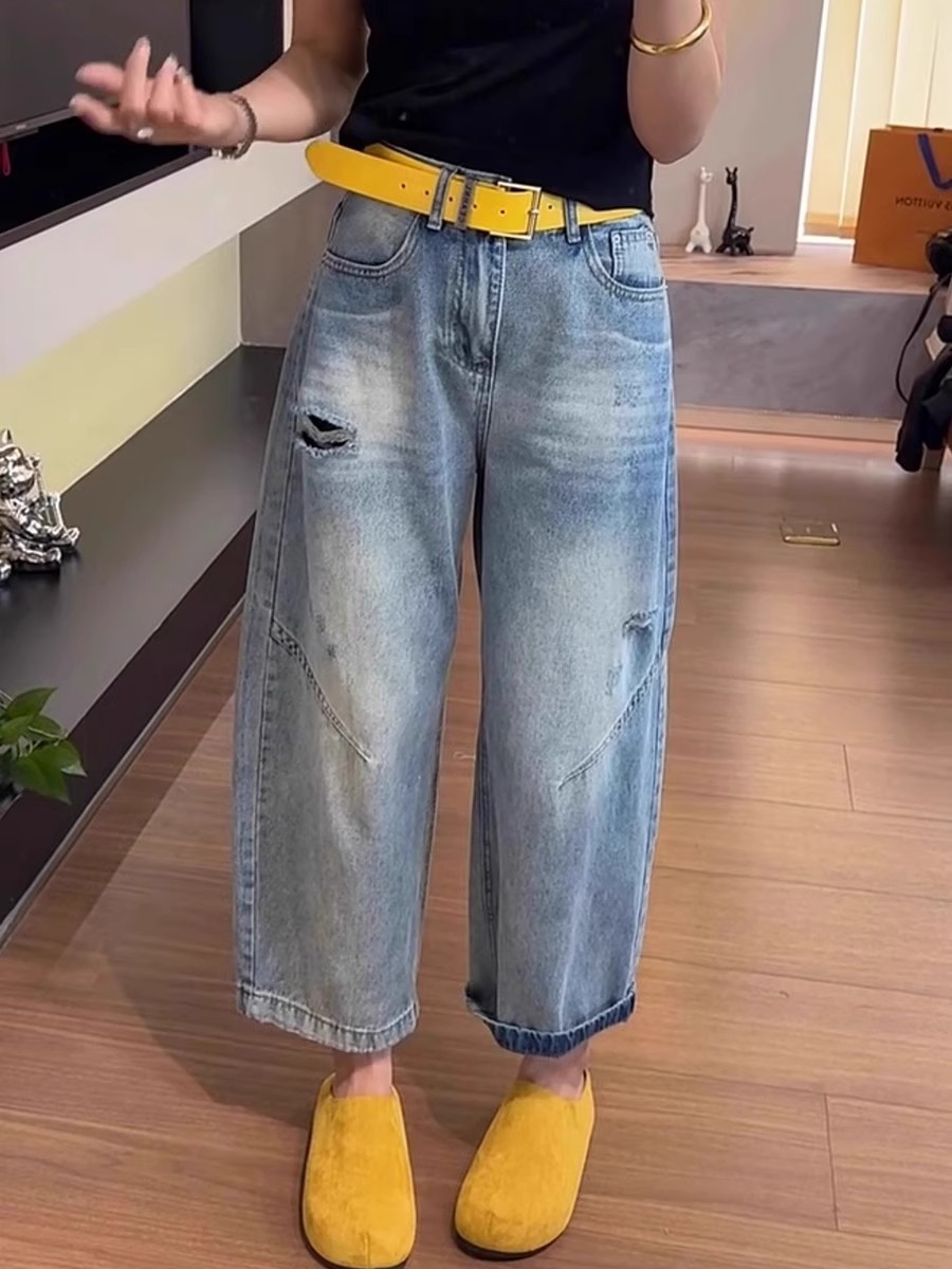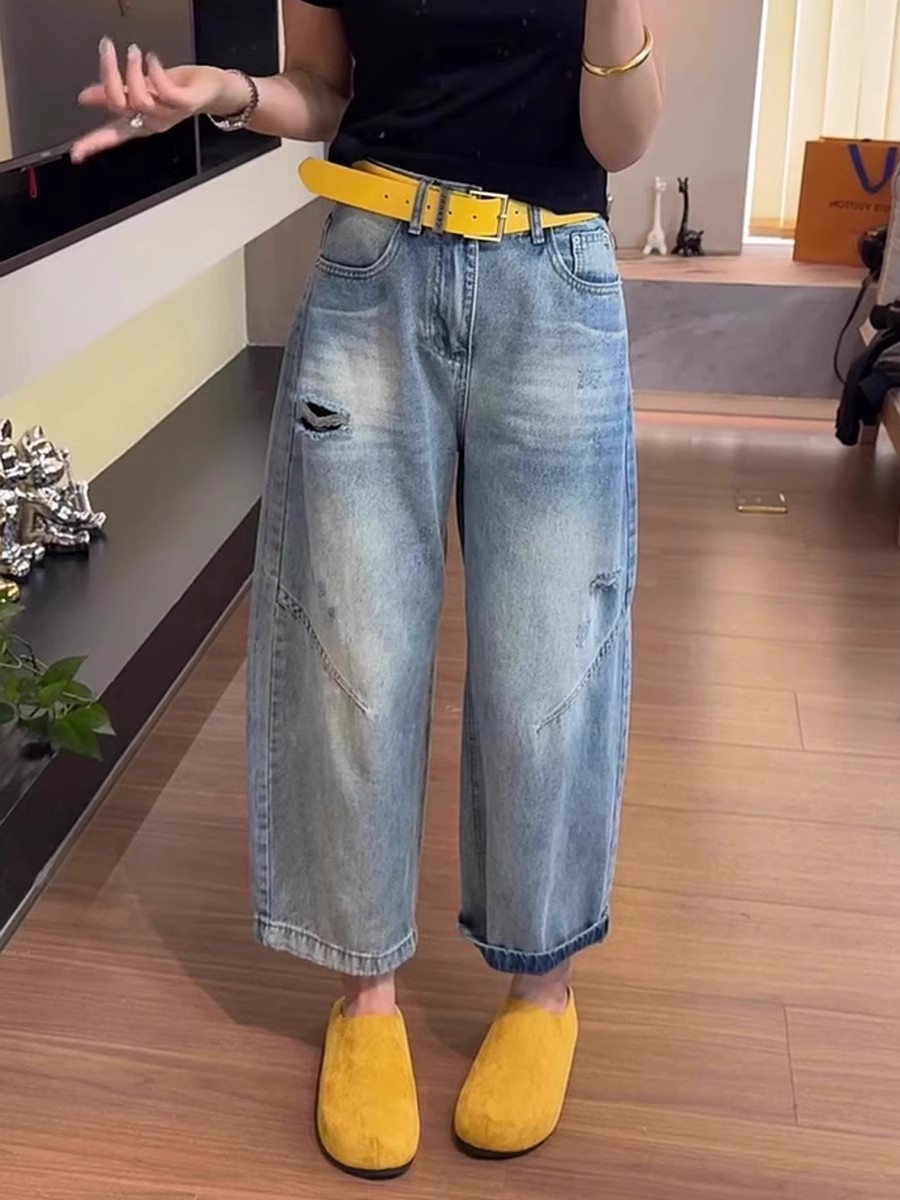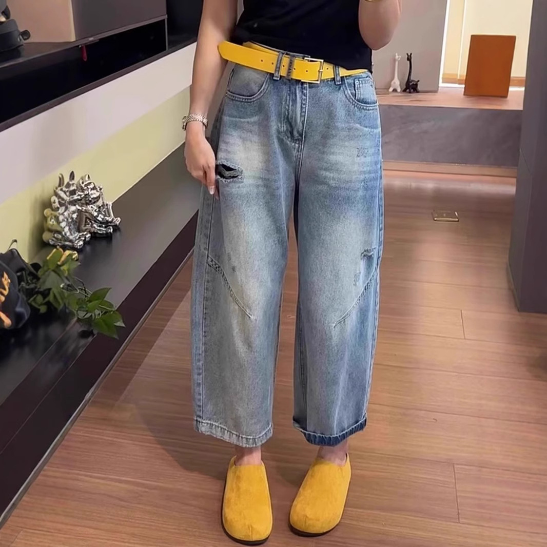 2026년 여름 신상 여성 와이드 데님 팬츠, 슬림핏 당근팬츠, 빅사이즈 얇은 데미지 하렘 팬츠스토어 가기