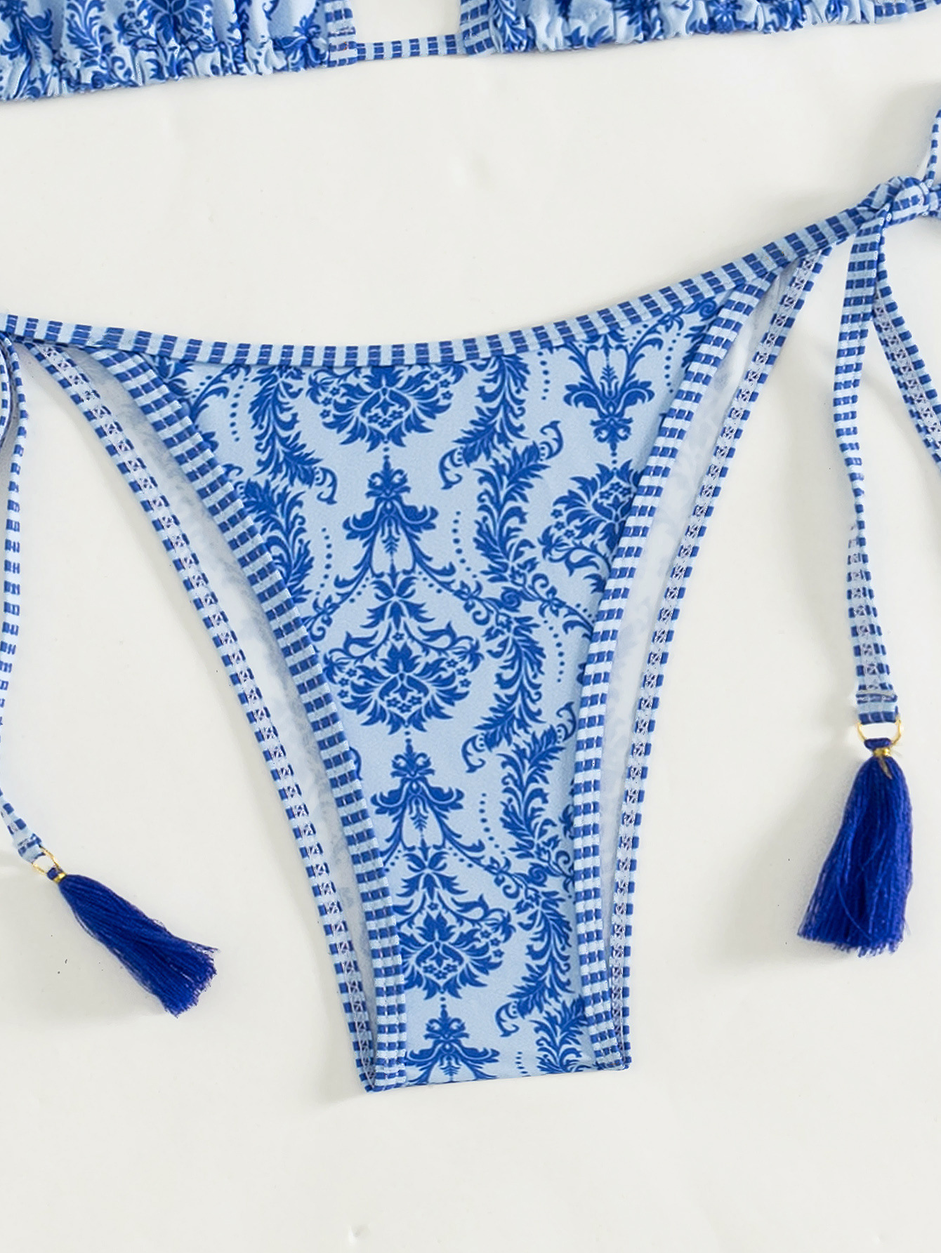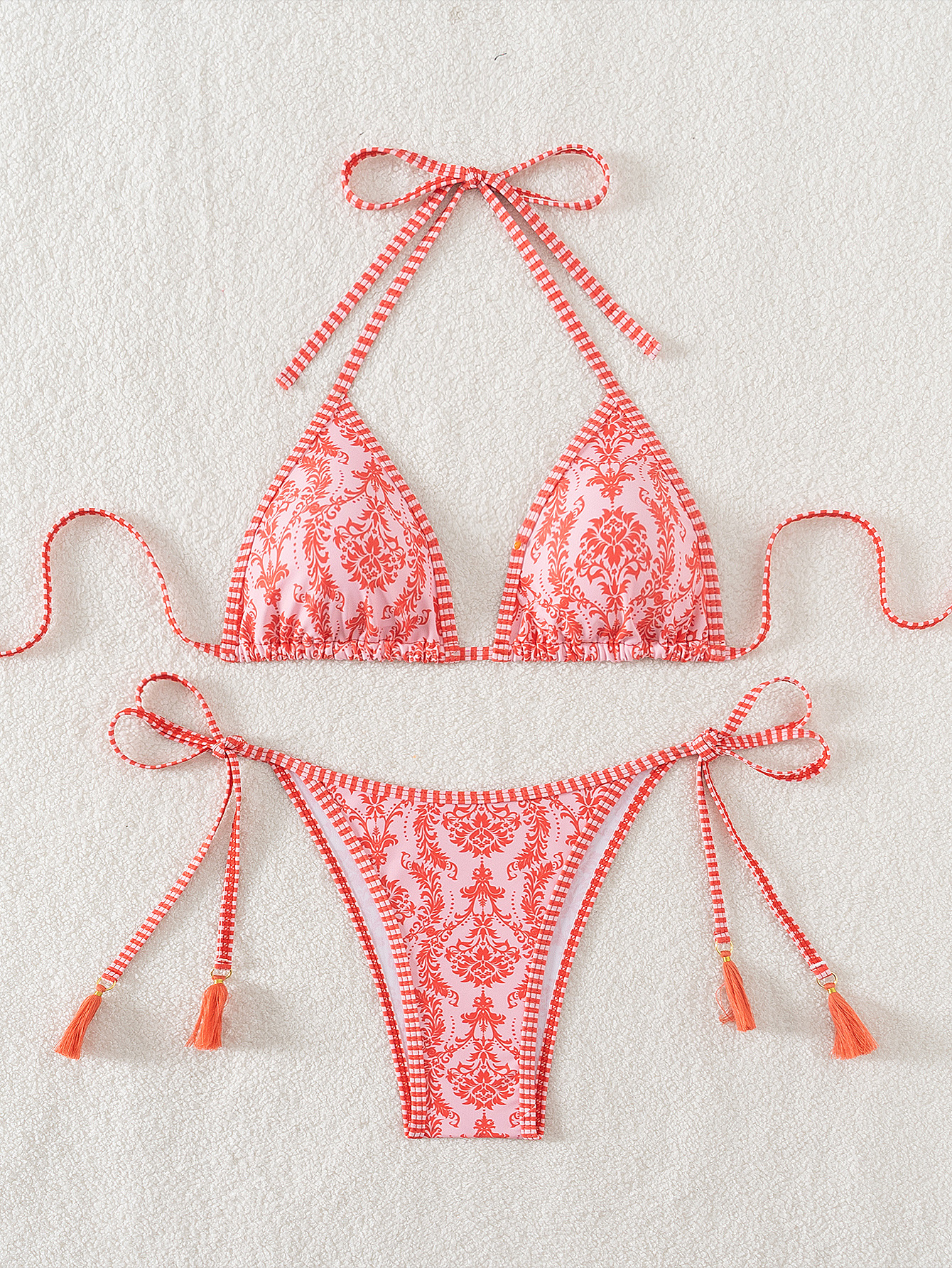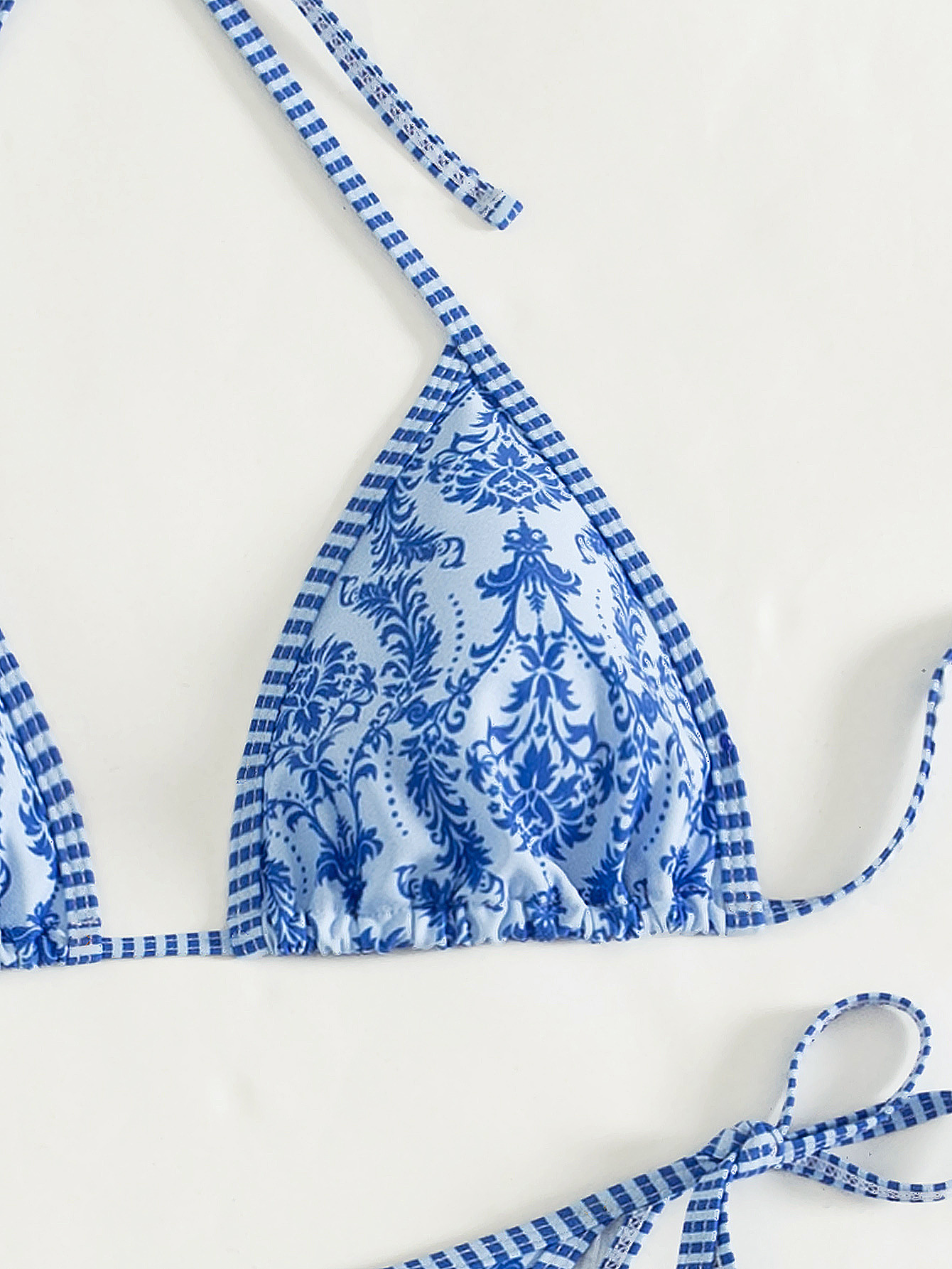 새로운 민족 스타일 인쇄 삼각형 홀터넥 넥 레이스 업 비키니 수영복 세트 여성을위한 크로스 보더 뜨거운 판매 유럽과 미국 비키니