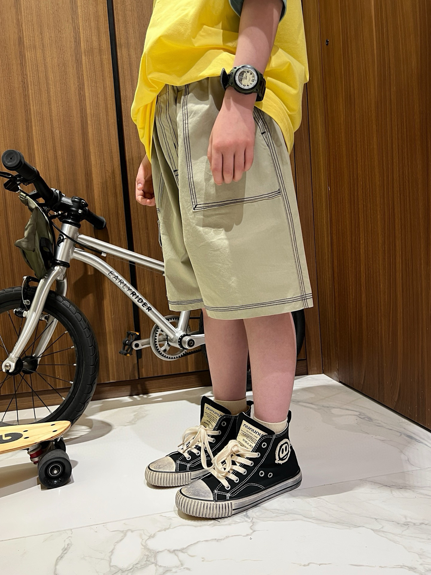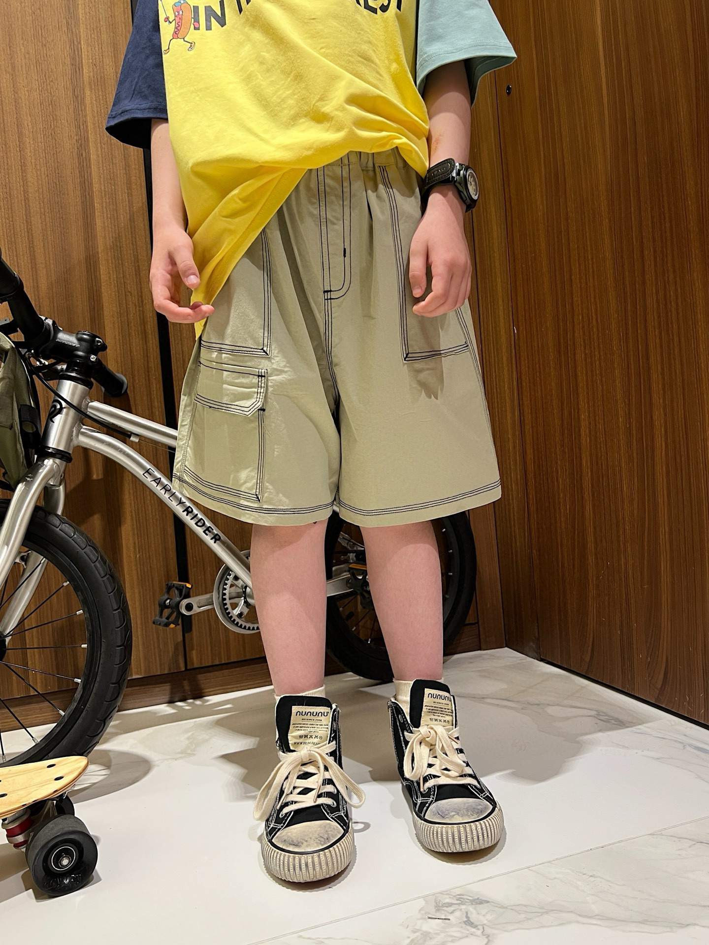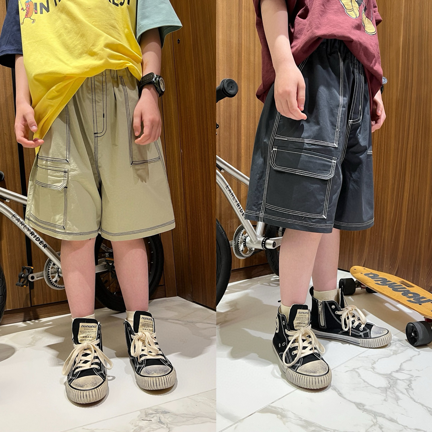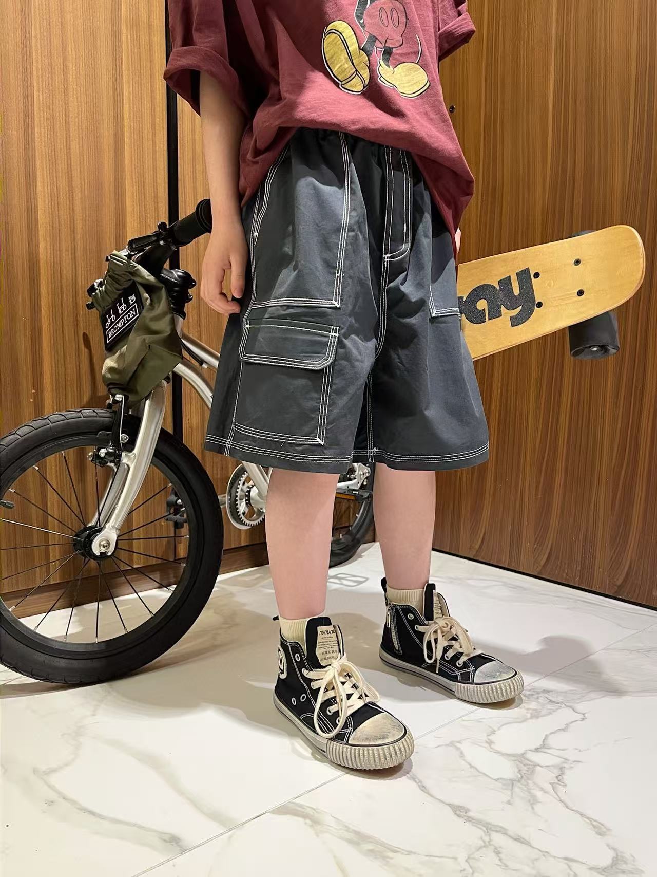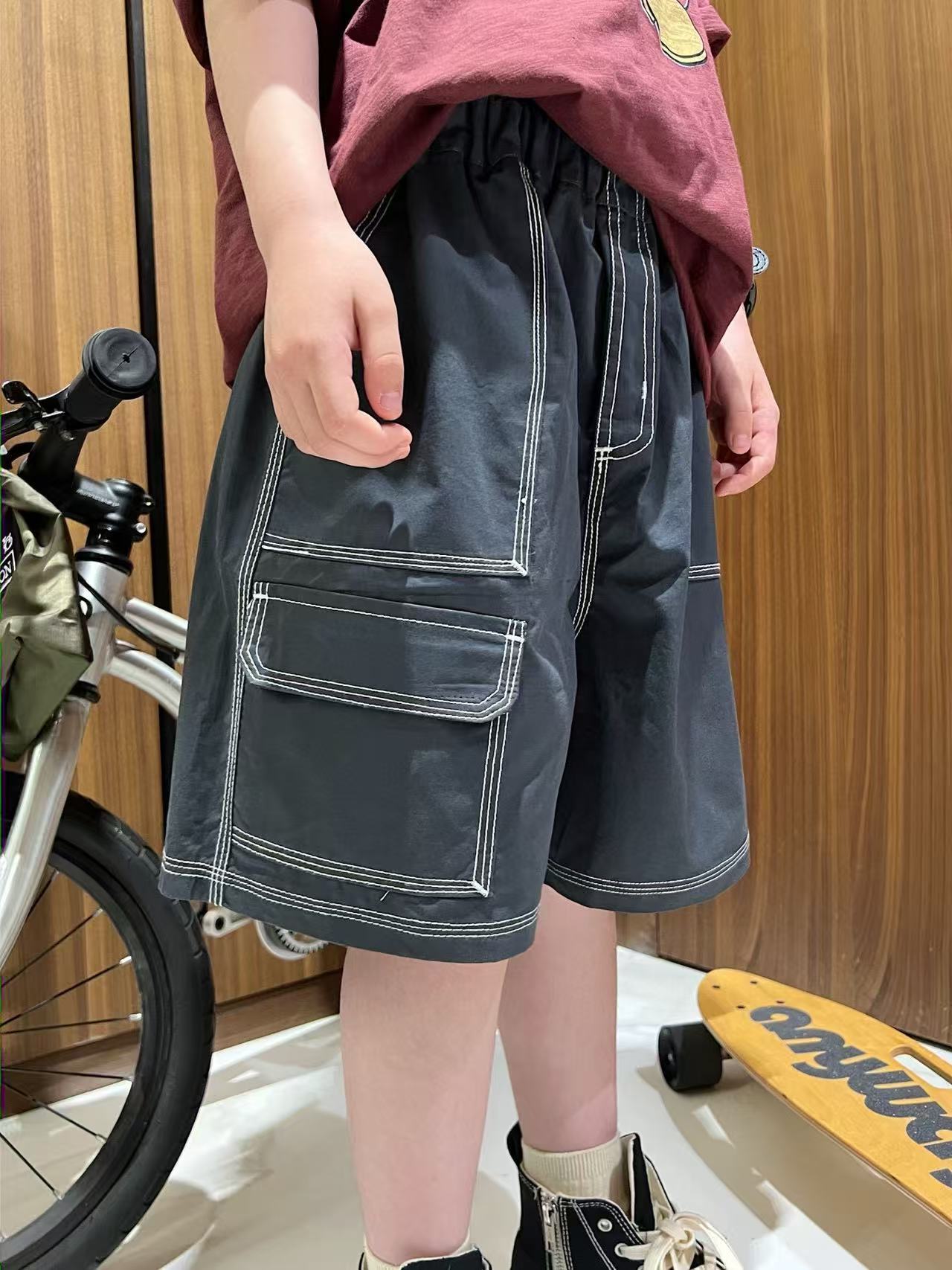 재고 25 여름 남성과 여성의 어린이 반바지 2 색 밝은 라인 포켓 반바지 어린이 작업복 스타일 여름 반바지스토어 가기