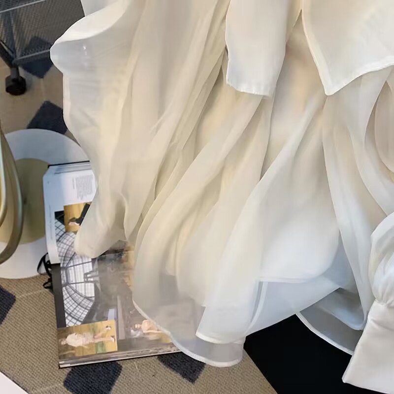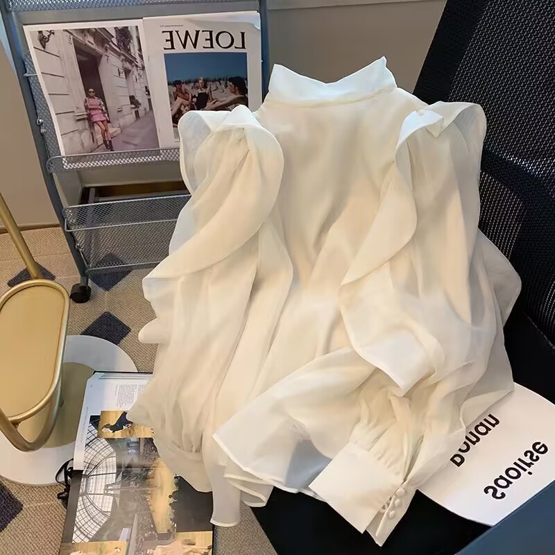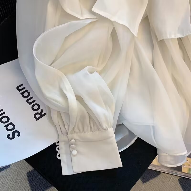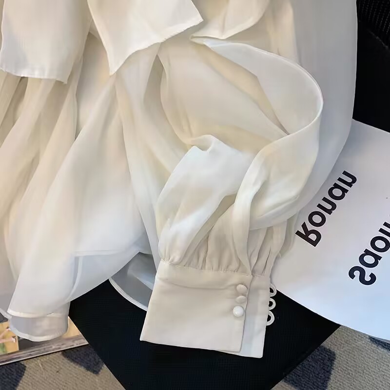 Bowknot 레이스 업 프릴 쉬폰 긴 소매 셔츠 여성 2025 봄, 가을 새로운 느슨한 다목적 탑