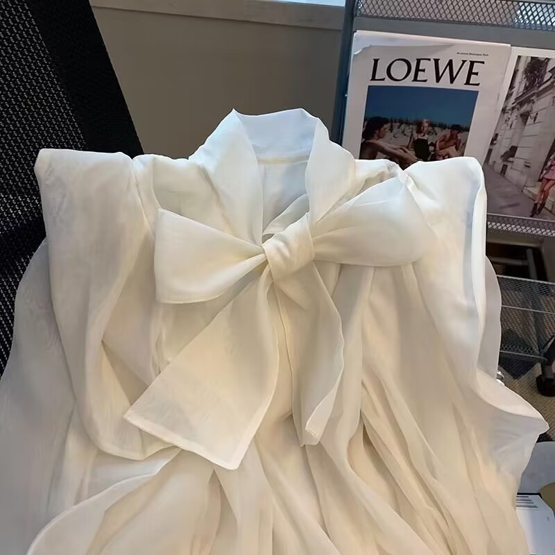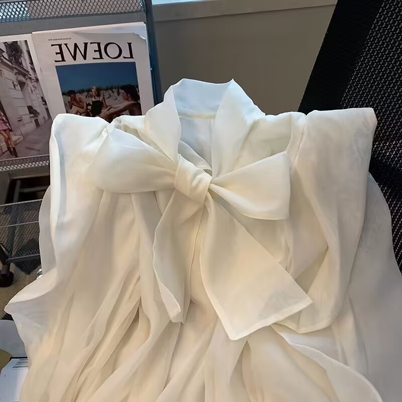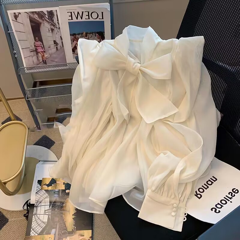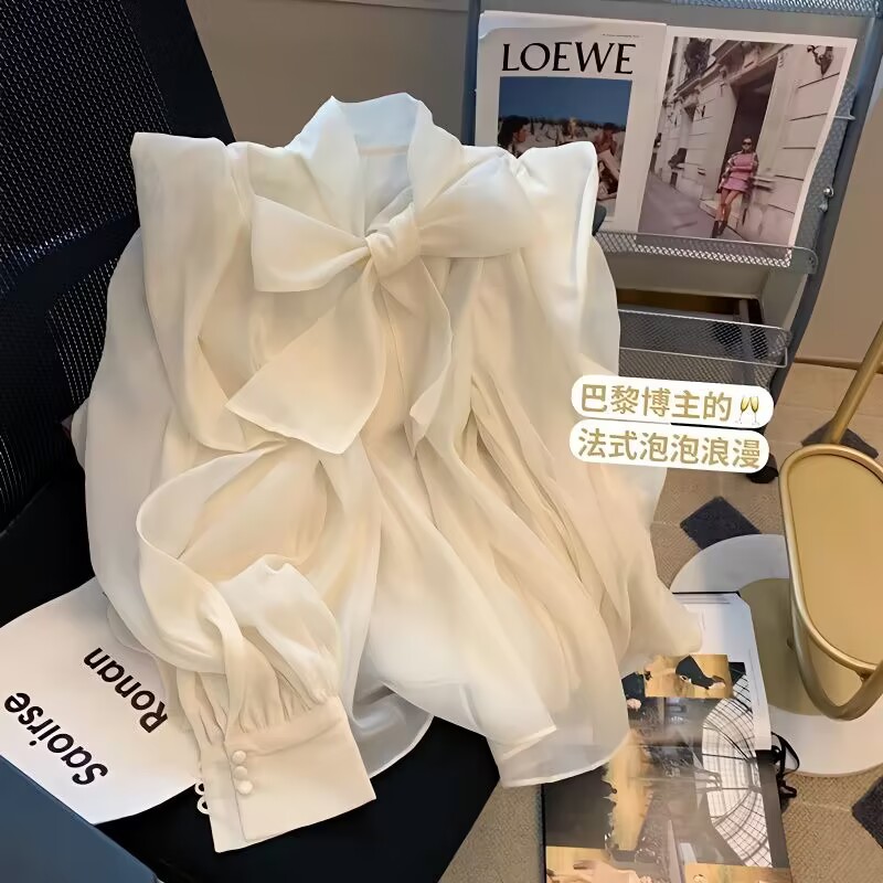 Bowknot 레이스 업 프릴 쉬폰 긴 소매 셔츠 여성 2025 봄, 가을 새로운 느슨한 다목적 탑스토어 가기