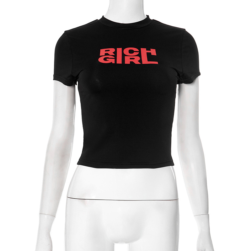 CUTENOVA 2025 Qiduo 여름 신작 여성 짧은 슬림 섹시한 라운드 넥 레터 프린트 반팔 티셔츠