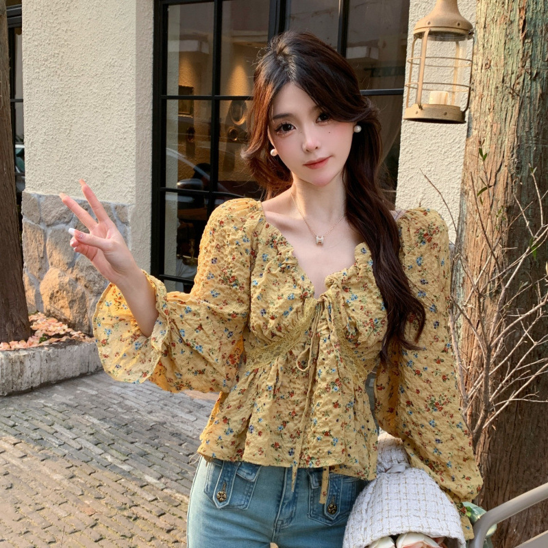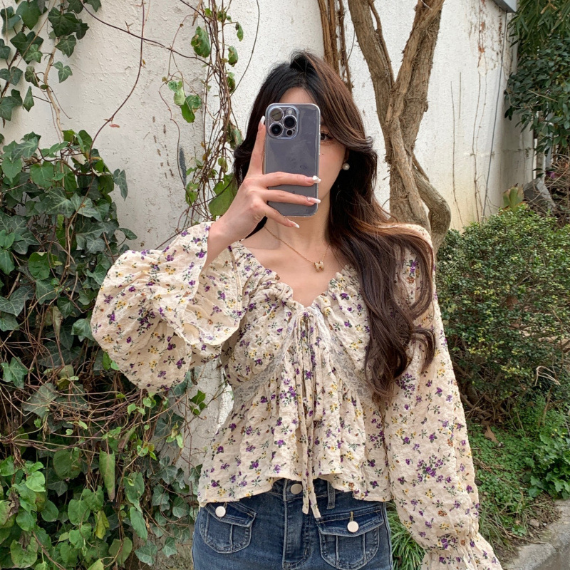 여성을위한 프랑스 스타일 꽃 셔츠 2025 봄, 가을 새로운 디자인 틈새 스타일 달콤한 쉬폰 셔츠 탑