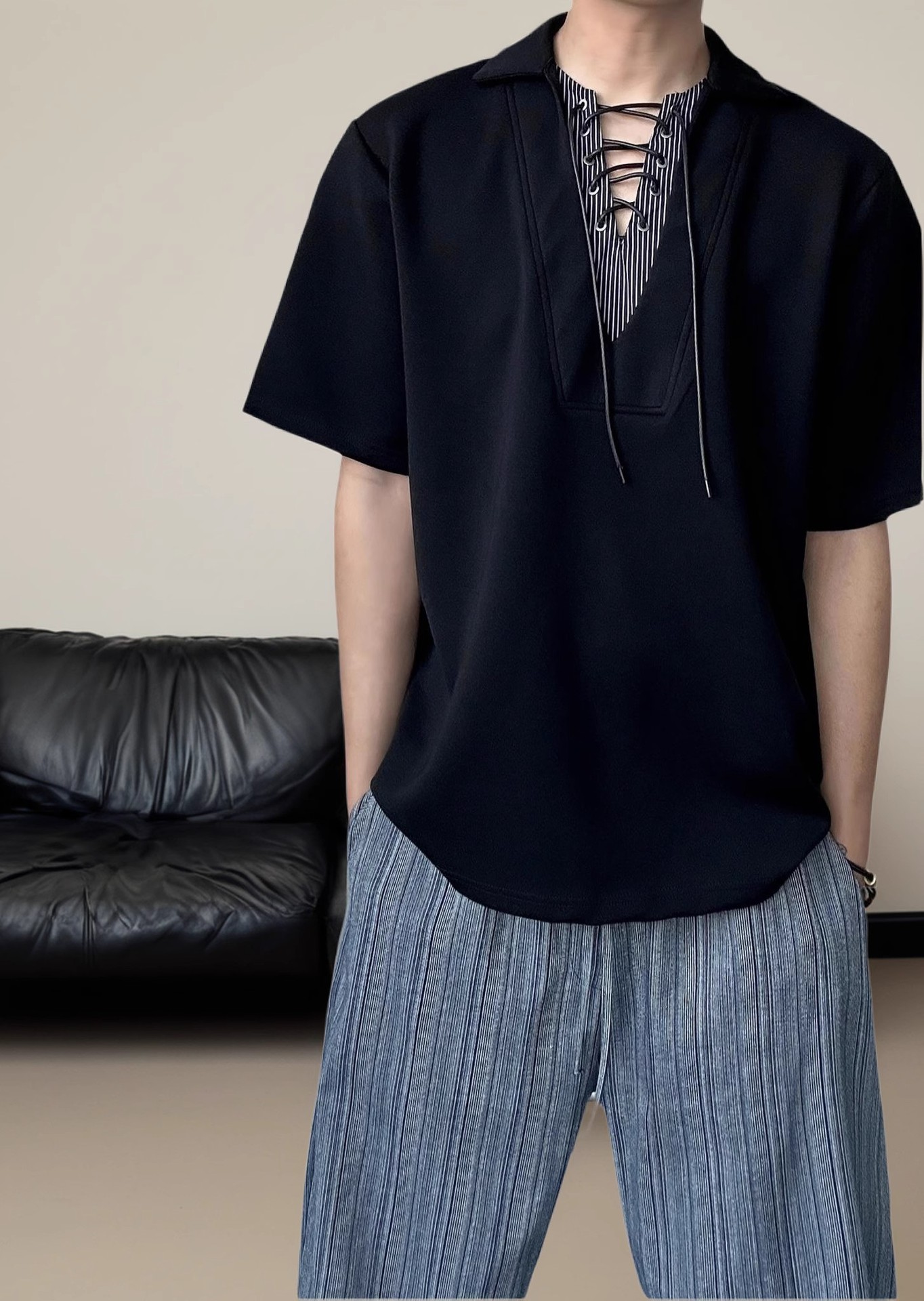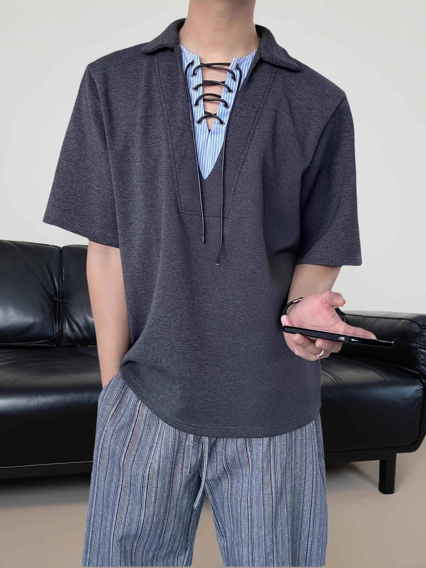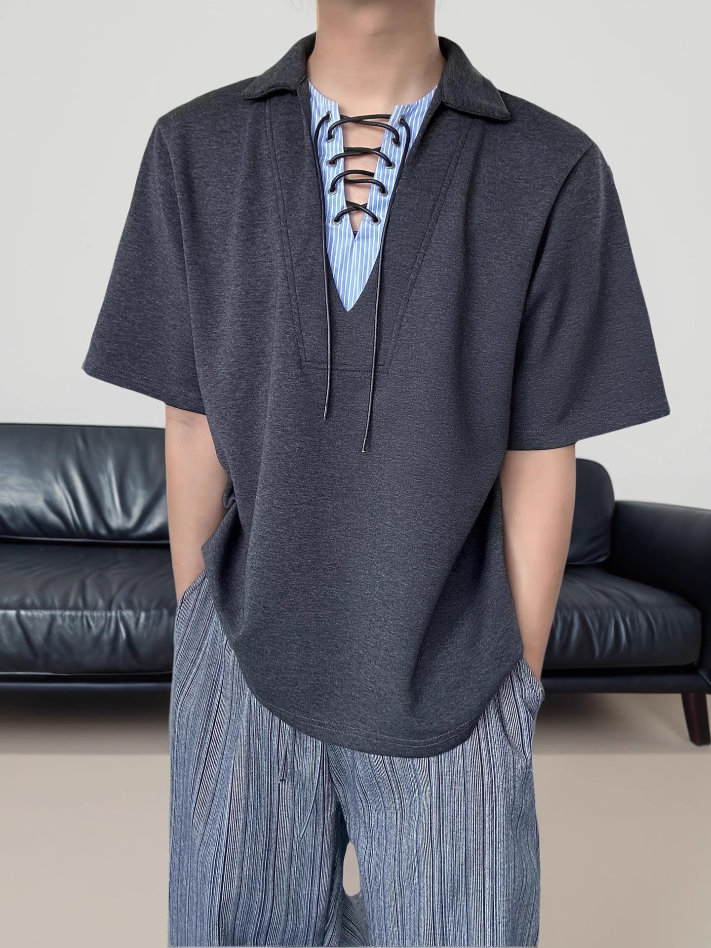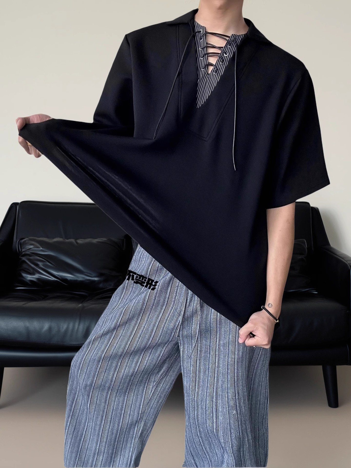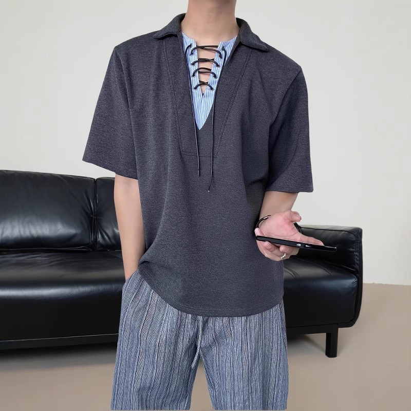 미국식 가짜 투피스 스티칭 칼라 반팔 남자 여름 느슨한 디자인 센스 셔츠 캐주얼 올 매치 반소매 셔츠