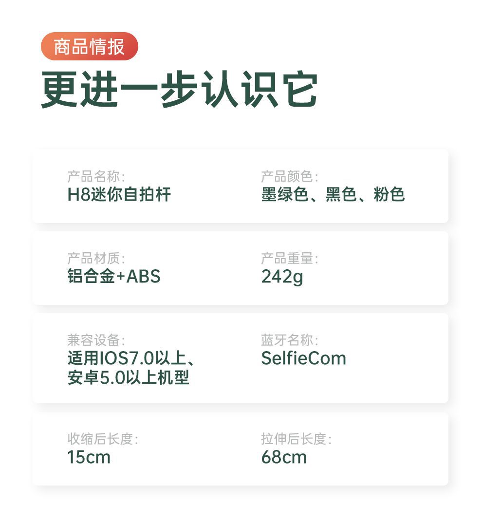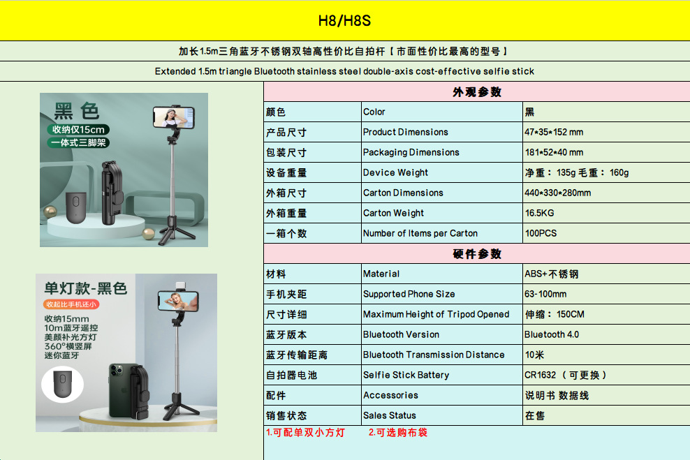 • 셀카봉 H8S 블랙 [싱글 소형 사각등]