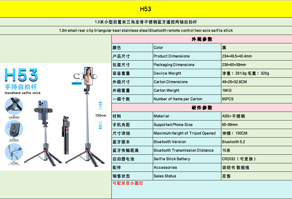 • 셀카봉 H53S 블랙 [싱글 소형 원형 조명]