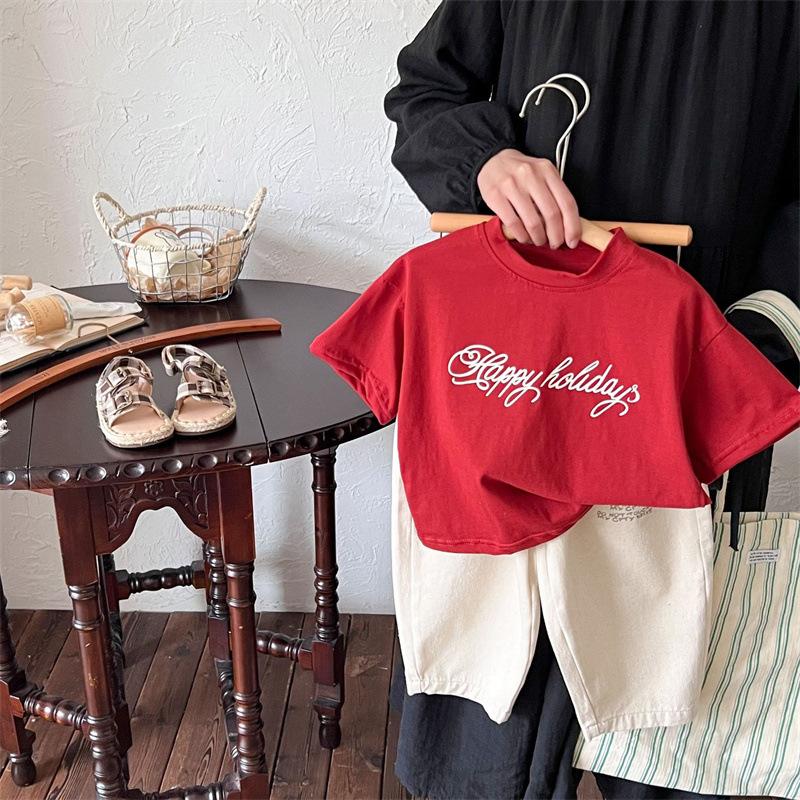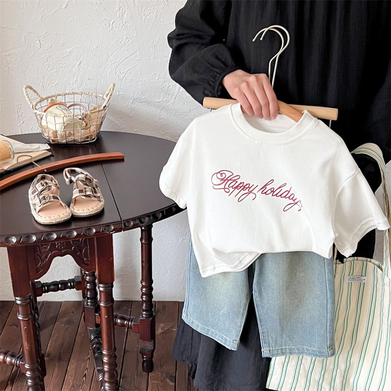 면 아동용 반팔 티셔츠 여름 스타일 소년 소녀용, 영문자 프린트, 중소형 아동용 루즈한 한국식 베이비 상의스토어 가기