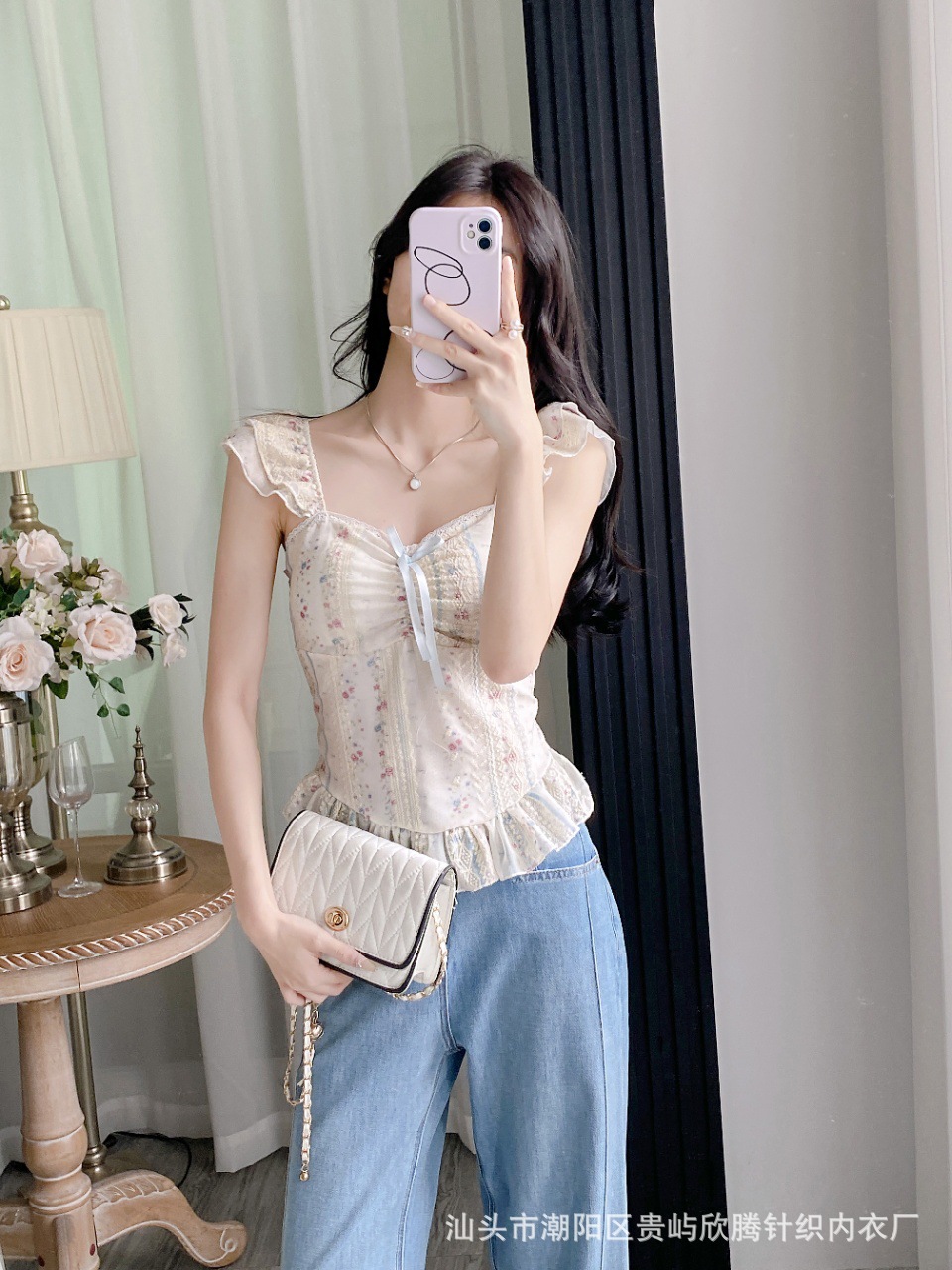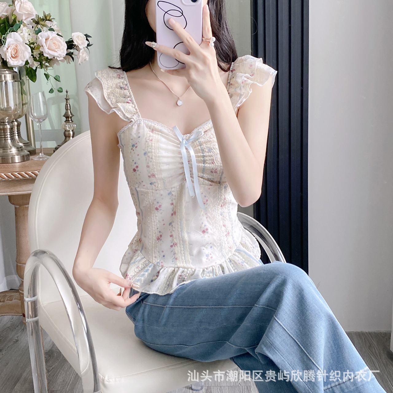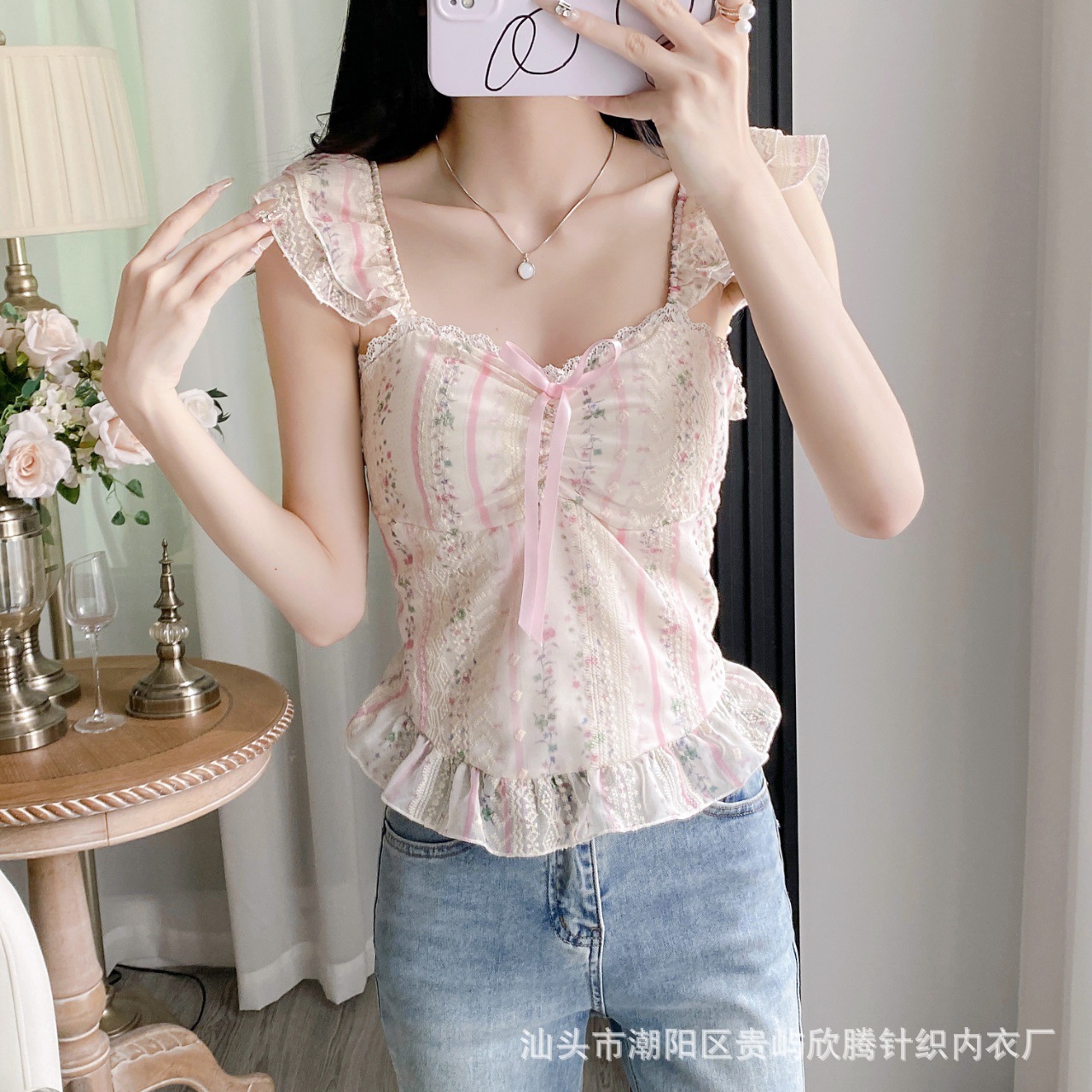 순수한 목가적 스타일의 달콤한 캐미솔 여성용 여름 반팔 꽃무늬 탑, 작은 키에도 밖에서 입을 수 있는 탑스토어 가기