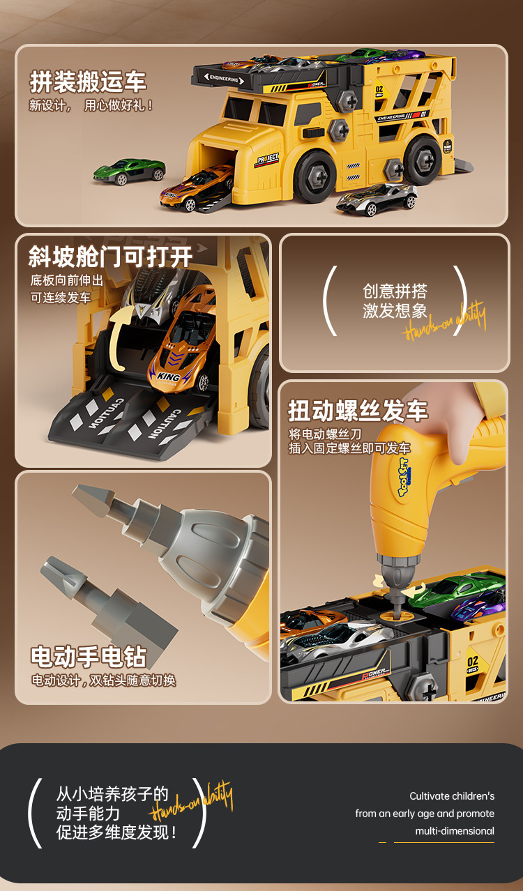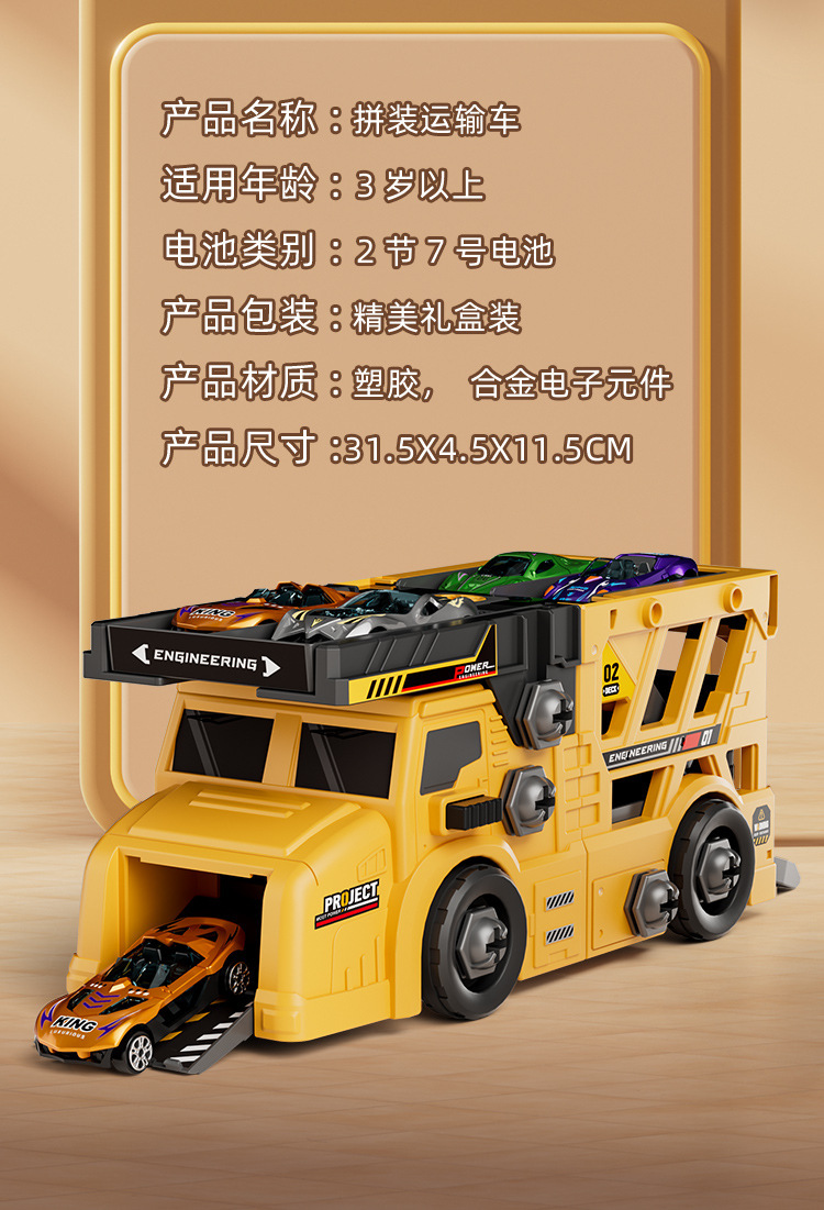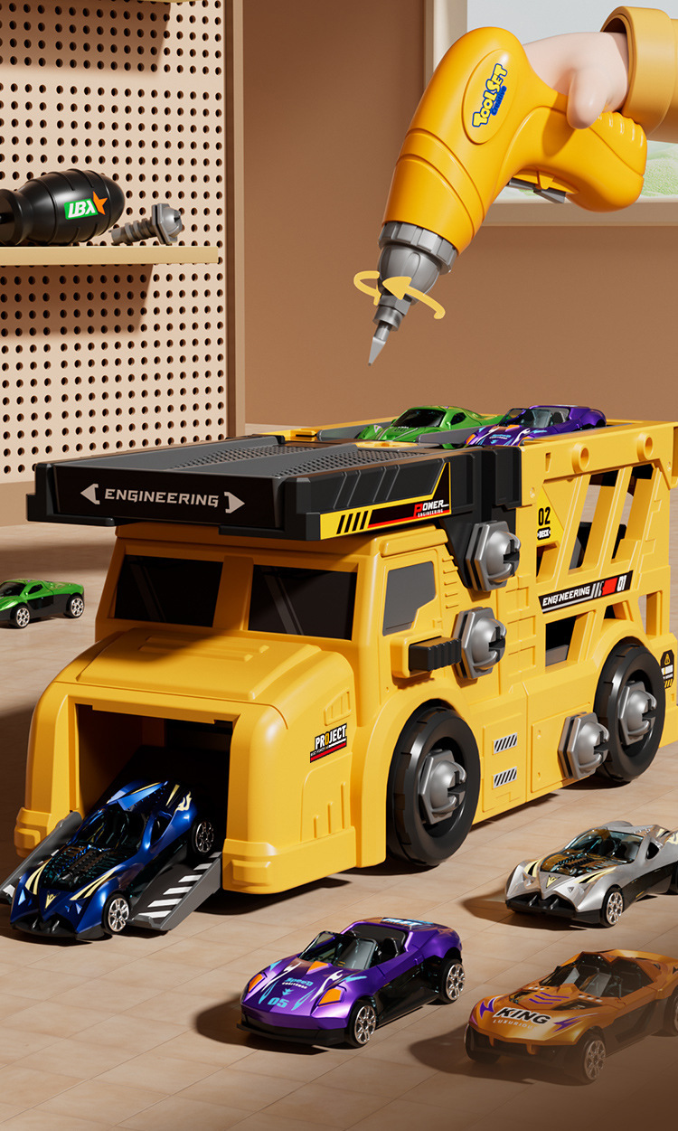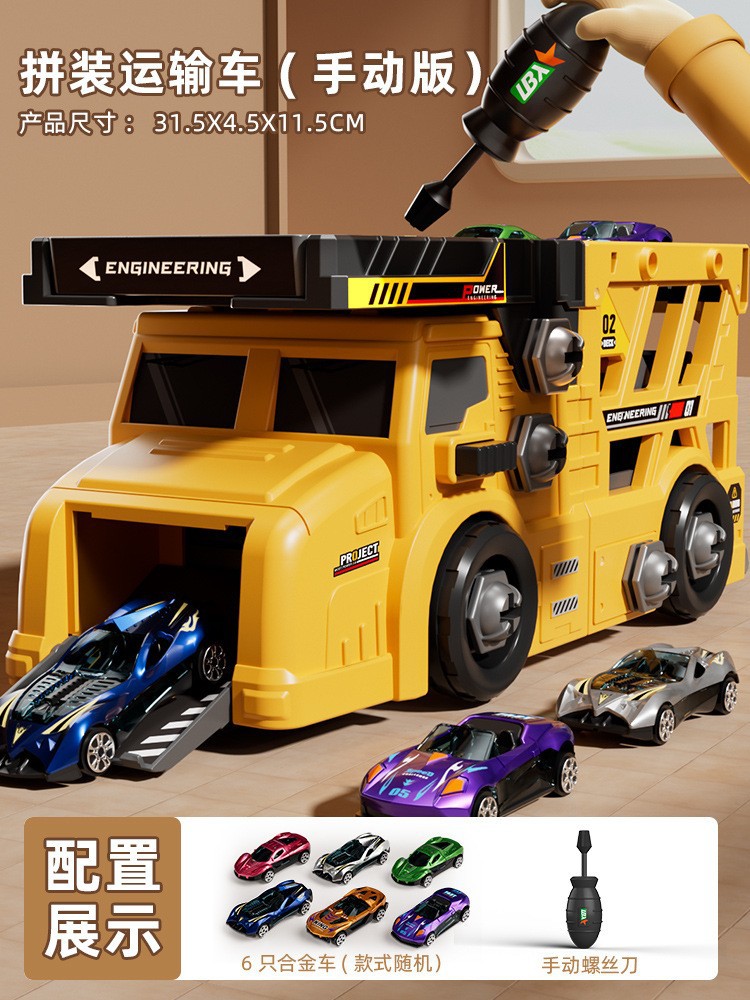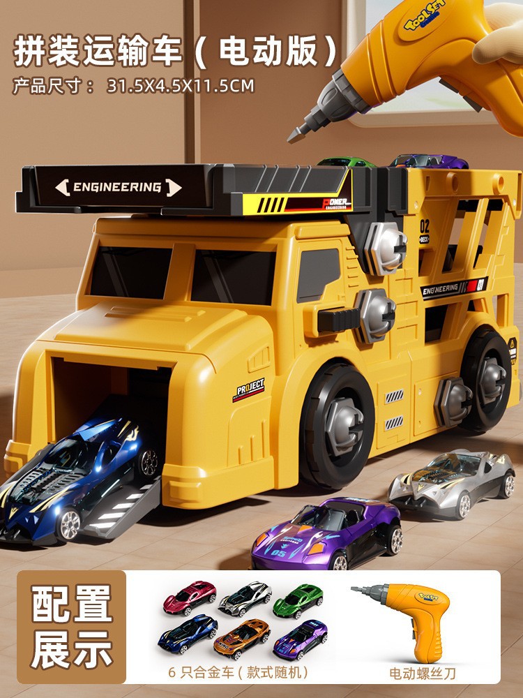 • 플랫베드 컨테이너 트럭 분해 및 조립 [무료 대형 전동 드라이버 + 합금 트럭 6대] 컬러 박스 + 통신판매 상자 900g