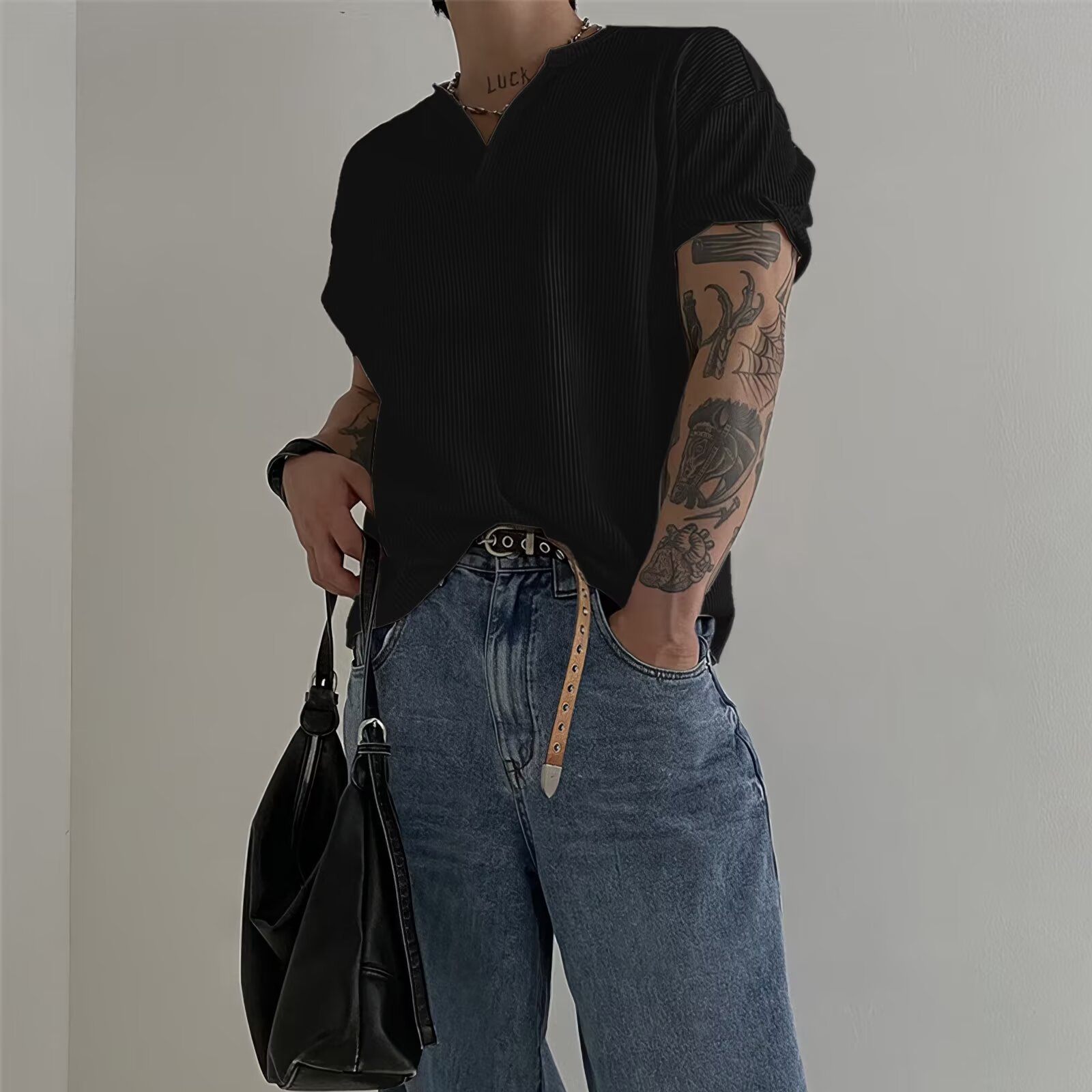 헨리 칼라 와플 반팔 티셔츠 남성 여름 아메리칸 심플 보텀 탑 가볍고 통기성이 좋은 사이드 슬릿 티셔츠