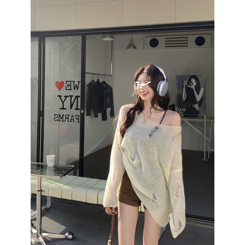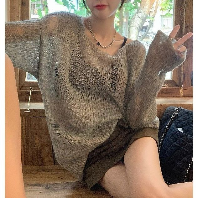 느슨한 게으른 스타일 구멍 니트 블라우스 여성의 봄과 여름 2025 얇은 레트로 그레이 에어컨 외부 탑스토어 가기