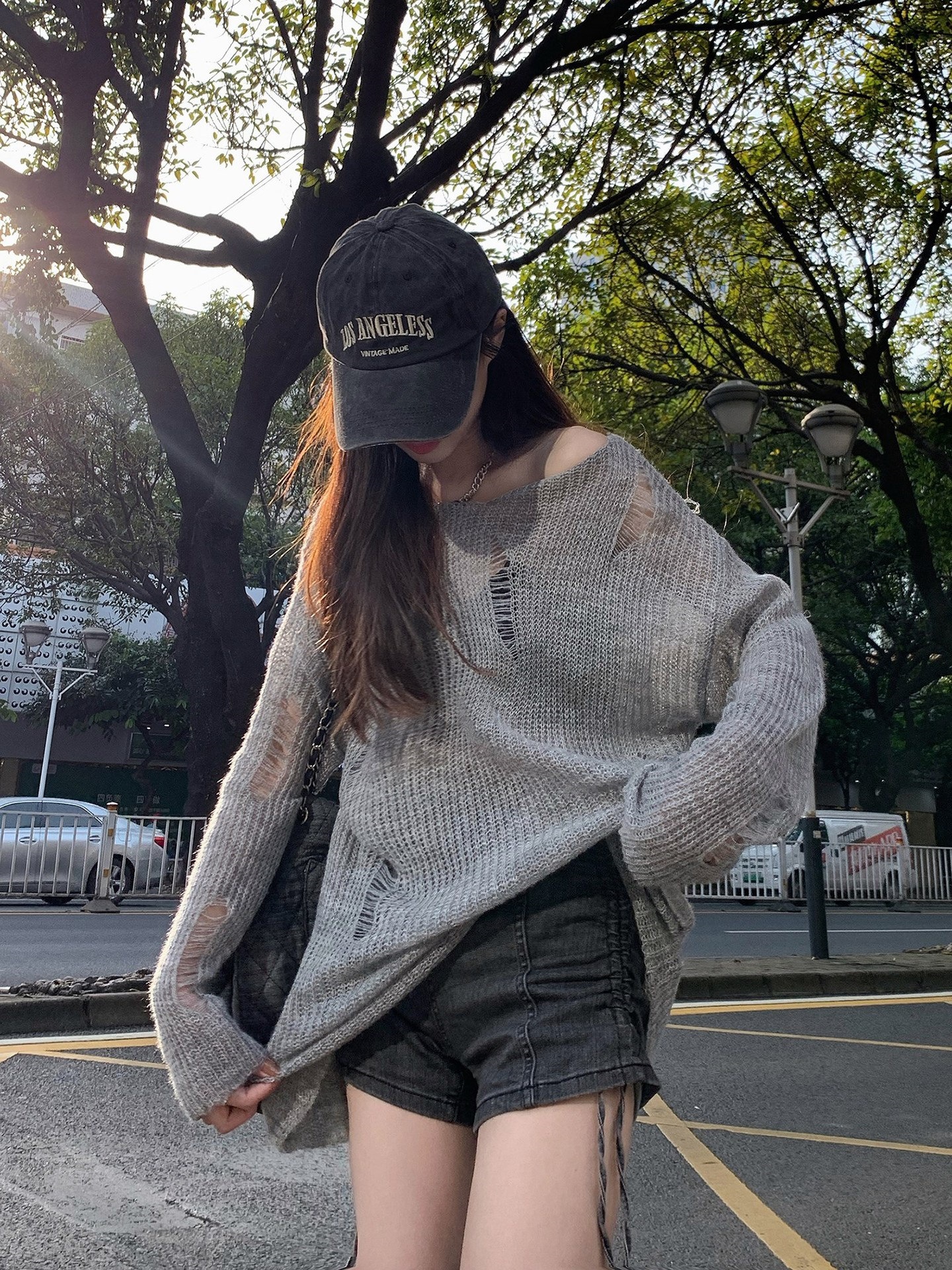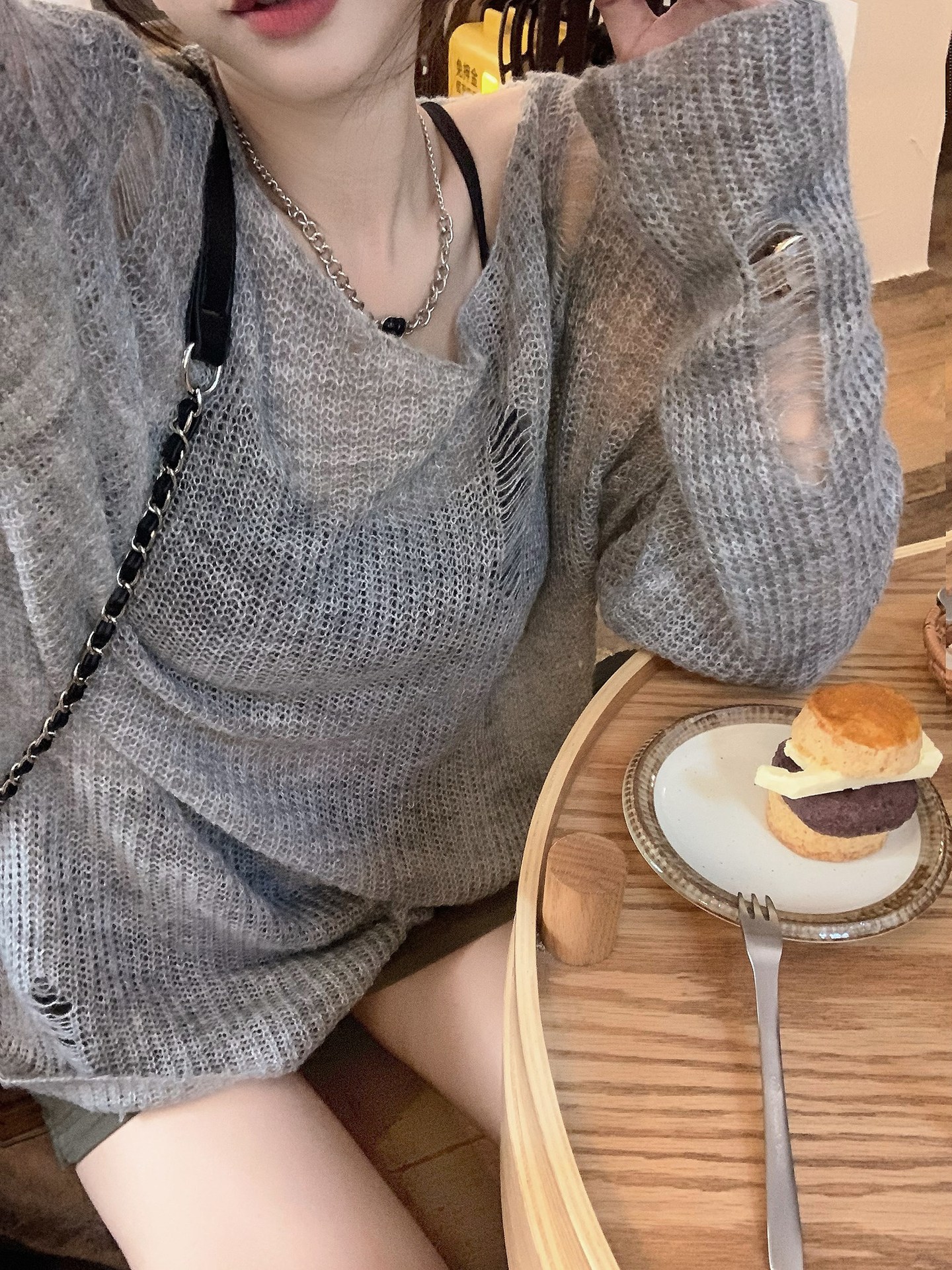 느슨한 게으른 스타일 구멍 니트 블라우스 여성의 봄과 여름 2025 얇은 레트로 그레이 에어컨 외부 탑