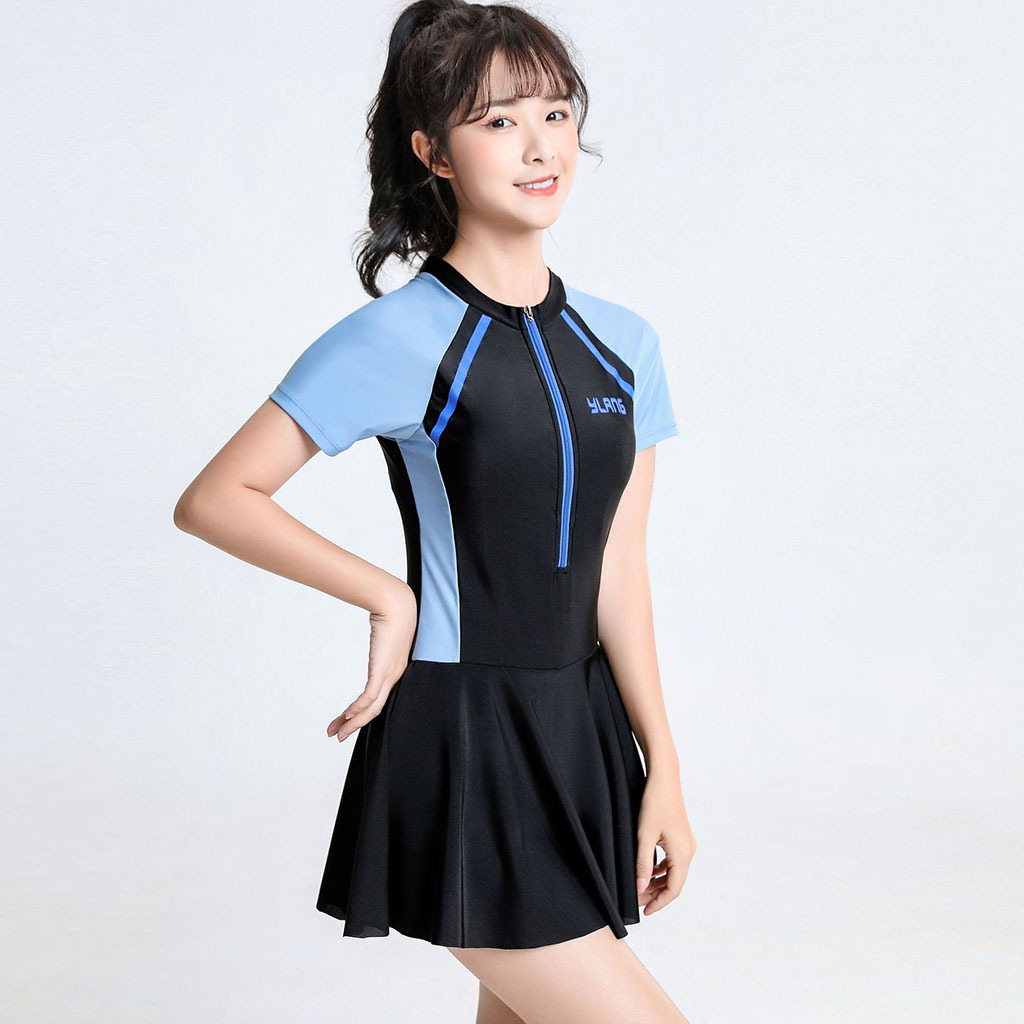 • 블랙 & 블루 원피스 슬림핏 스커트 수영복(가슴 패드 포함)