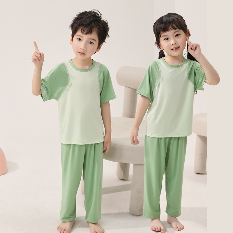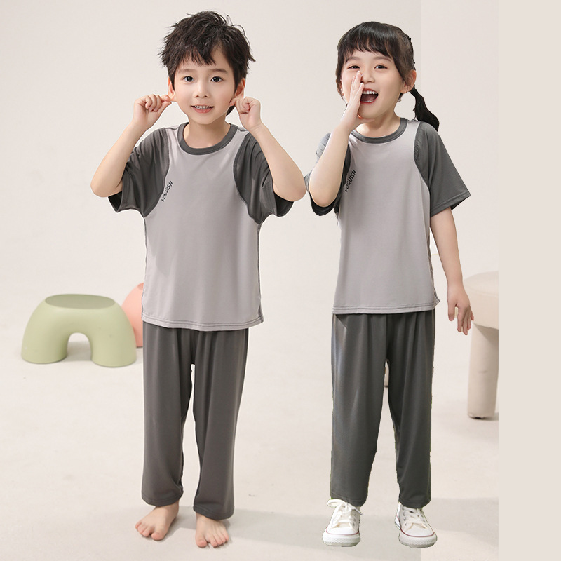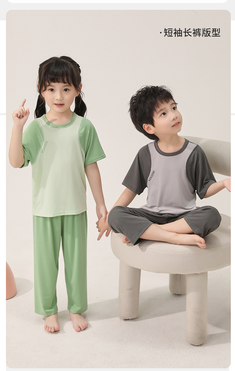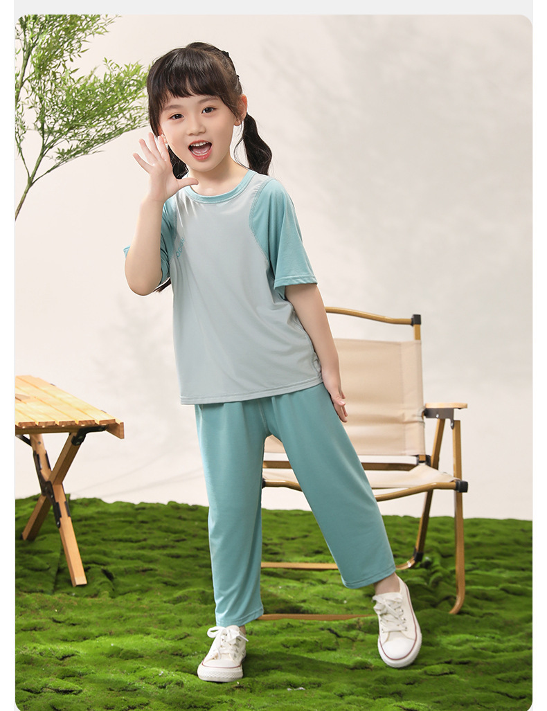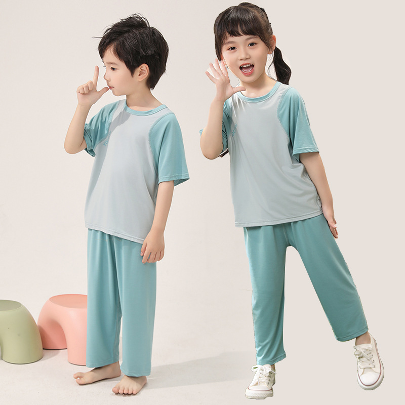 아동용 잠옷, 얇은 모달, 큰 아동복 세트, 남아용 반팔 바지, 여아용 배색 에어컨 의류, 한국스토어 가기