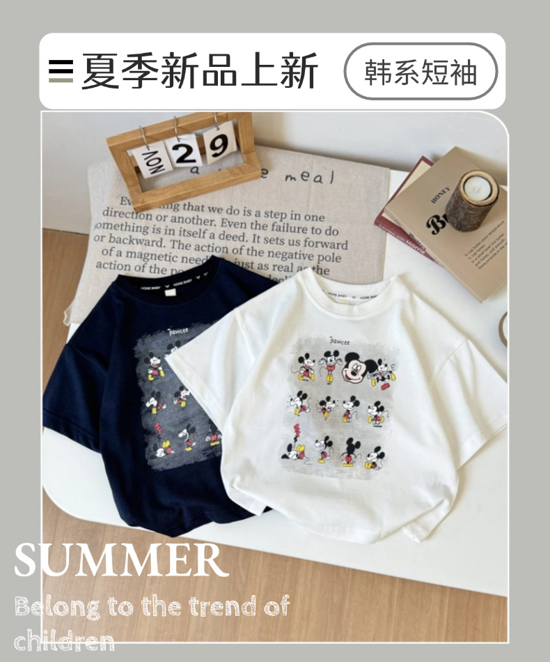 아동용 반팔 티셔츠 2025 새로운 한국 캐주얼 만화 프린트 티셔츠 중소형 아동용 루즈 라운드 넥 탑스토어 가기