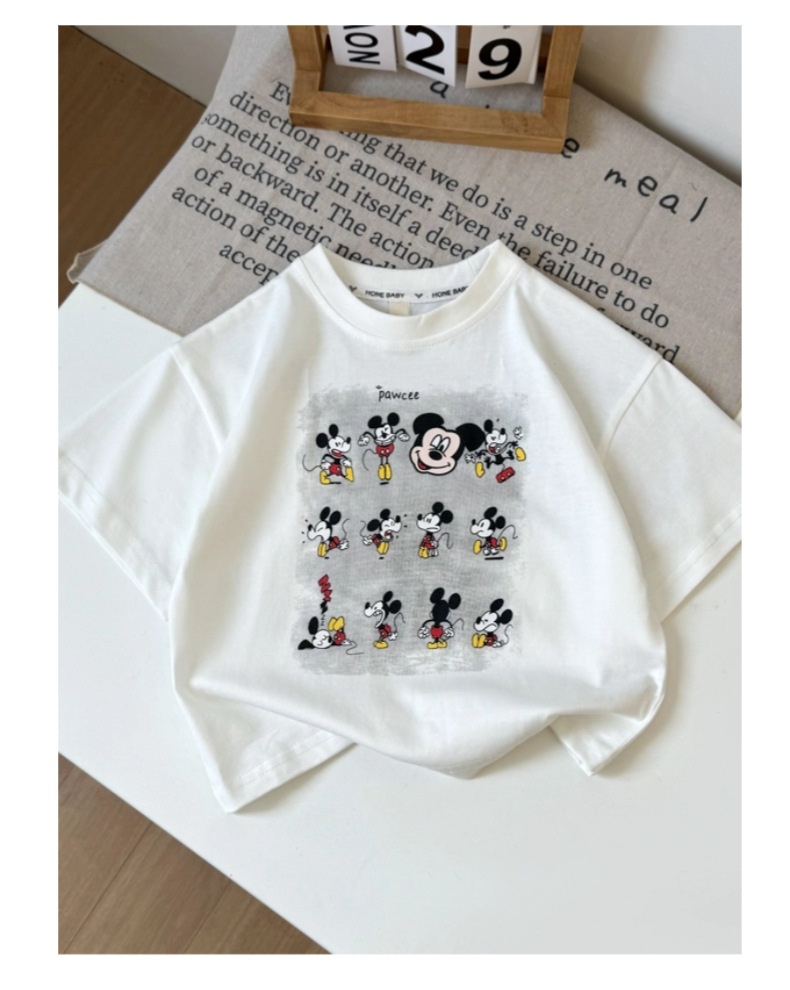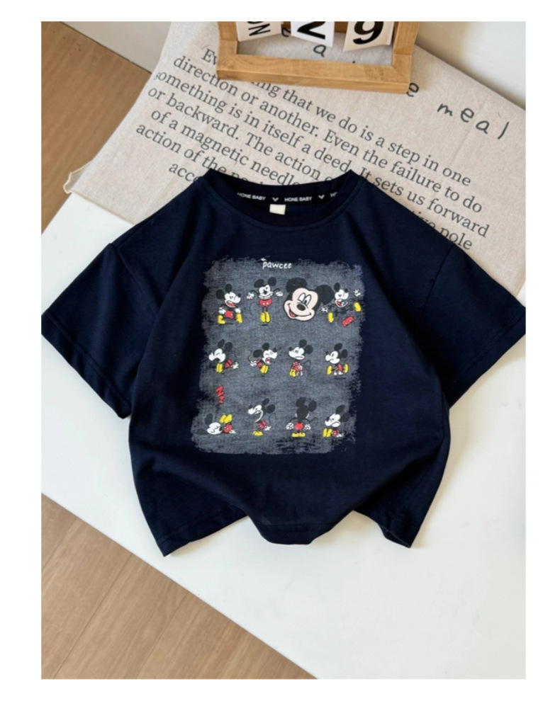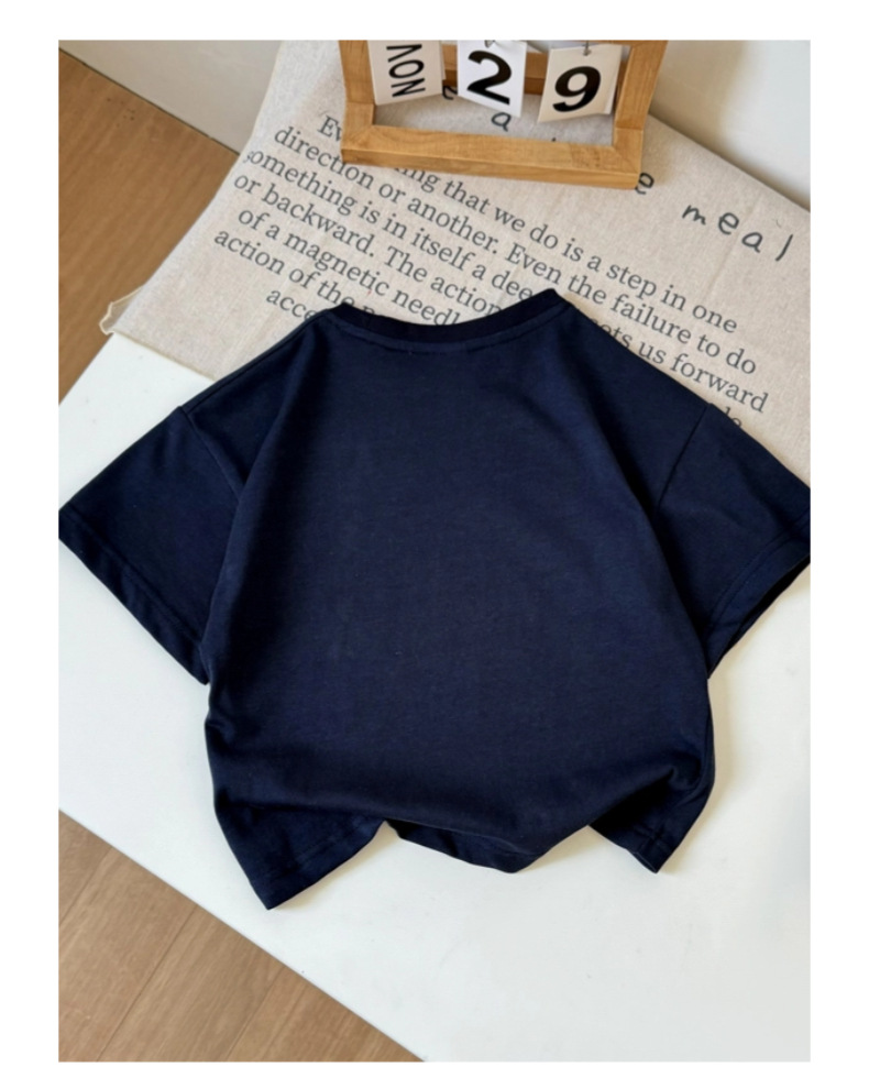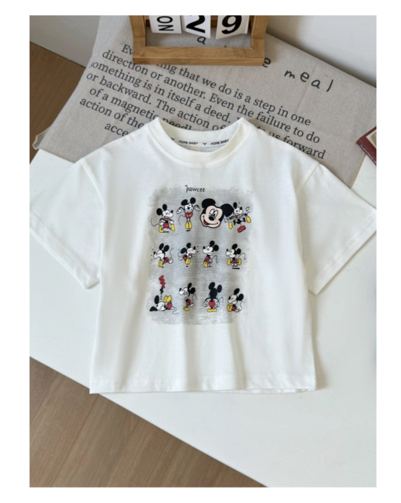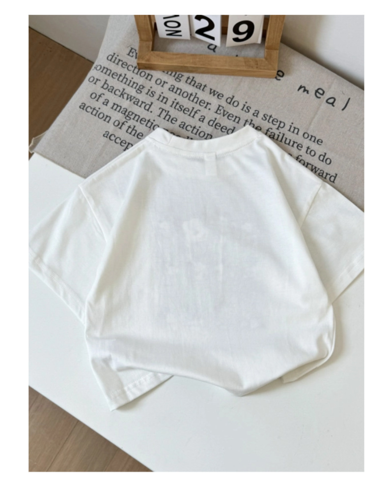 아동용 반팔 티셔츠 2025 새로운 한국 캐주얼 만화 프린트 티셔츠 중소형 아동용 루즈 라운드 넥 탑