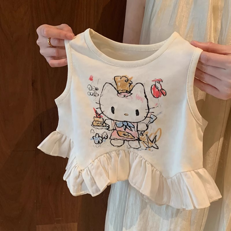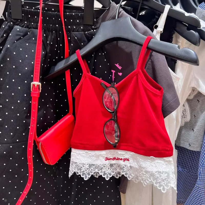 어린이 여름 조끼 티셔츠 2025 아기 소녀 새로운 대비 색상 다목적 사랑 수 놓은 민소매 라운드 넥 탑