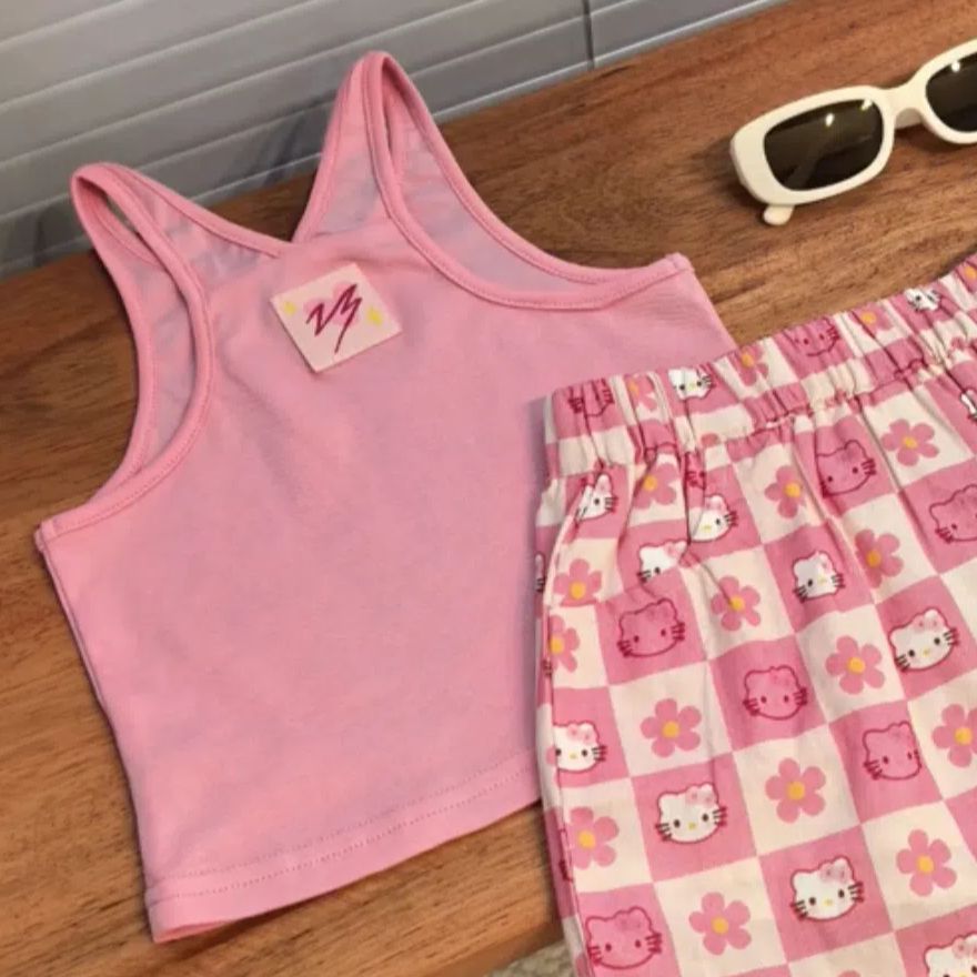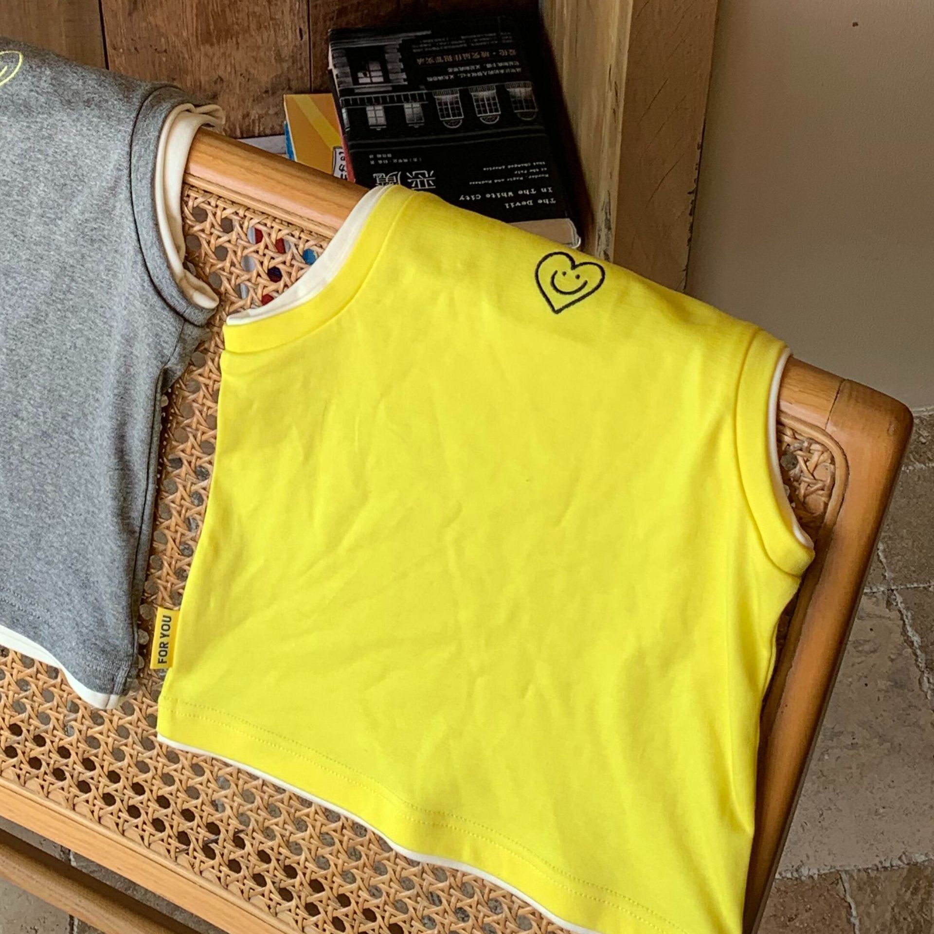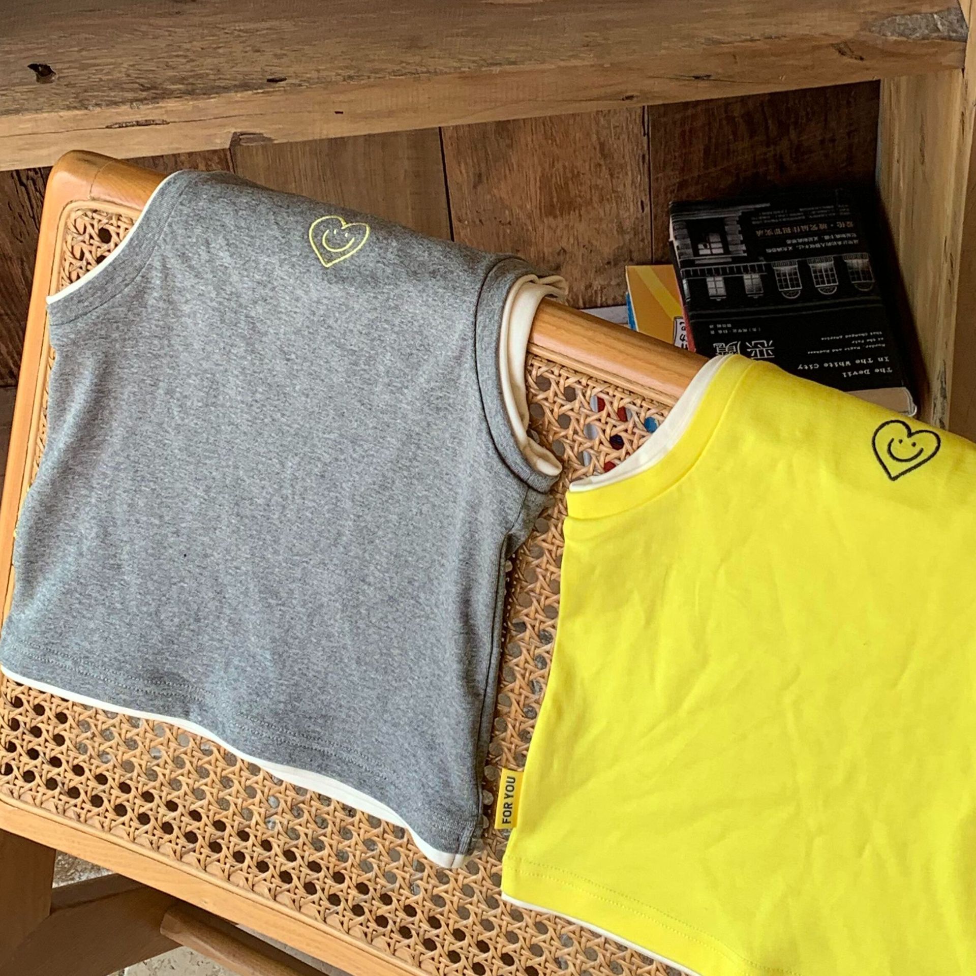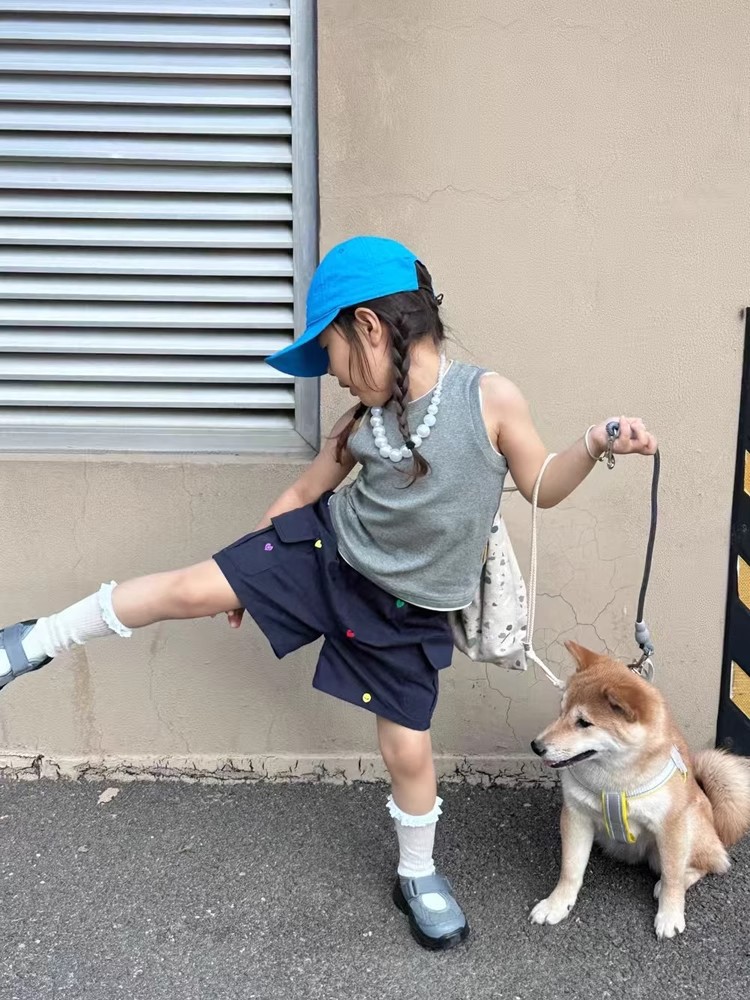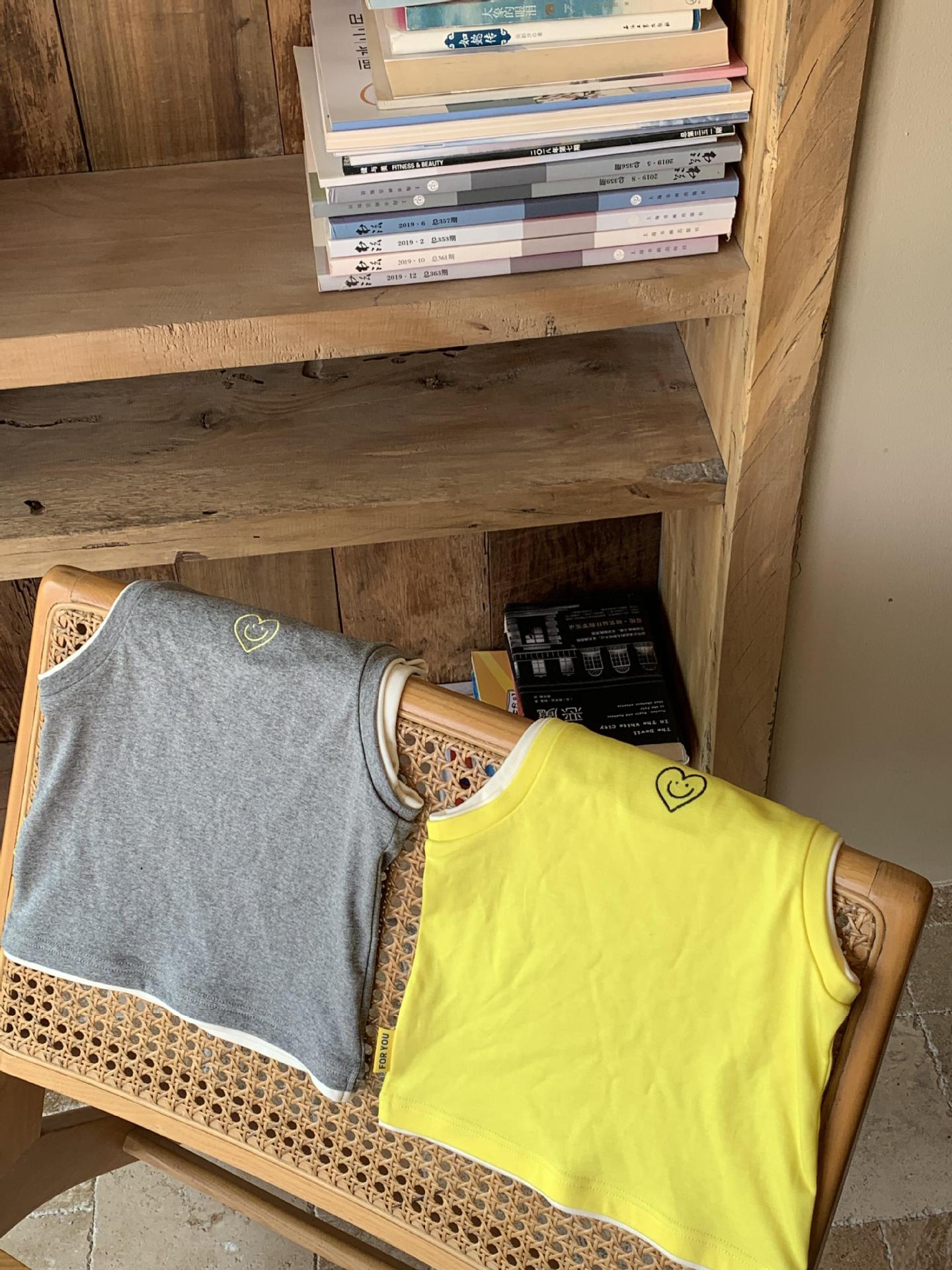 어린이 여름 조끼 티셔츠 2025 아기 소녀 새로운 대비 색상 다목적 사랑 수 놓은 민소매 라운드 넥 탑스토어 가기