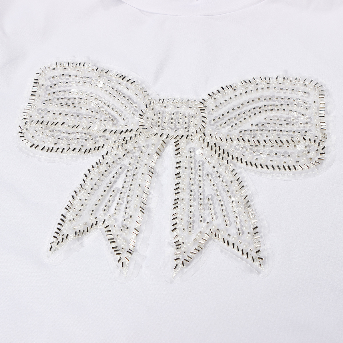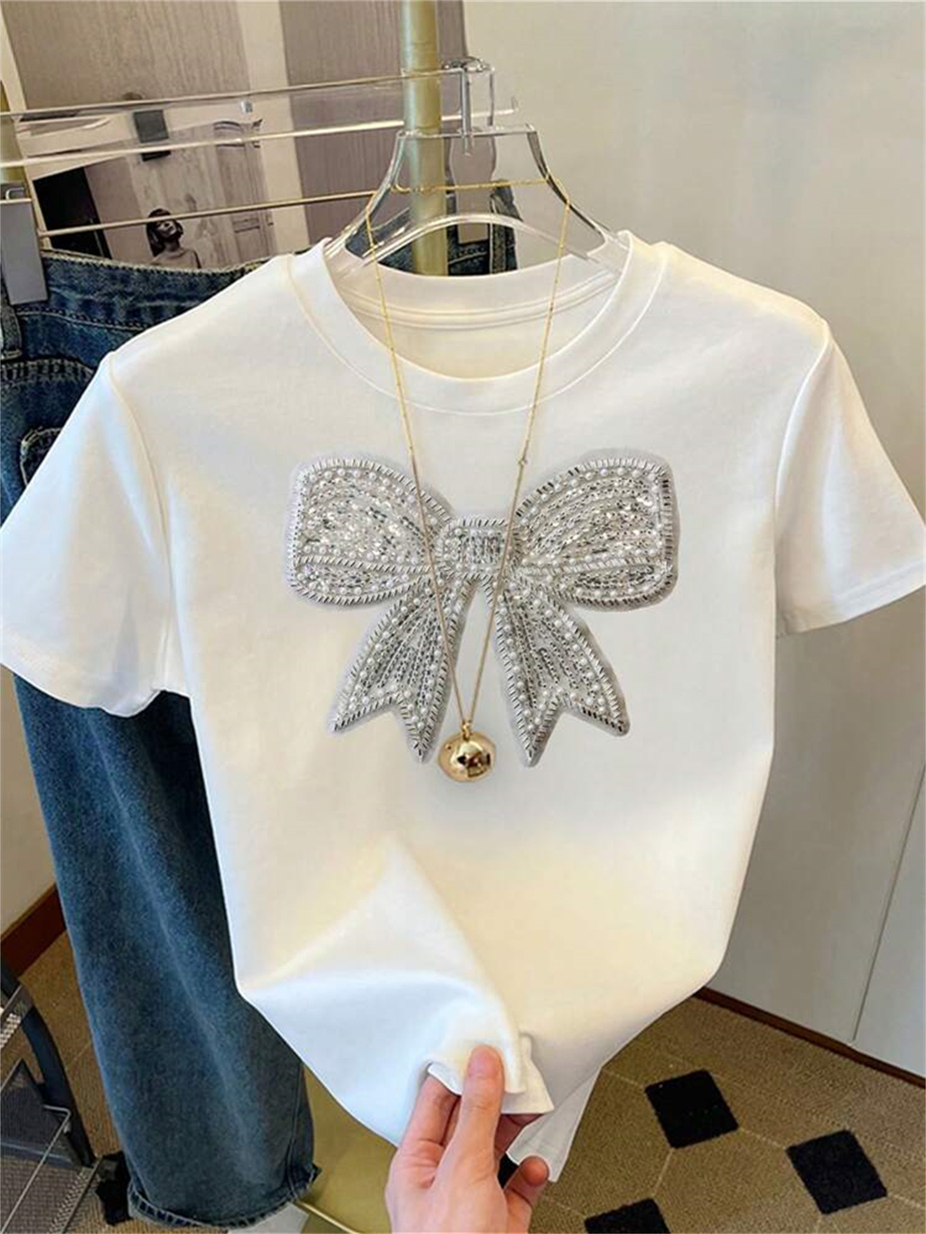 유럽과 미국의 새로운 여름 여성 의류 국경 간 대외 무역 패션 캐주얼 통근 느슨한 라운드 넥 보우 프린트 티셔츠 짧은스토어 가기