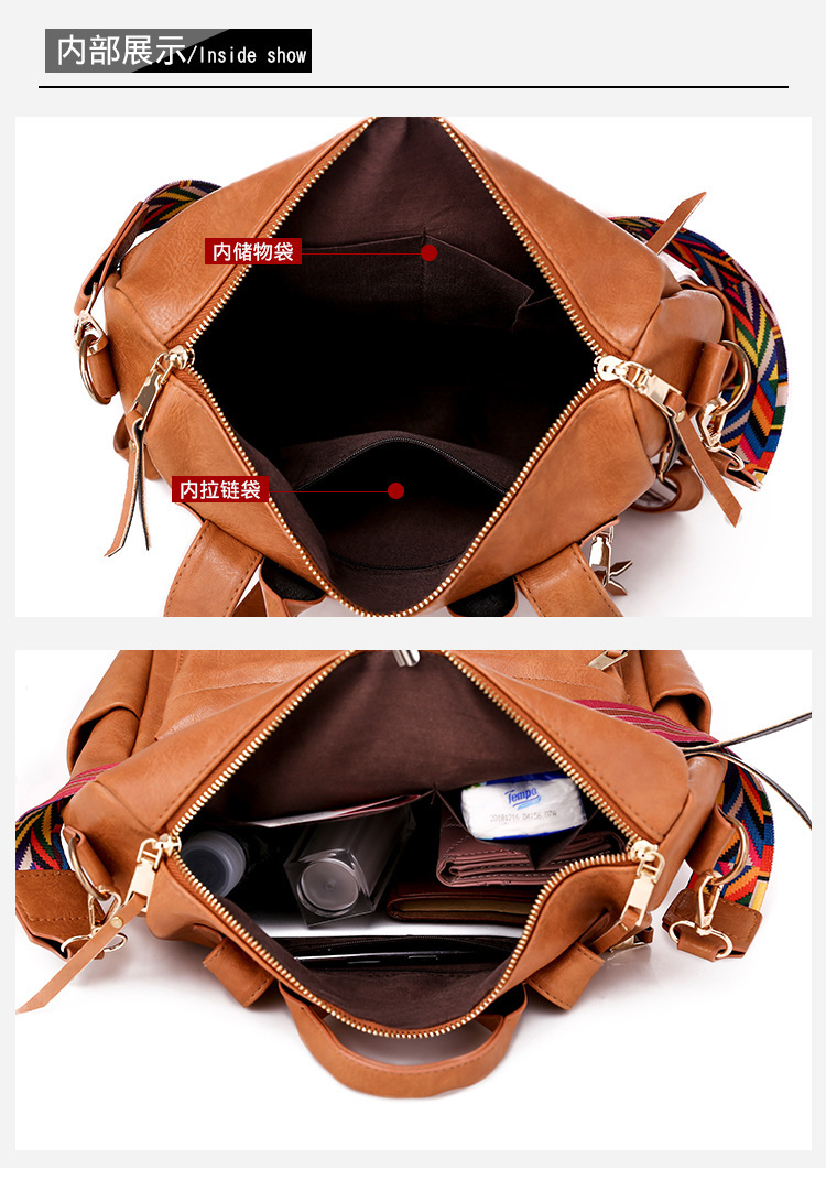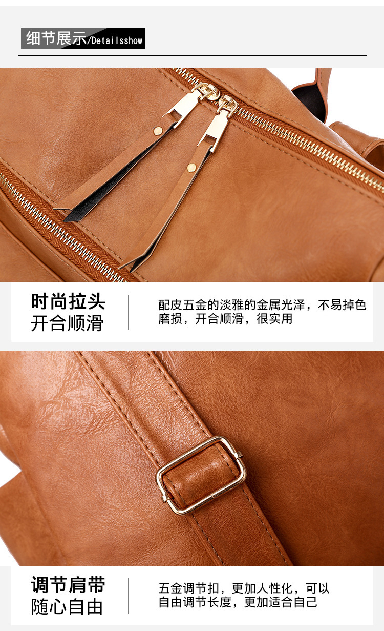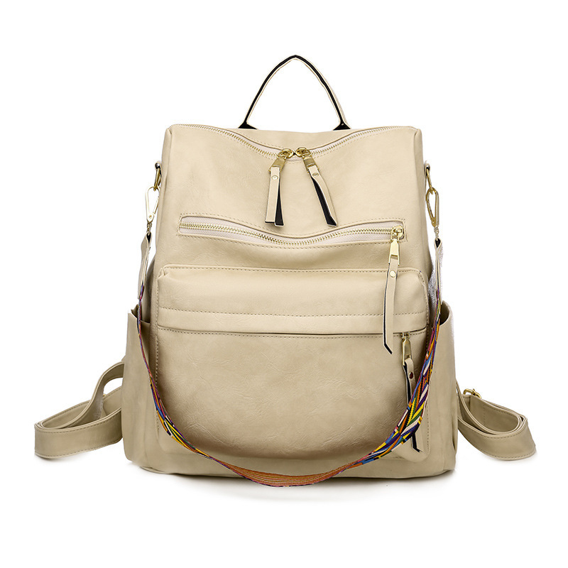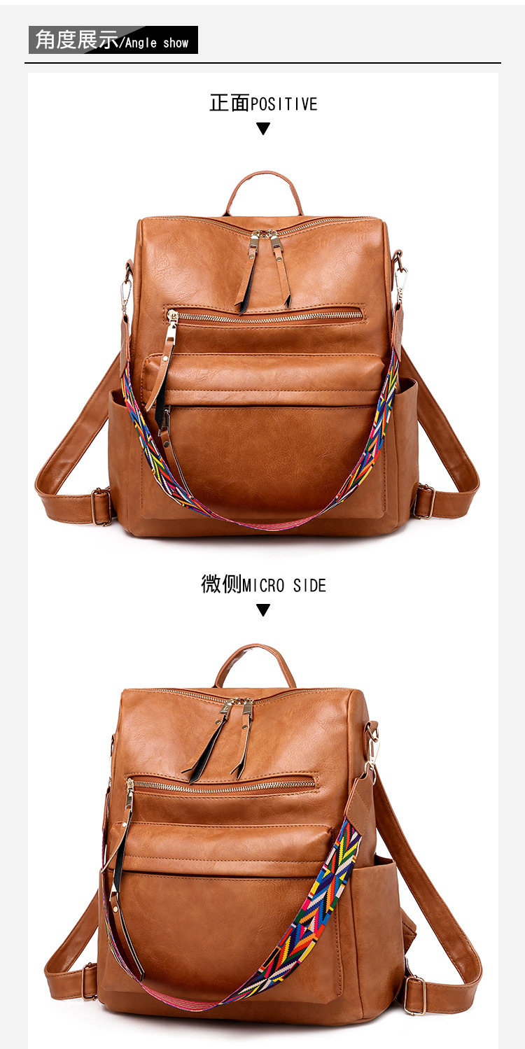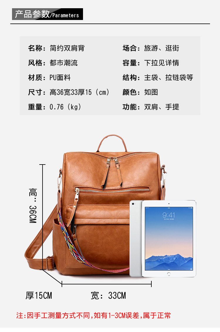 【产品特色】跨境电商亚马逊经典女士双肩包,原料供应商定制面料,耐刮度好,颜色更有层次质感;全身使用挂度浅金色加精加重五金配件,搭配七彩条纹定制织带,适配多种使用场景。