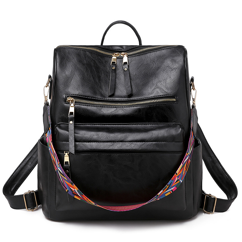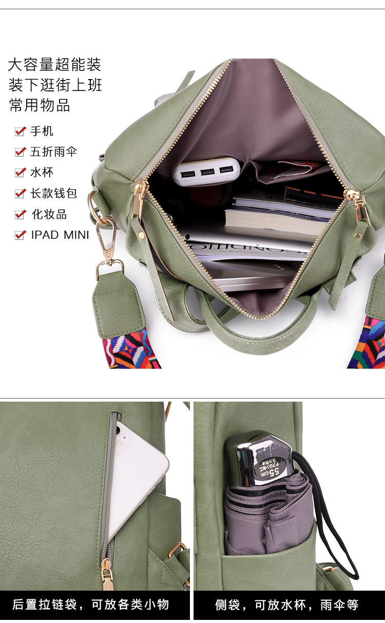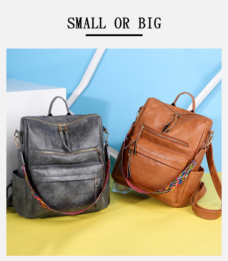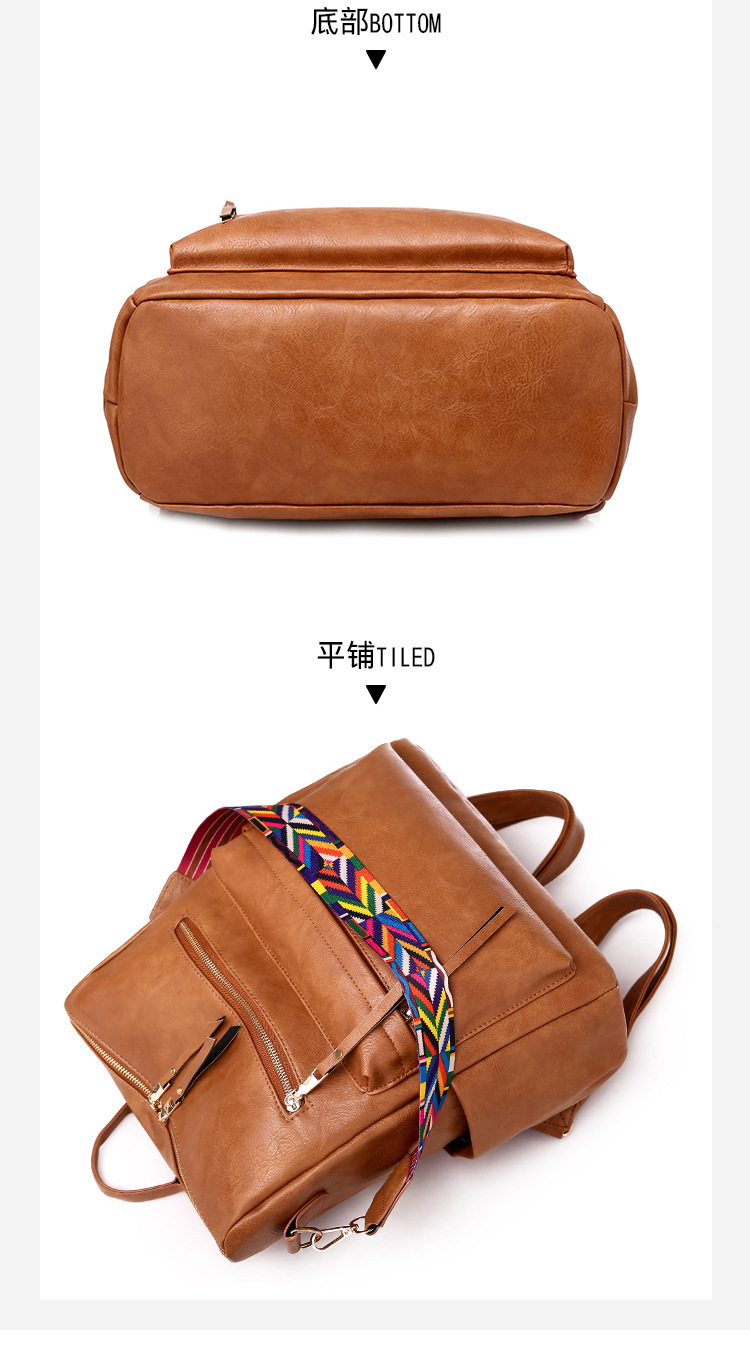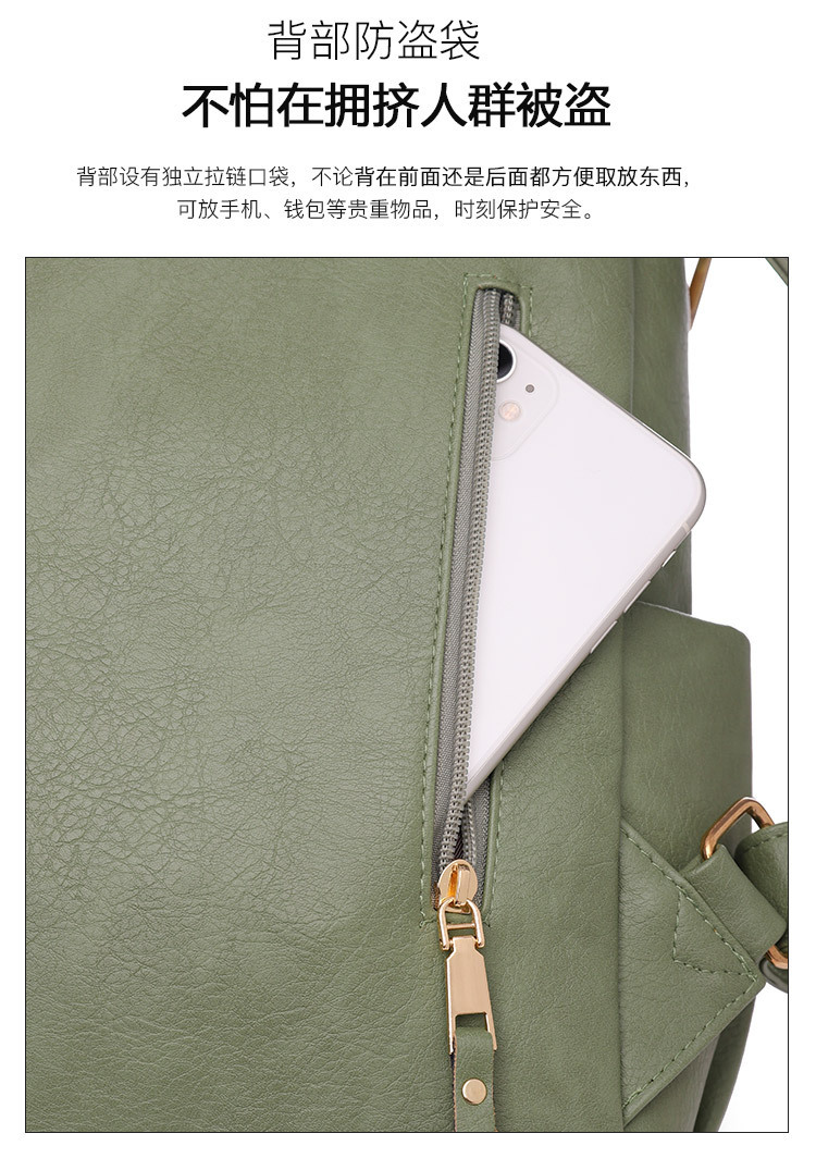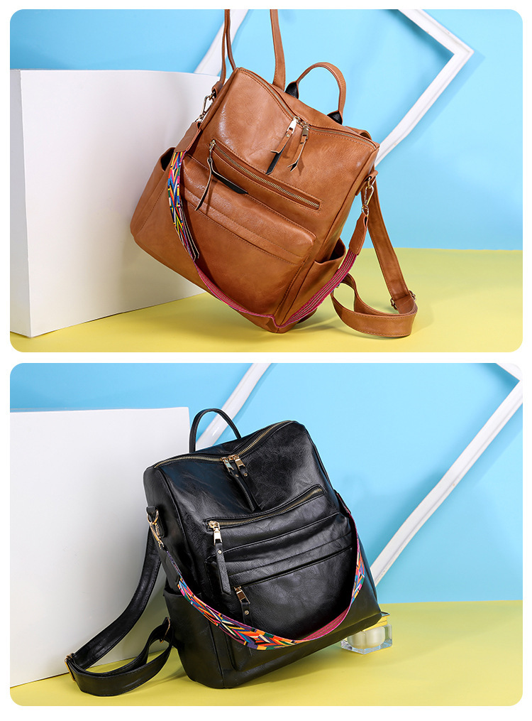 【产品特色】跨境电商亚马逊经典女士双肩包,原料供应商定制面料,耐刮度好,颜色更有层次质感;全身使用挂度浅金色加精加重五金配件,搭配七彩条纹定制织带,适配多种使用场景。