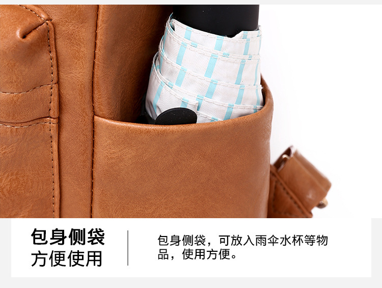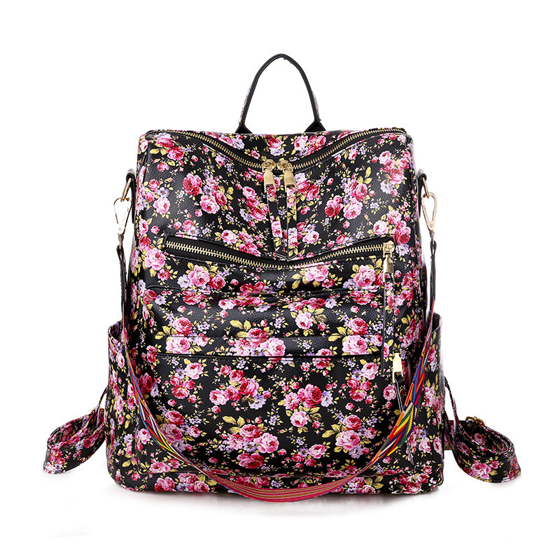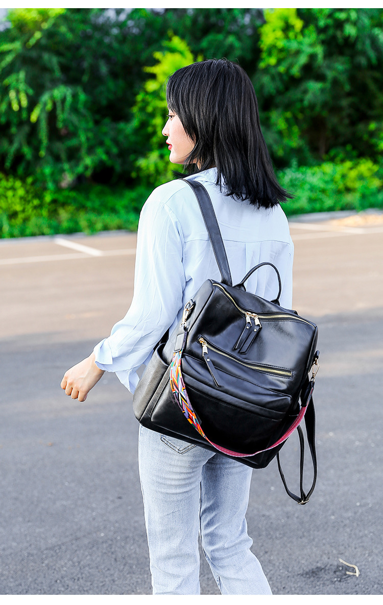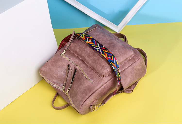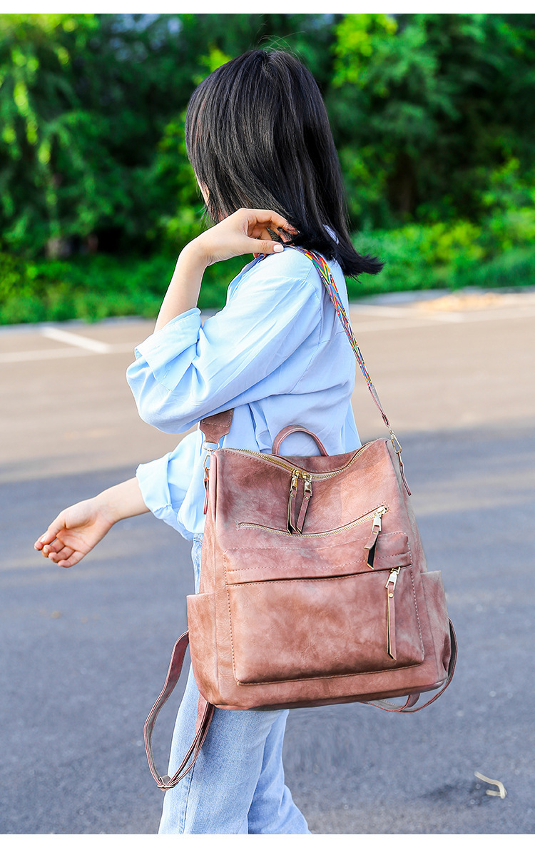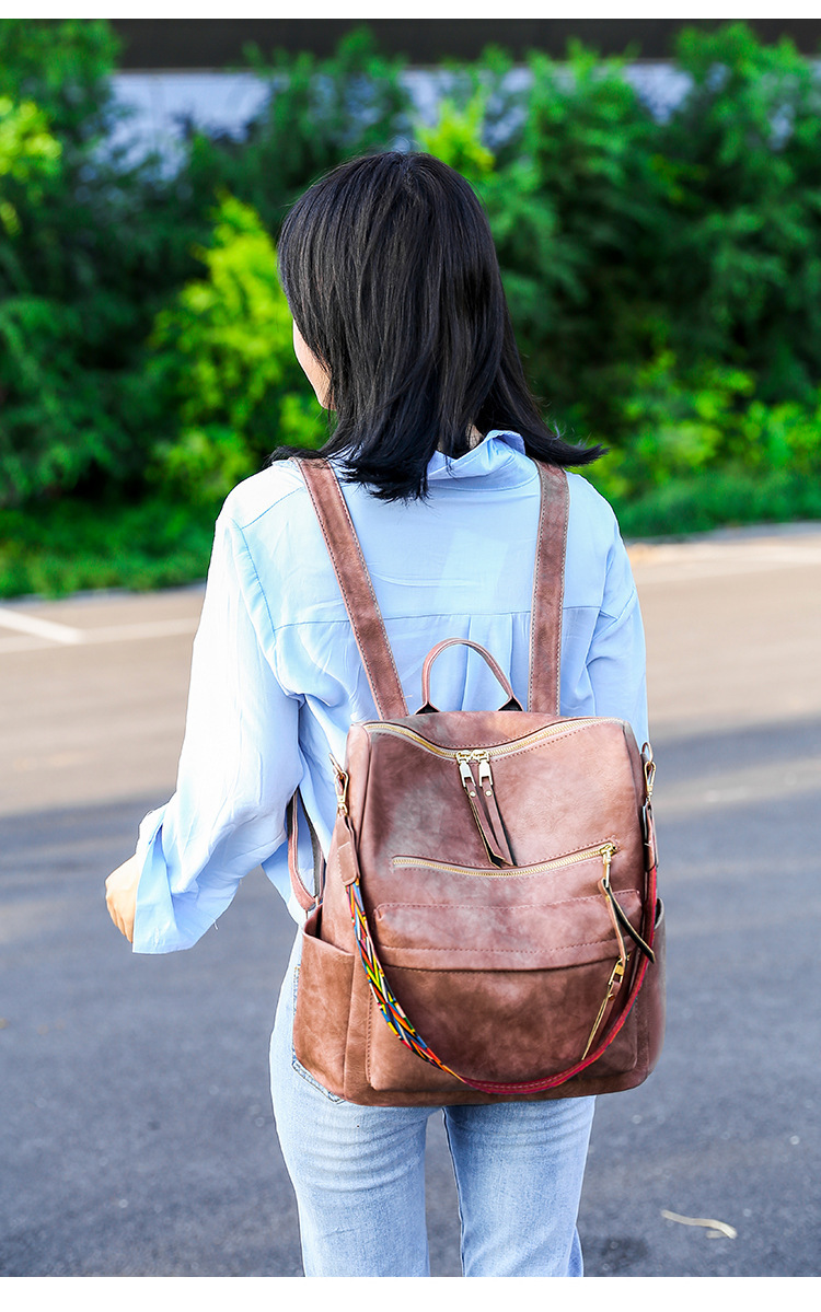 【产品特色】跨境电商亚马逊经典女士双肩包,原料供应商定制面料,耐刮度好,颜色更有层次质感;全身使用挂度浅金色加精加重五金配件,搭配七彩条纹定制织带,适配多种使用场景。
