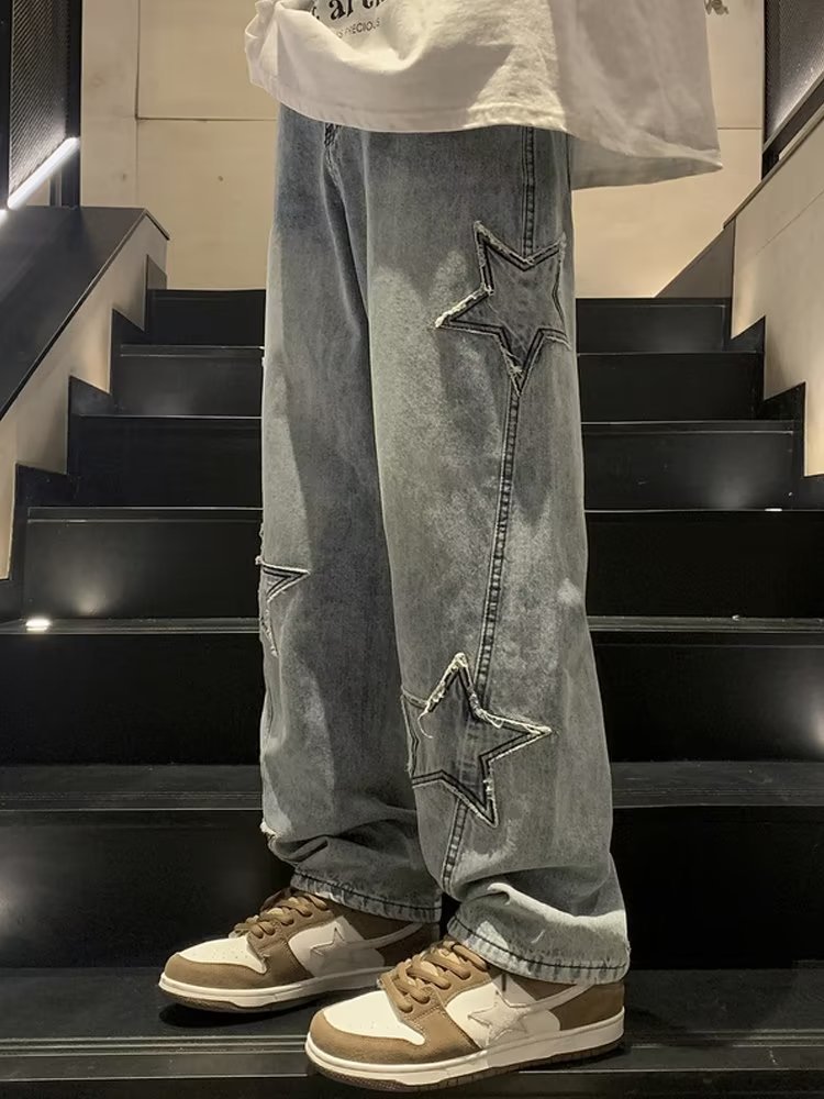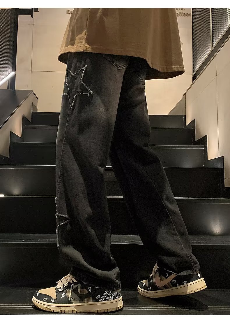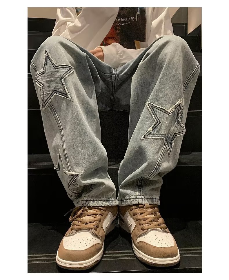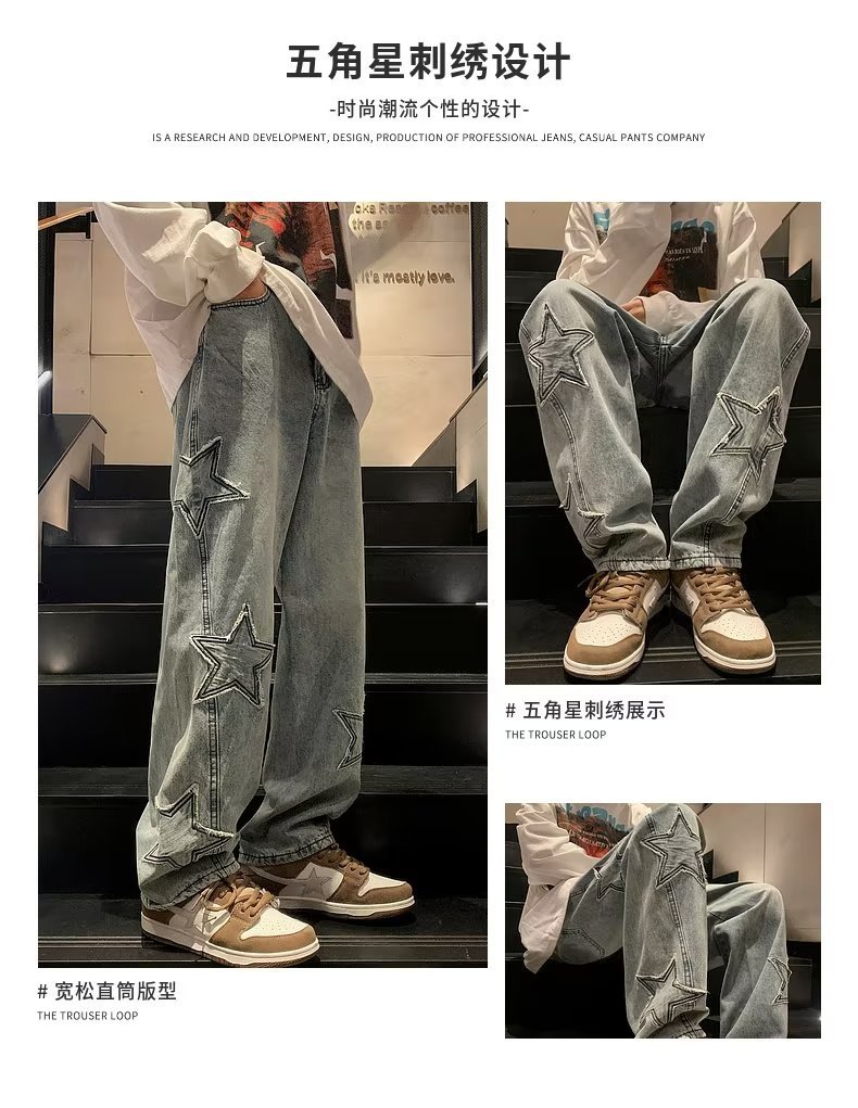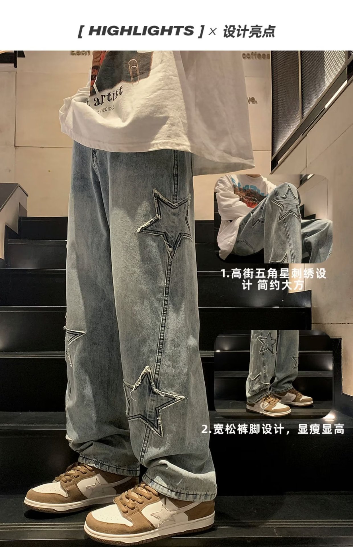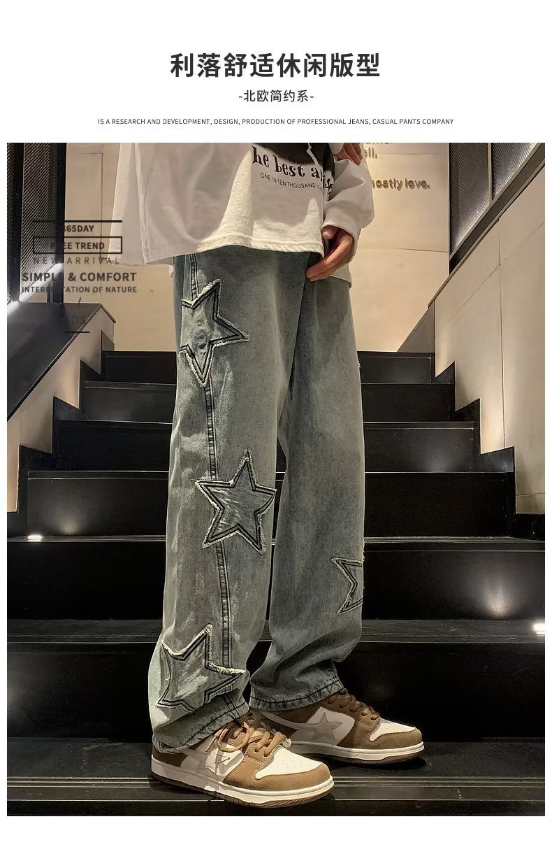 펜타그램 패치 청바지 남성용 아메리칸 레트로 트렌디 브랜드 하이 스트리트 바이브 워싱 루즈 스트레이트 와이드 레그 팬츠