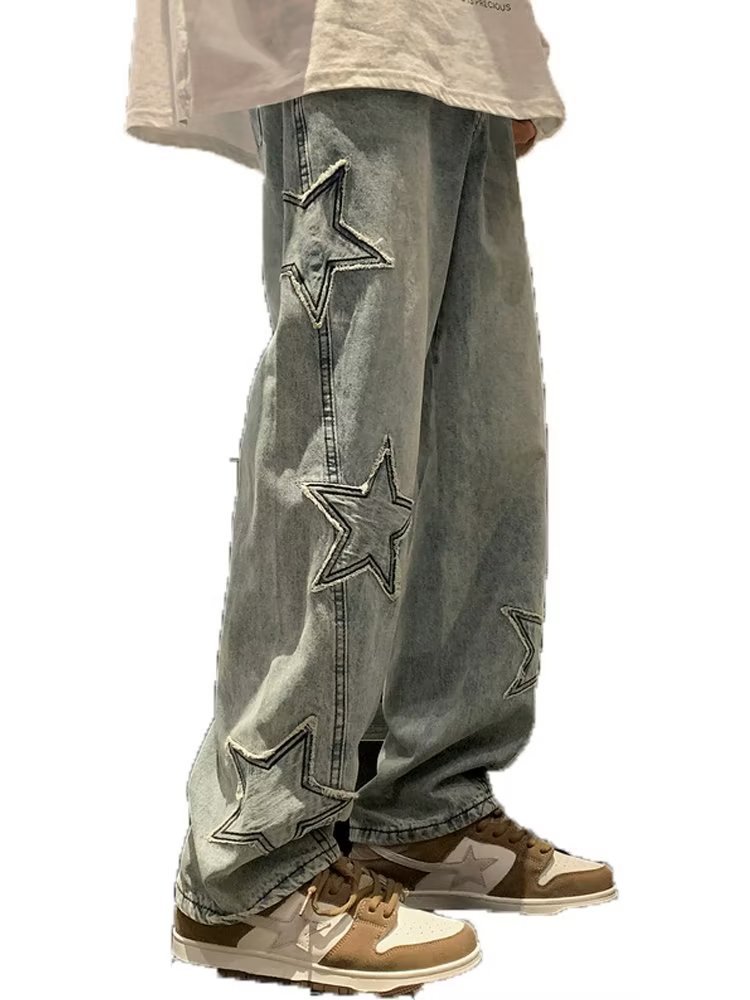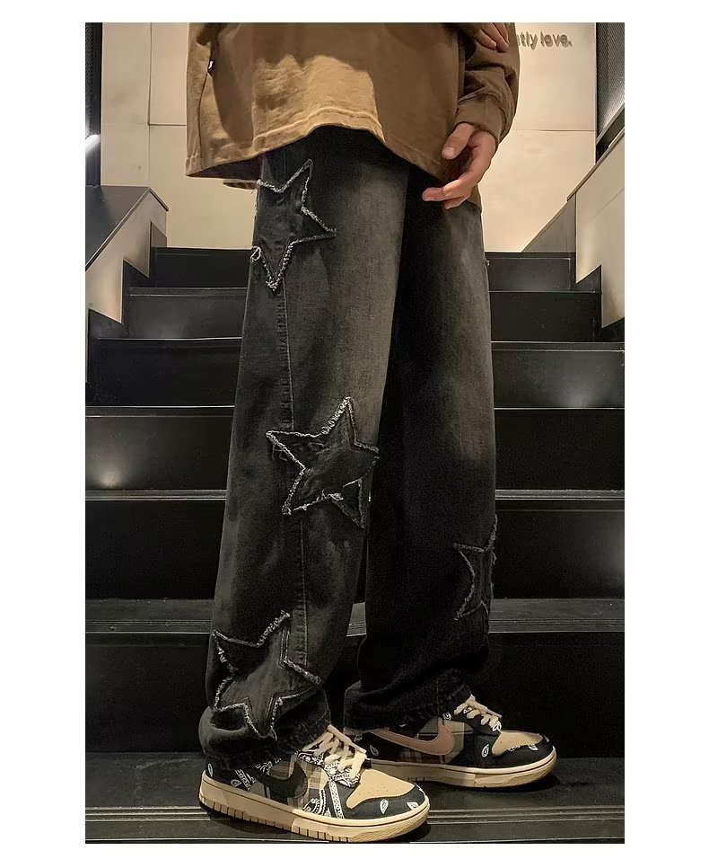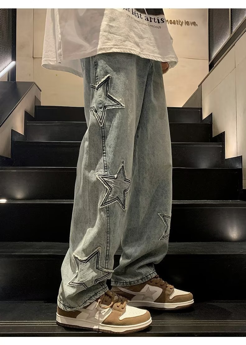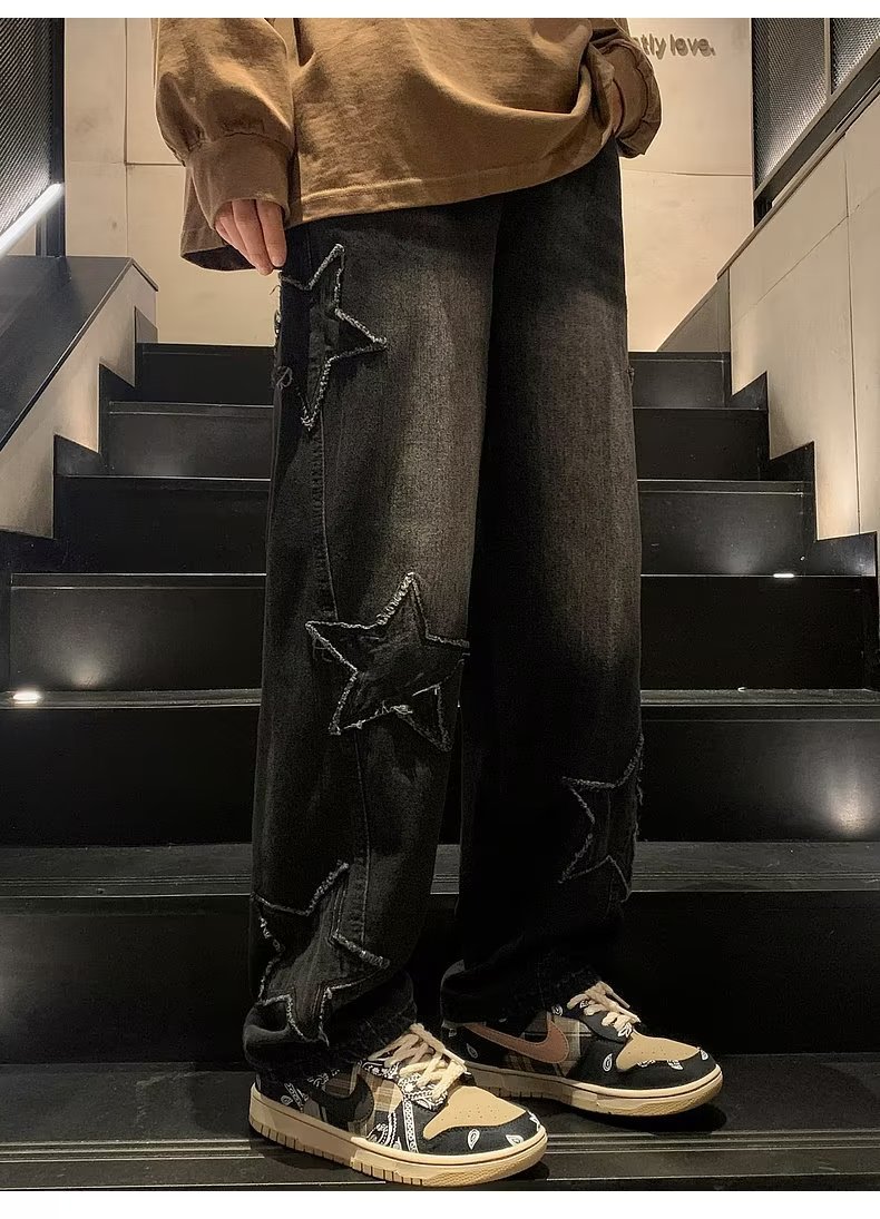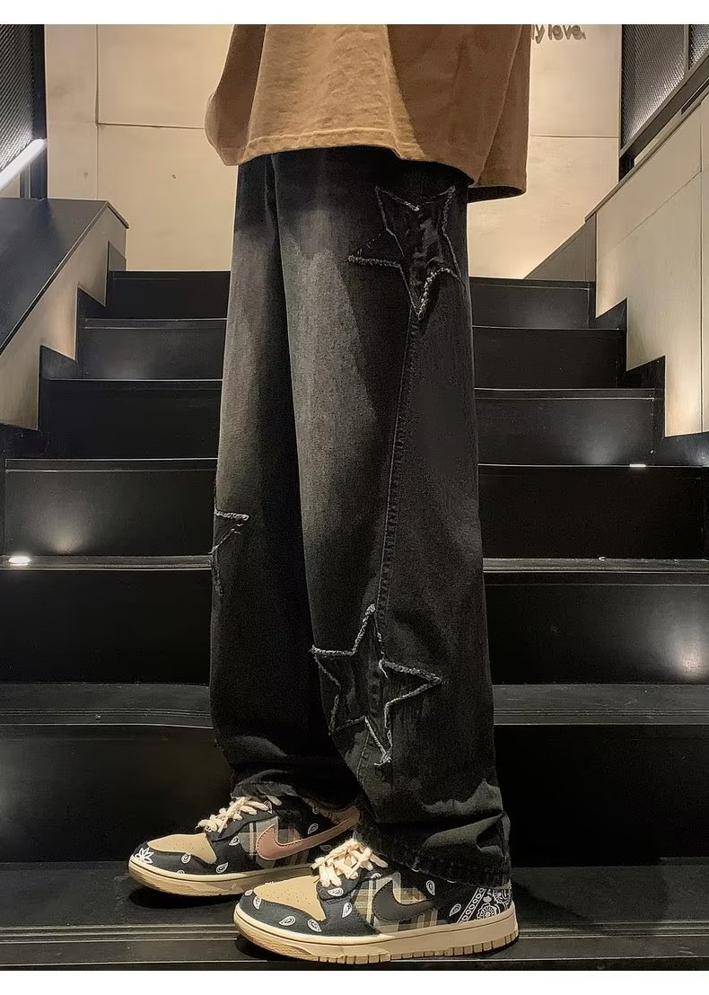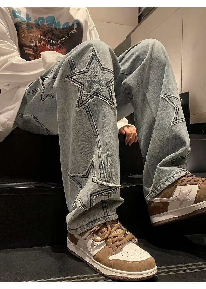 펜타그램 패치 청바지 남성용 아메리칸 레트로 트렌디 브랜드 하이 스트리트 바이브 워싱 루즈 스트레이트 와이드 레그 팬츠