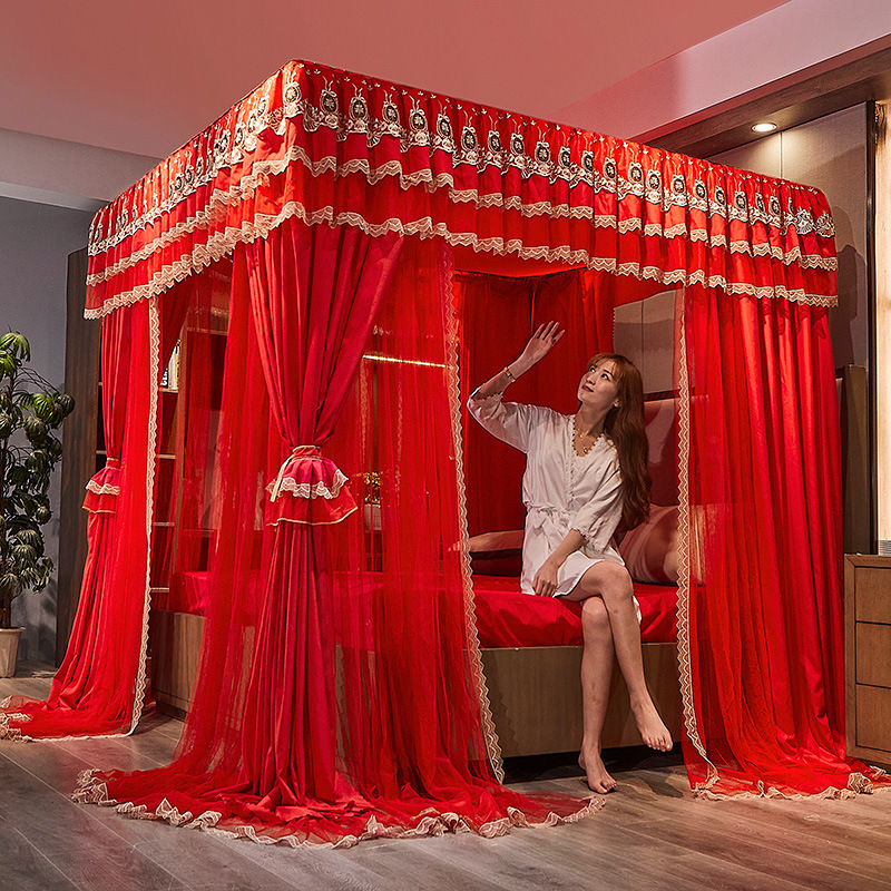 대형 빨간색 모기장, 가정용 차광 바닥형 이중 레이어 두꺼운 침대 커튼 스타일, 유럽식 이중 트랙 브래킷, 3도어, 모기 차단 기능 강화