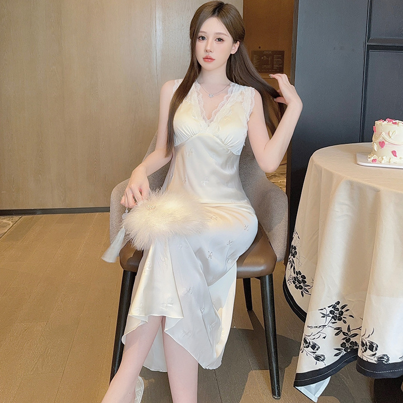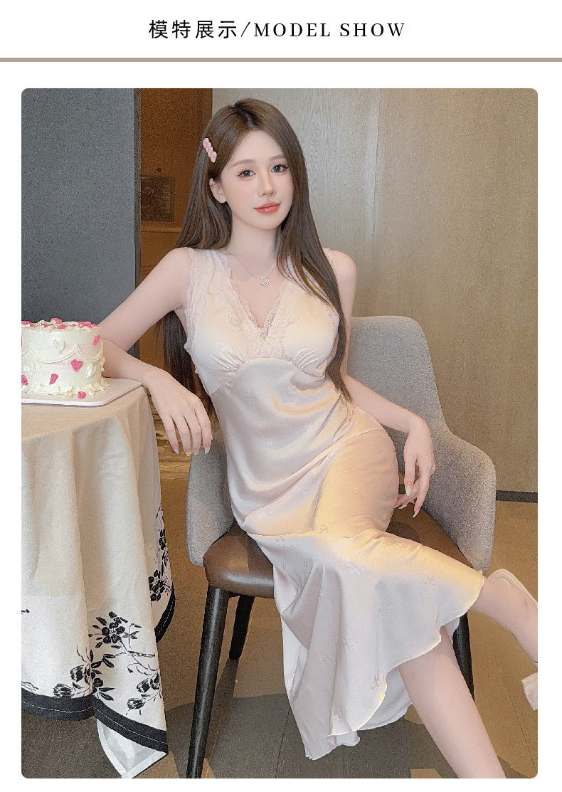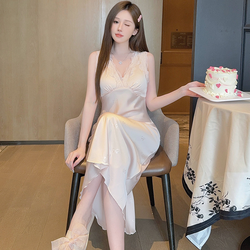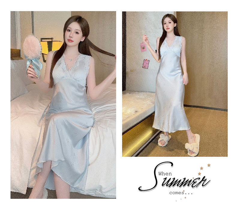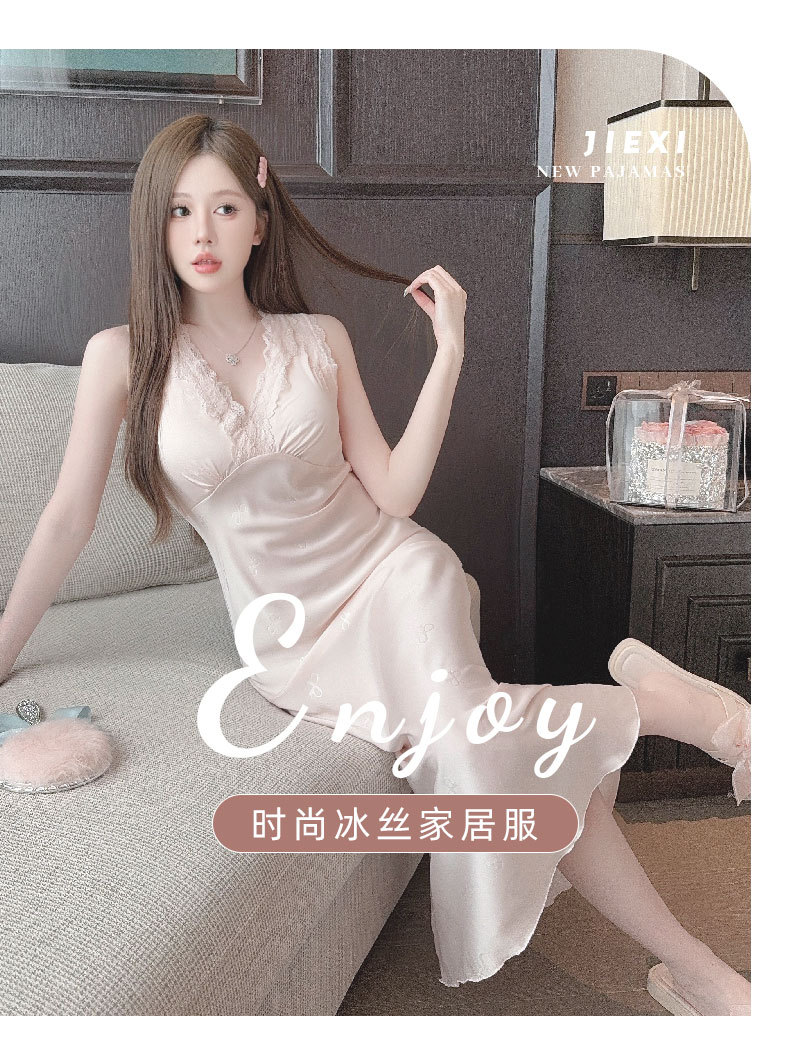 여름용 섹시한 잠옷, 아이스 실크 얇은 고급 프린트 롱 드레스, 가슴 패드 포함, 봄 가을용 큰 사이즈, 슬림한 홈웨어스토어 가기