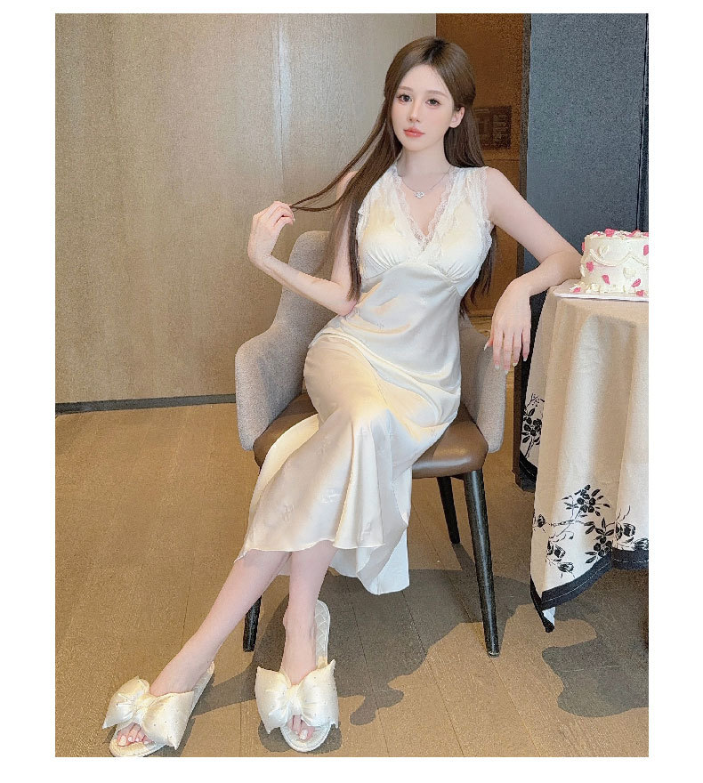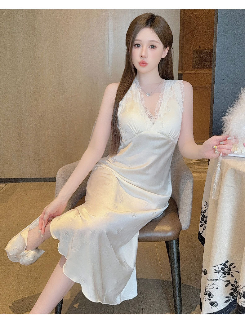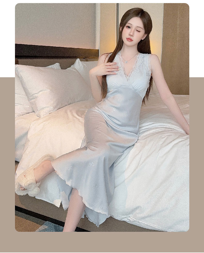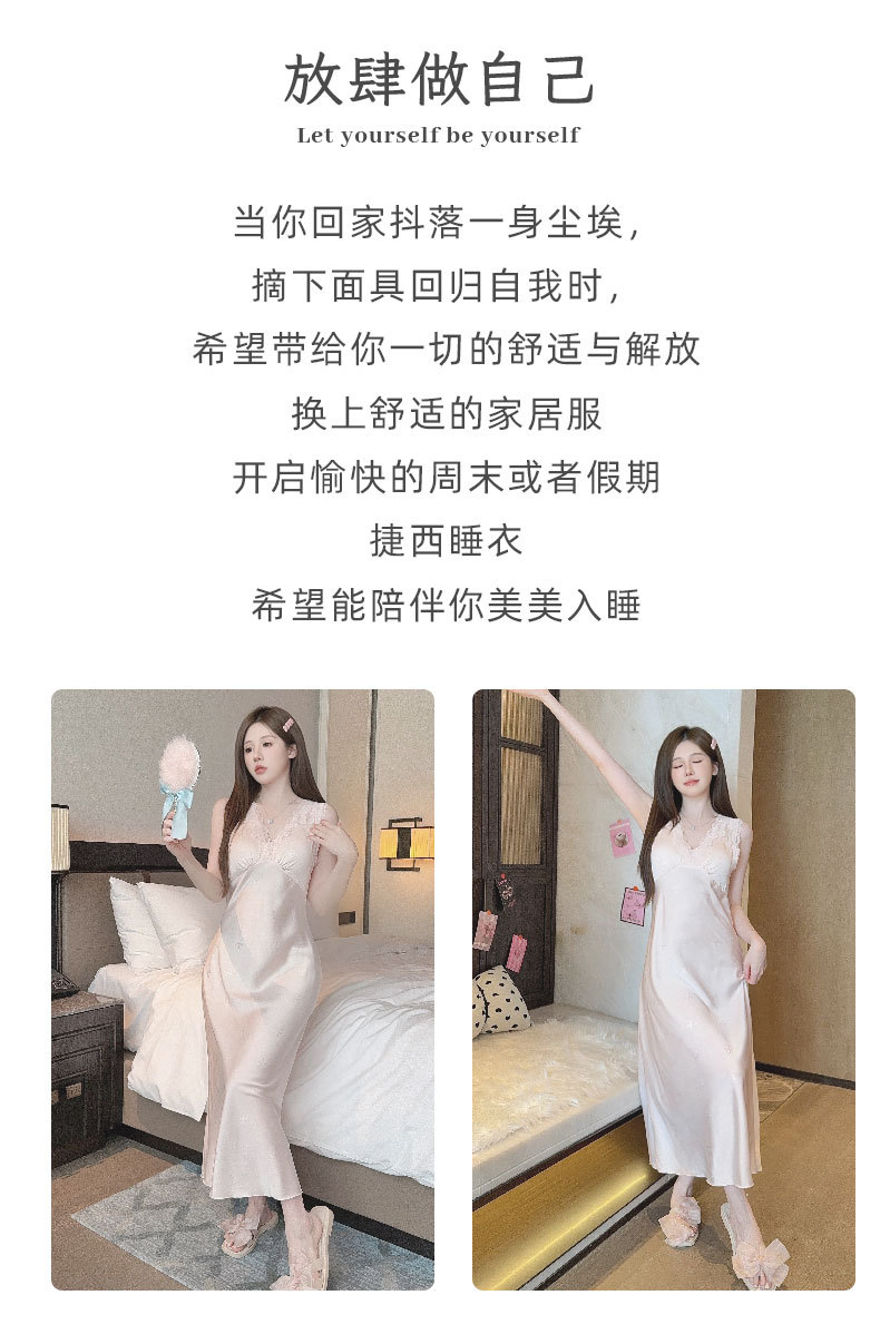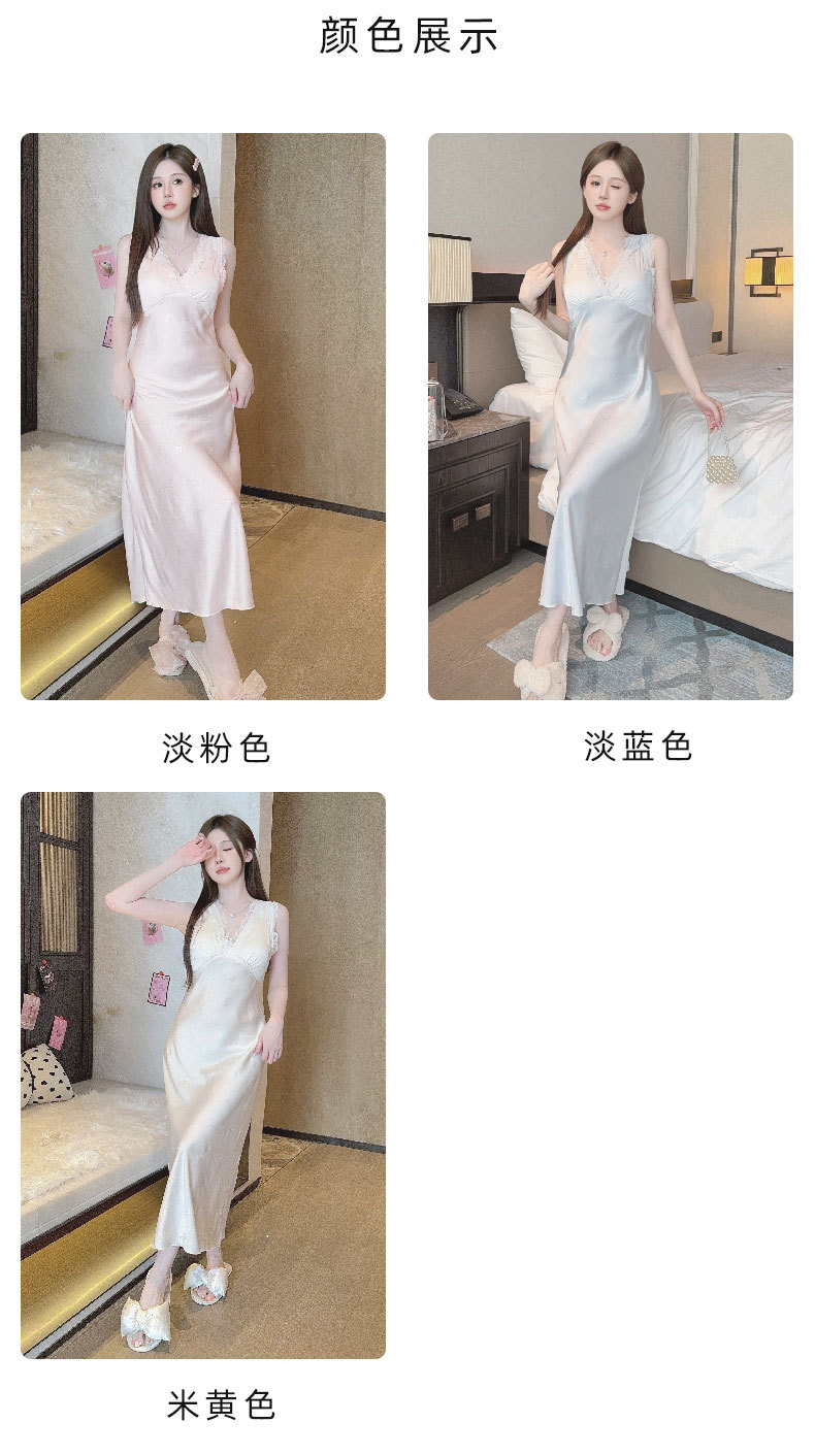 여름용 섹시한 잠옷, 아이스 실크 얇은 고급 프린트 롱 드레스, 가슴 패드 포함, 봄 가을용 큰 사이즈, 슬림한 홈웨어스토어 가기