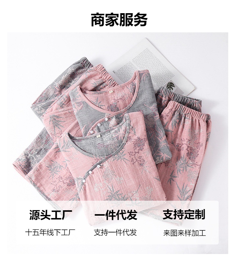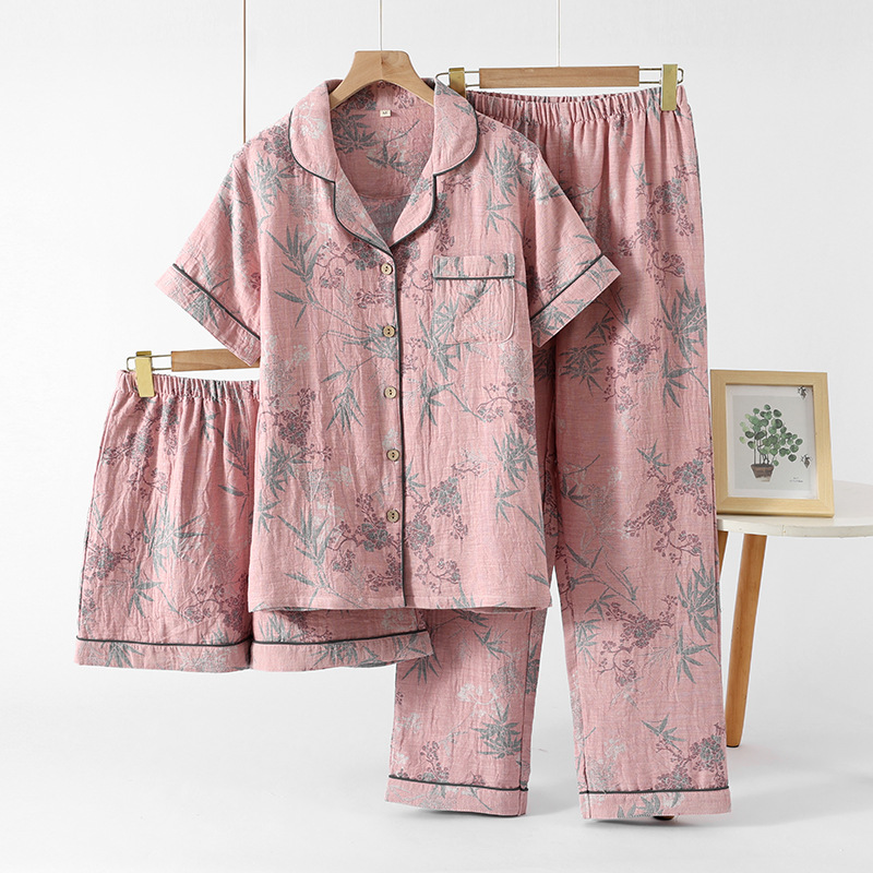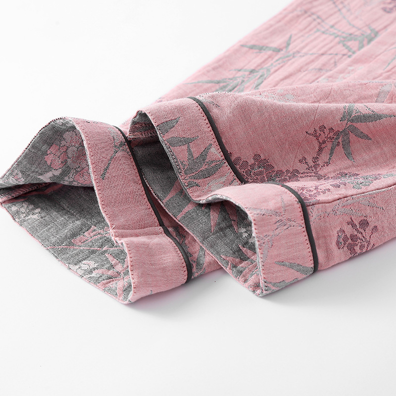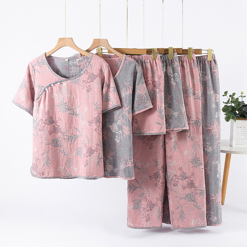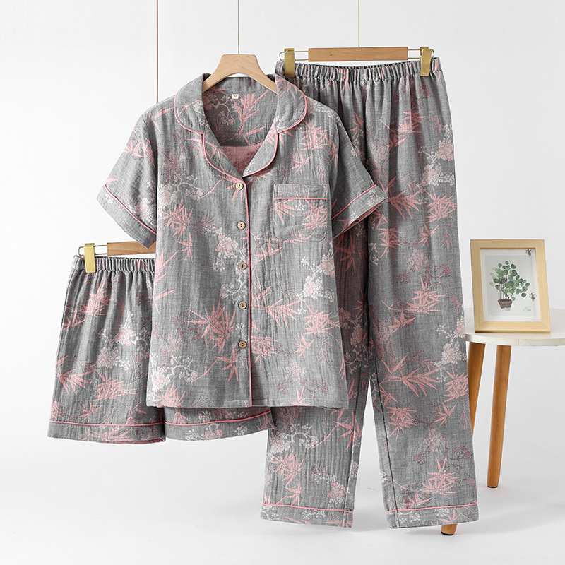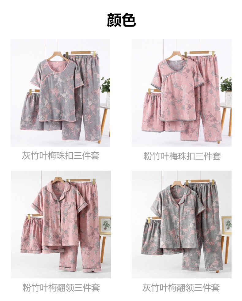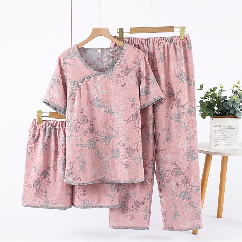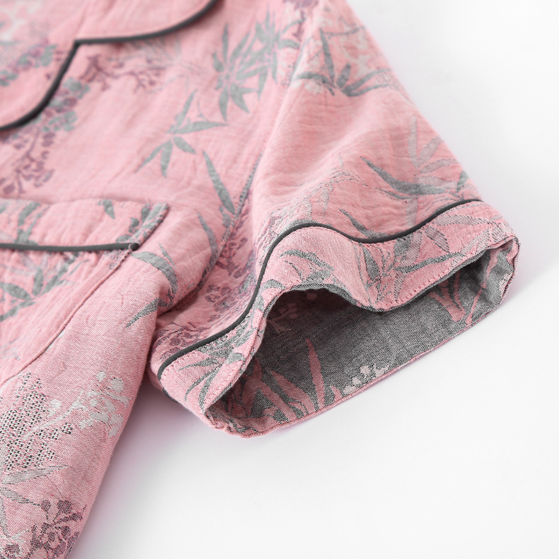 2025 새로운 스타일 Guofeng Jacquard Cotton 더블 레이어 원사 파자마 여성 여름 반팔 바지 세트 3 피스 세트스토어 가기