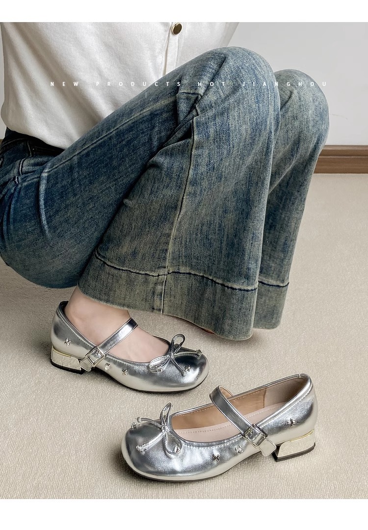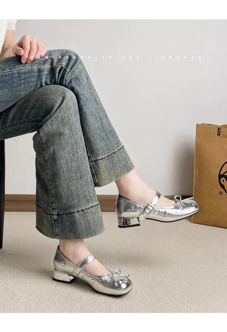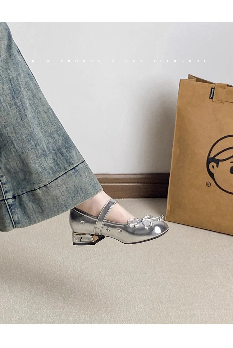 프렌치 메리제인 하이힐, 실버 부잣집 딸, 부드러운 두꺼운 굽의 싱글 슈즈, 2025년 봄 편안한 신부 들러리 슈즈스토어 가기