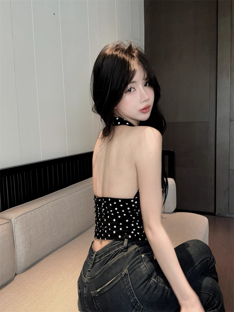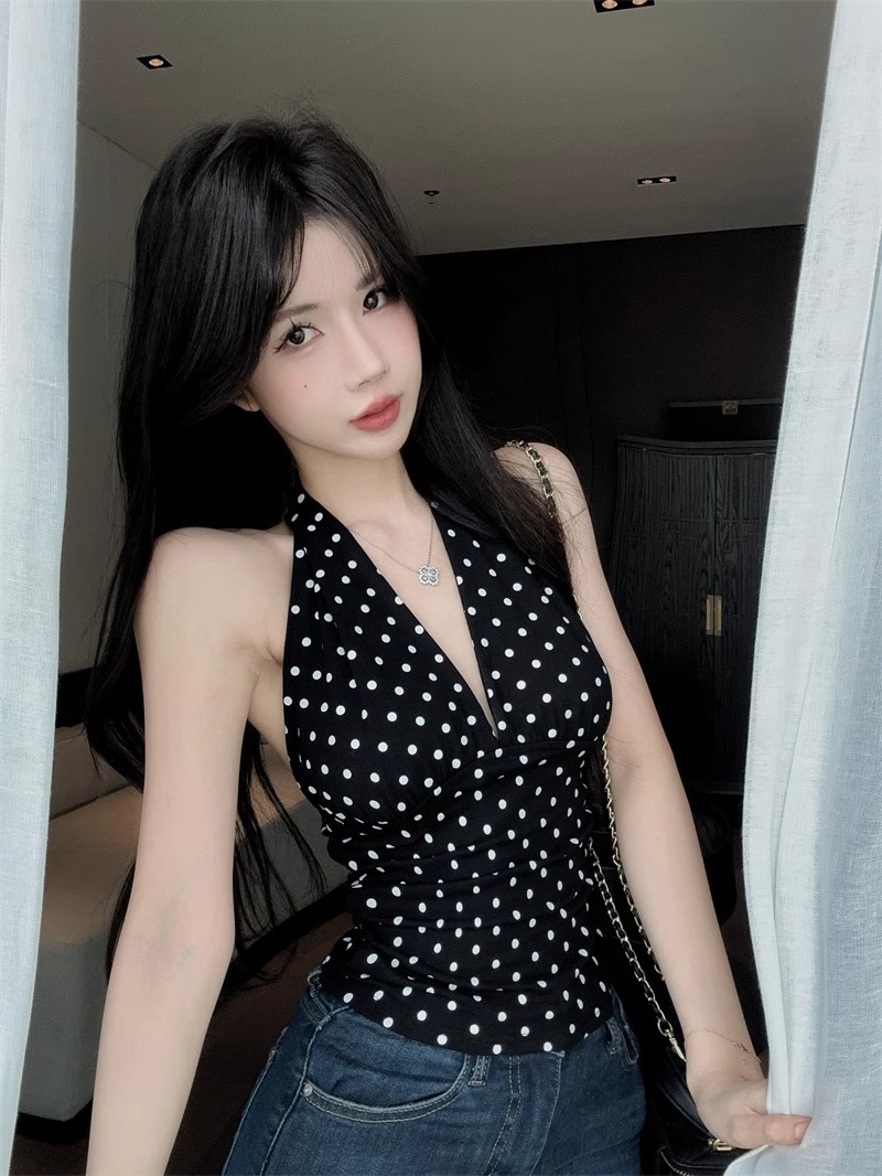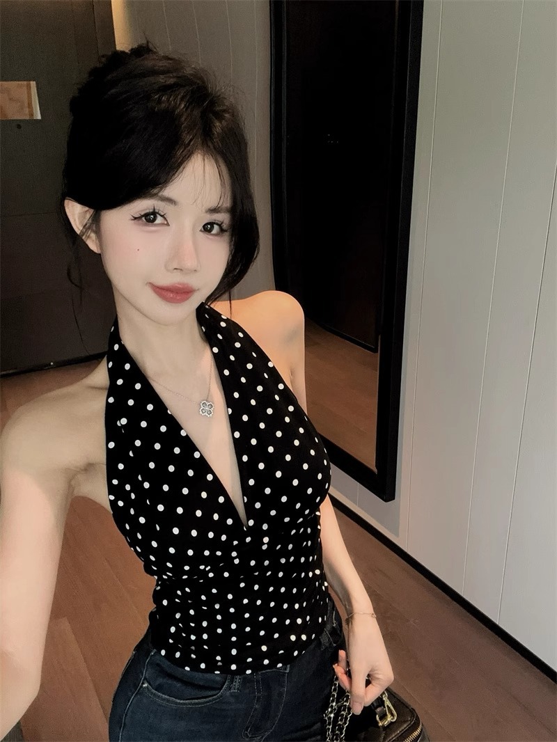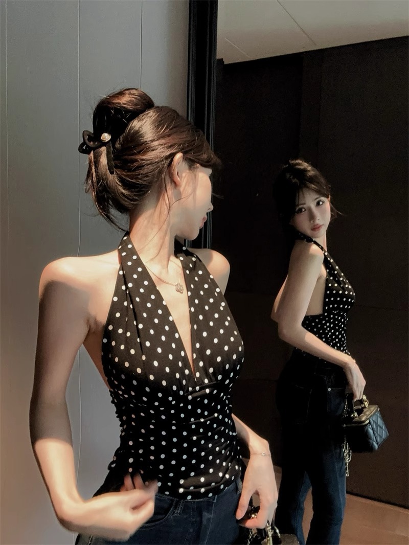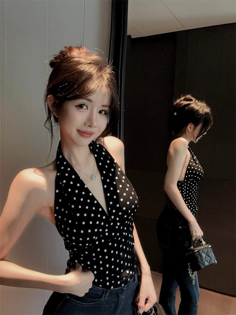 2025 새로운 스타일의 블랙 폴카 도트 다용도 백리스 브이넥 홀터넥 탑 여성용 하이엔드 기질 허리 스타일 조끼스토어 가기