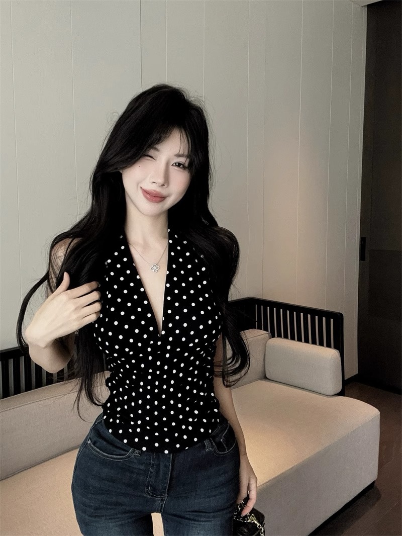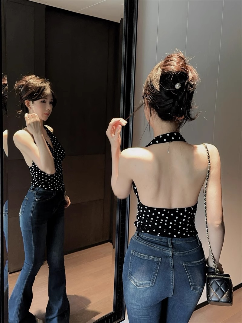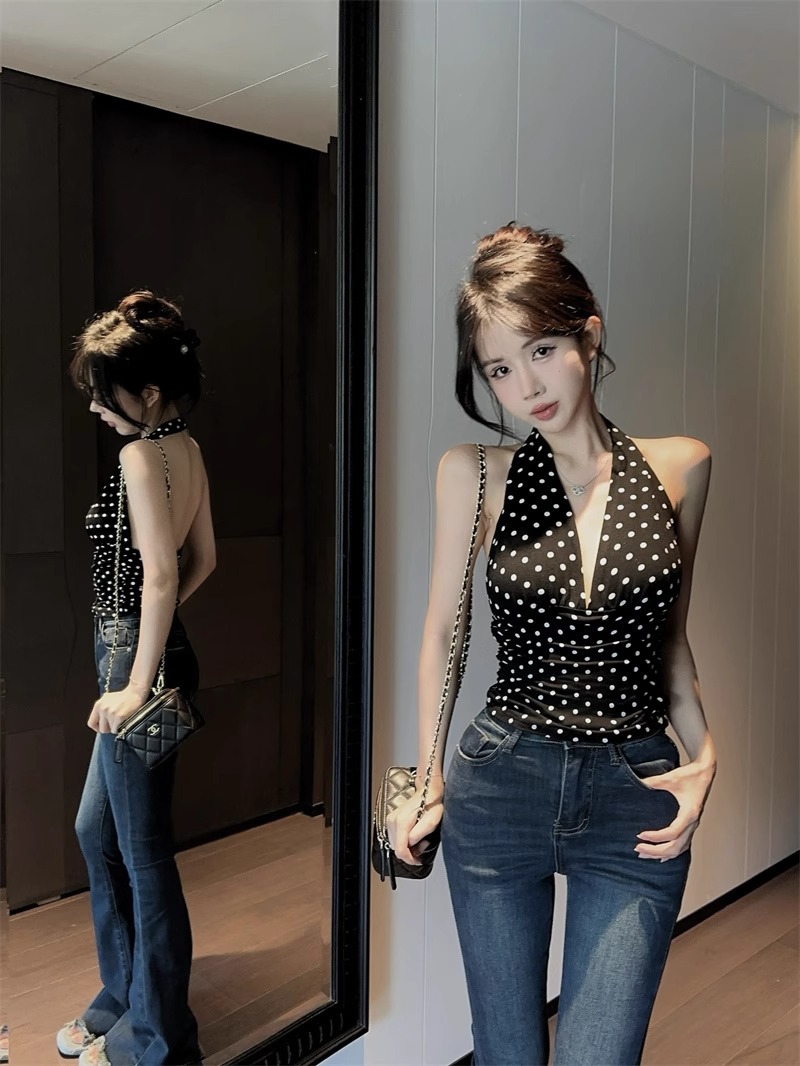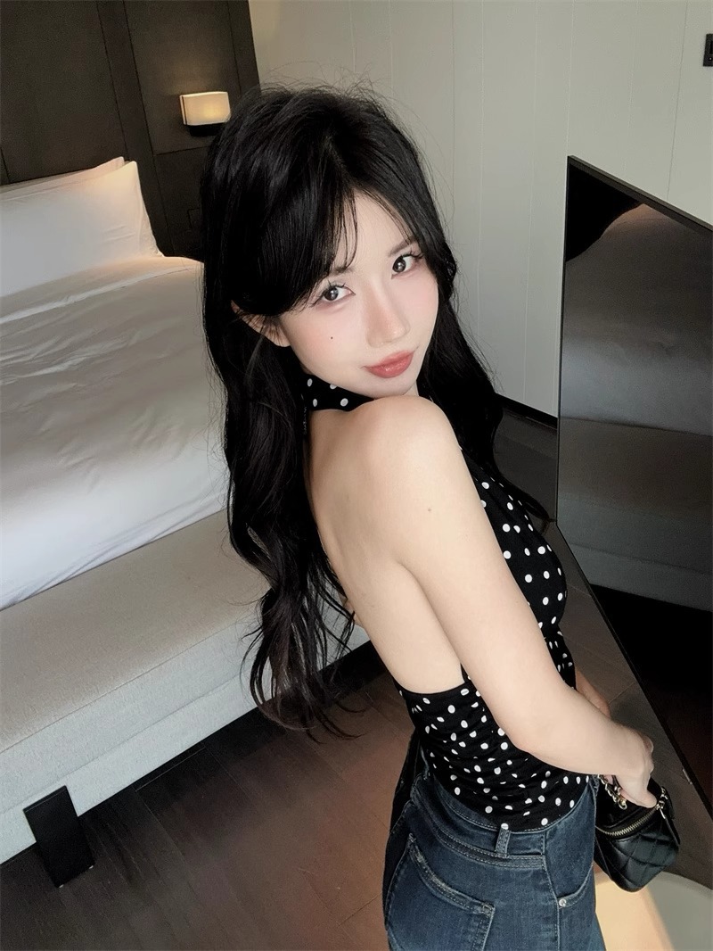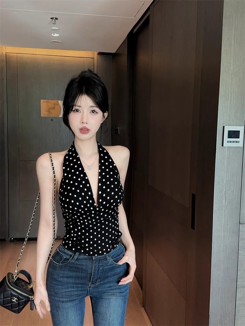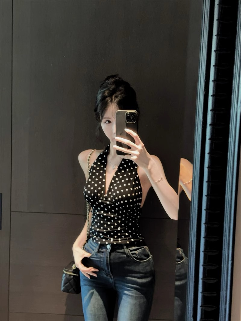 2025 새로운 스타일의 블랙 폴카 도트 다용도 백리스 브이넥 홀터넥 탑 여성용 하이엔드 기질 허리 스타일 조끼스토어 가기