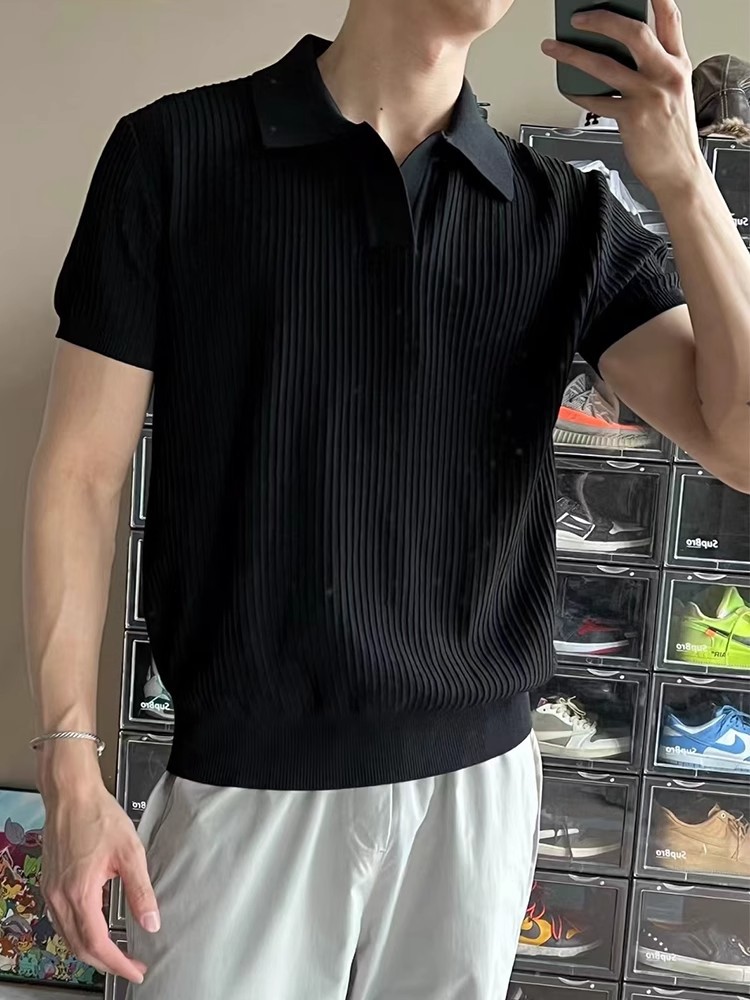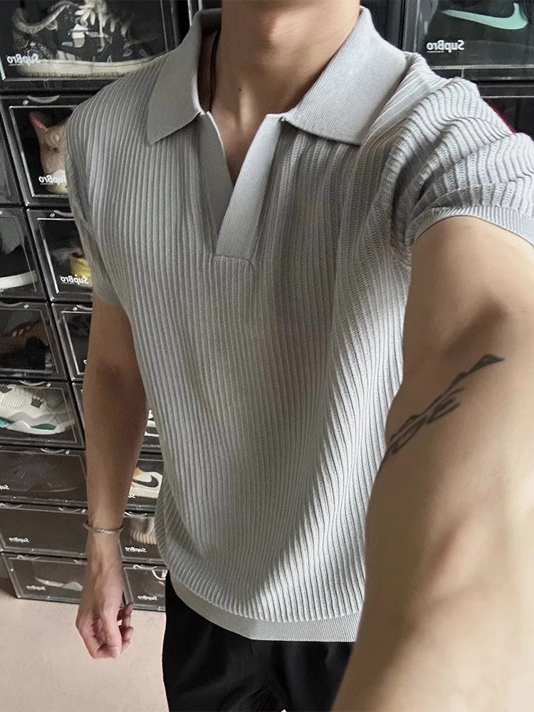 올드 머니 스타일 갈매기 v 넥 니트 반팔 남성 여름 얇은 하이 엔드 커프 폴로 셔츠 티셔츠 슬림 반소매스토어 가기