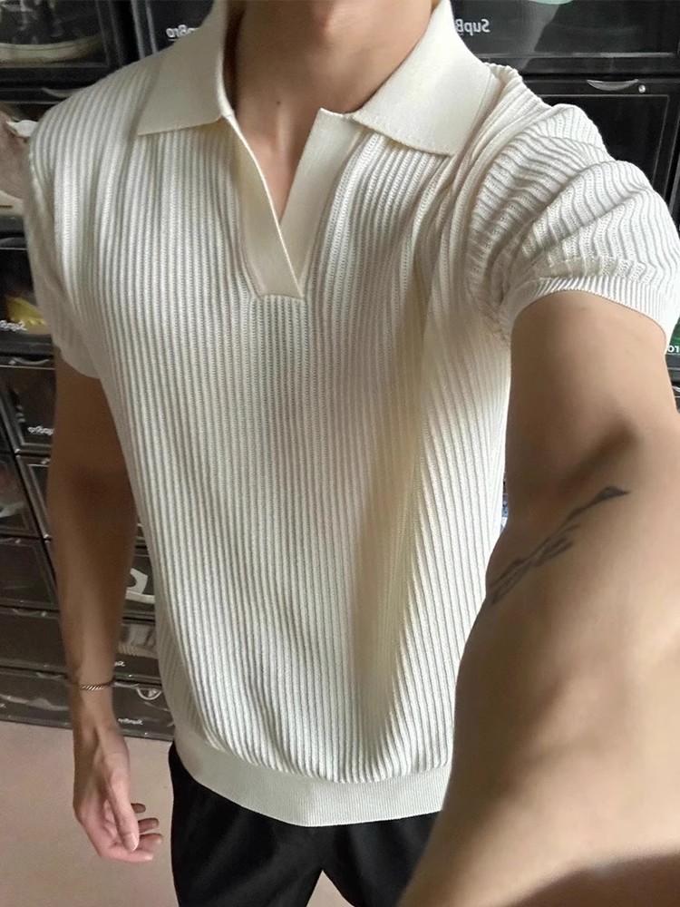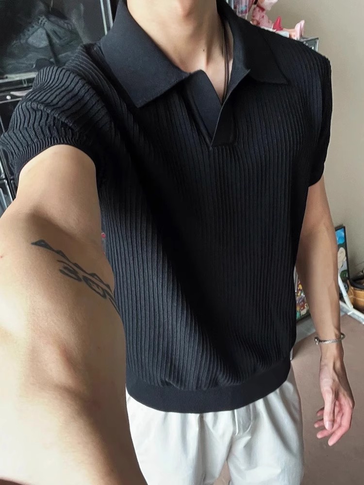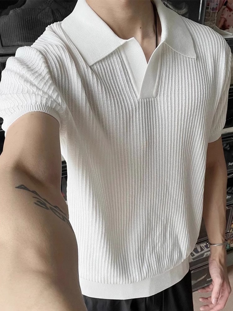 올드 머니 스타일 갈매기 v 넥 니트 반팔 남성 여름 얇은 하이 엔드 커프 폴로 셔츠 티셔츠 슬림 반소매