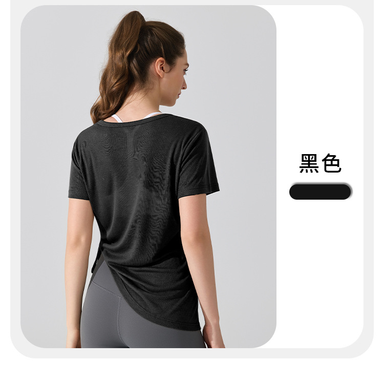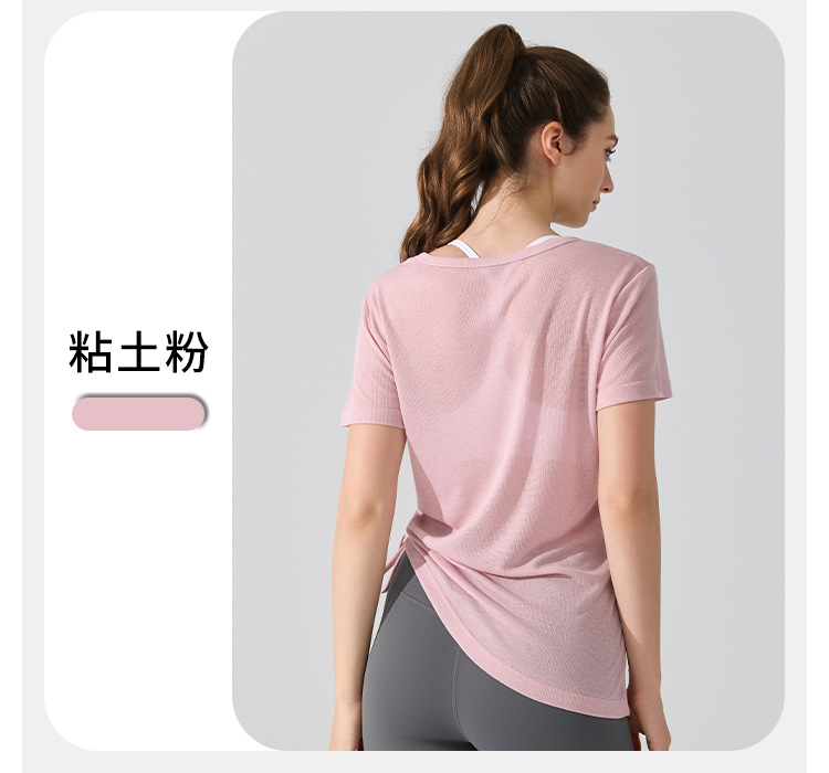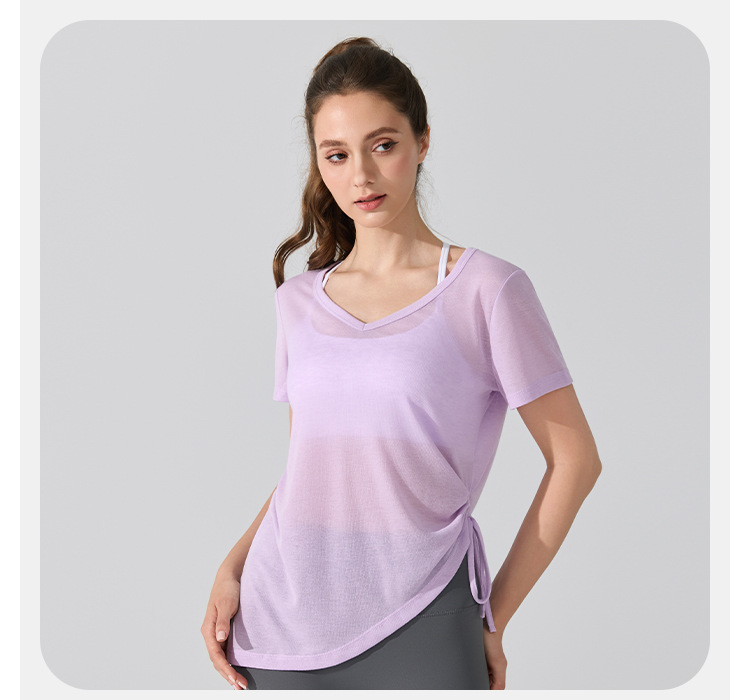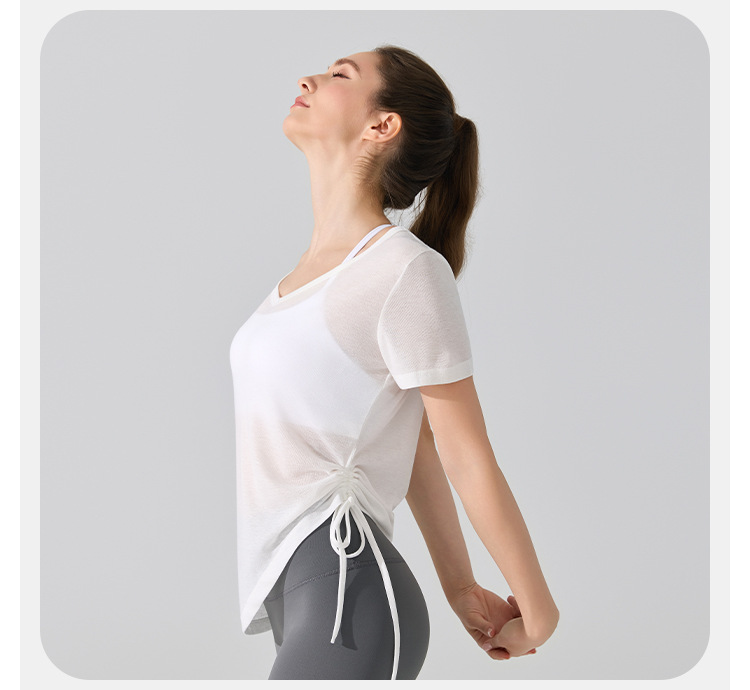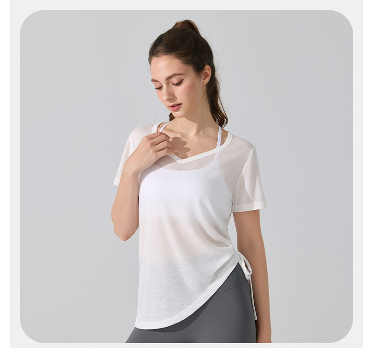 여름 브이넥 요가 커버업 반팔 엉덩이 커버 사이드 드로스트링 티셔츠 피트니스 런닝 루즈하고 통기성이 뛰어나며 속건성 요가복