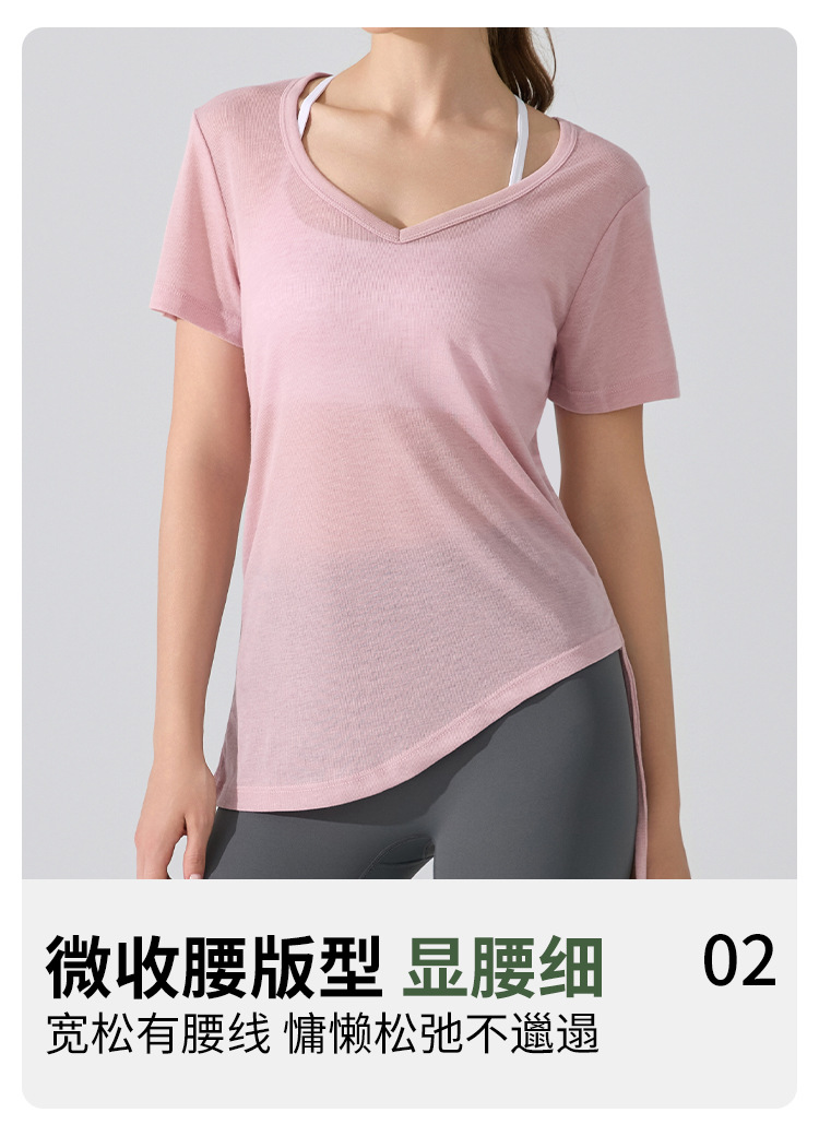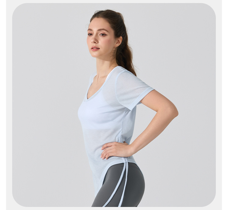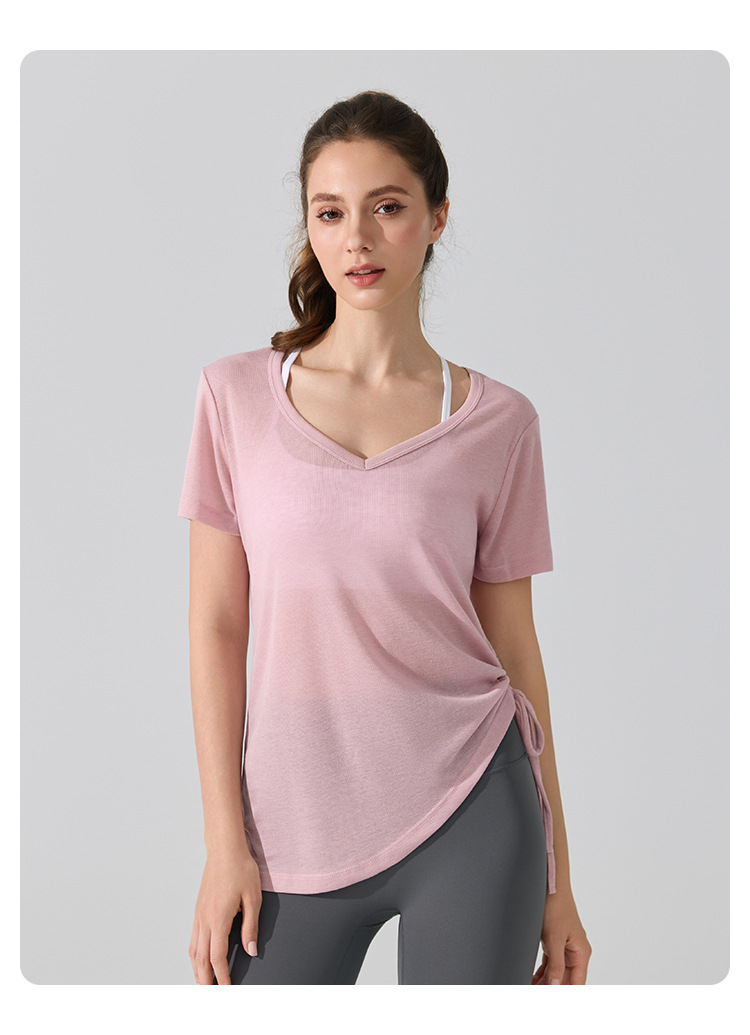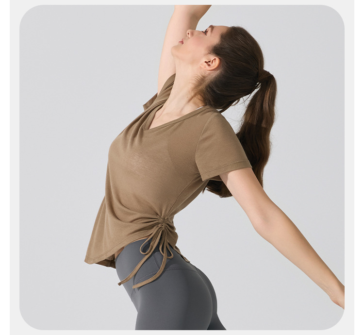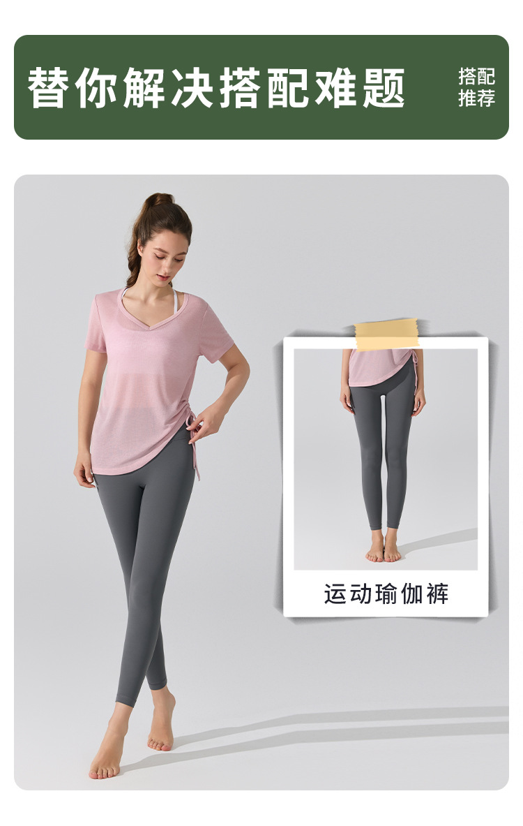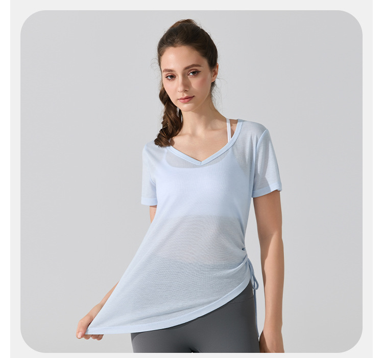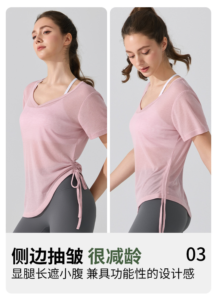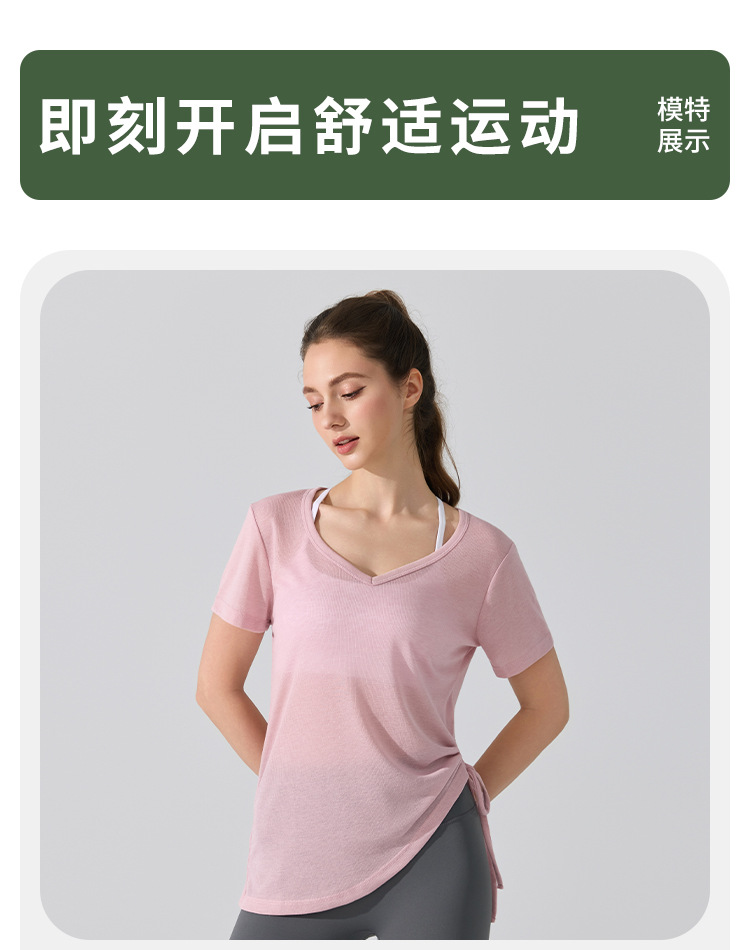 여름 브이넥 요가 커버업 반팔 엉덩이 커버 사이드 드로스트링 티셔츠 피트니스 런닝 루즈하고 통기성이 뛰어나며 속건성 요가복스토어 가기