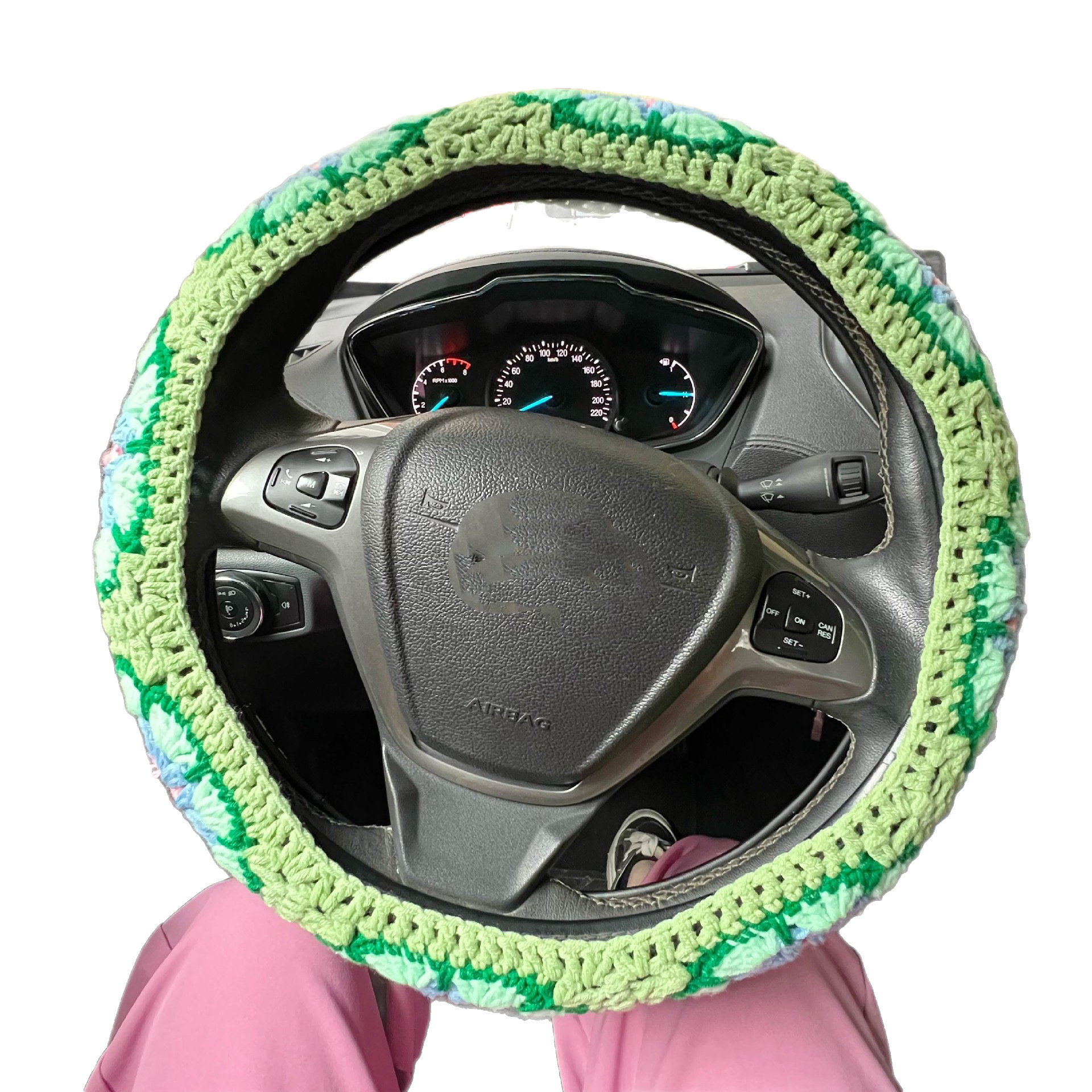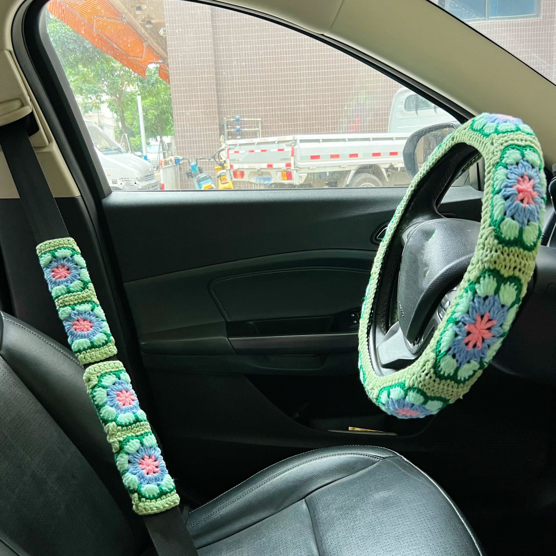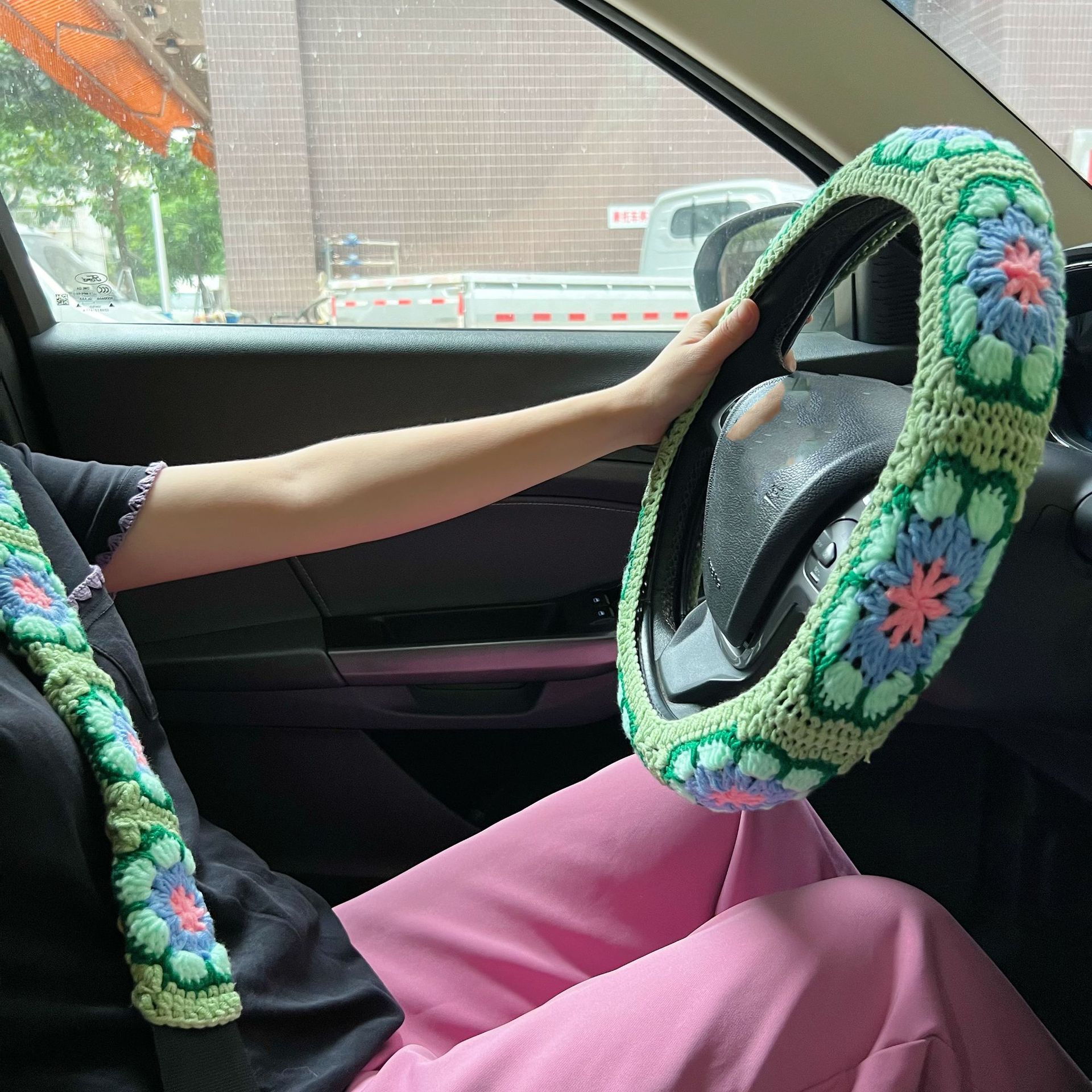 跨境汽车内饰手工钩织非洲菊花朵装饰汽车方向盘套保暖安全带套