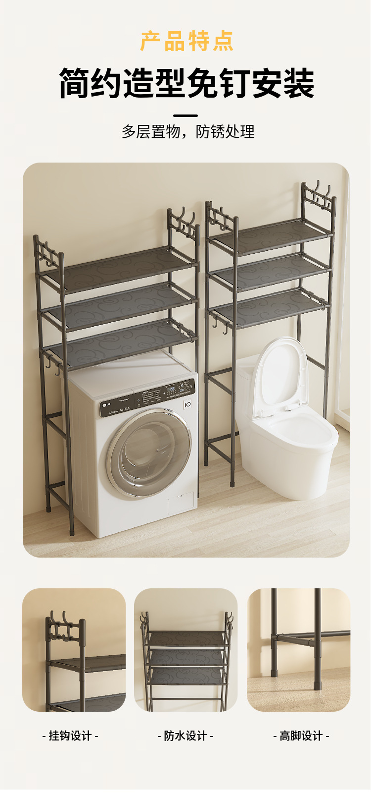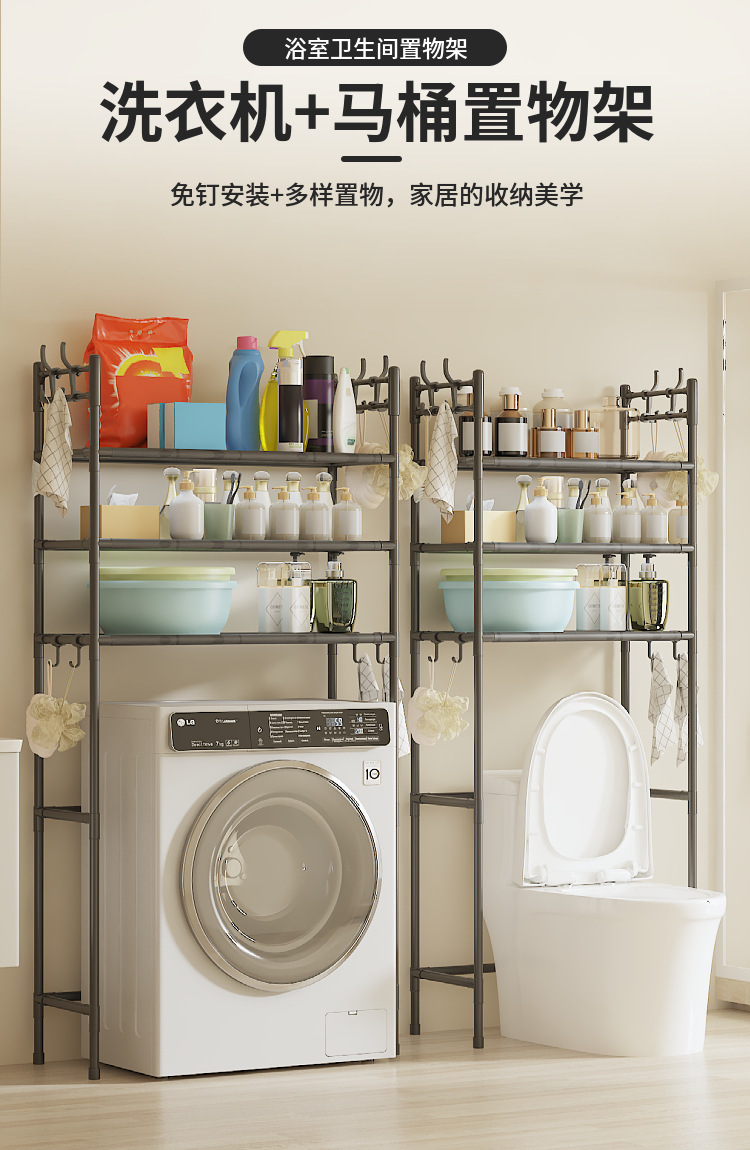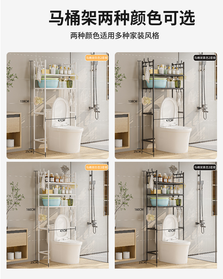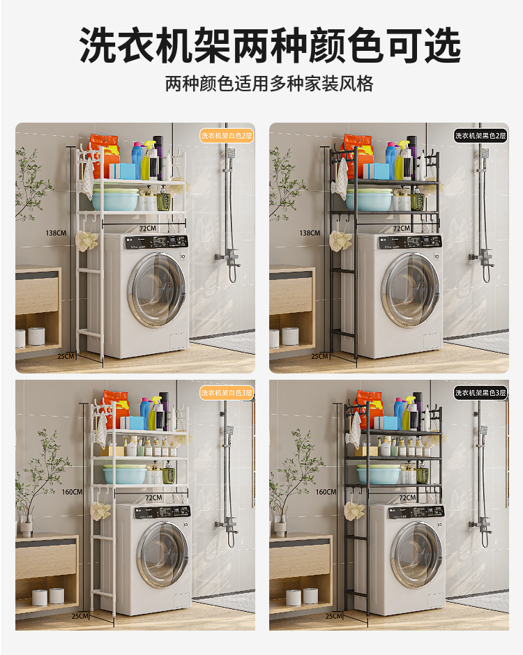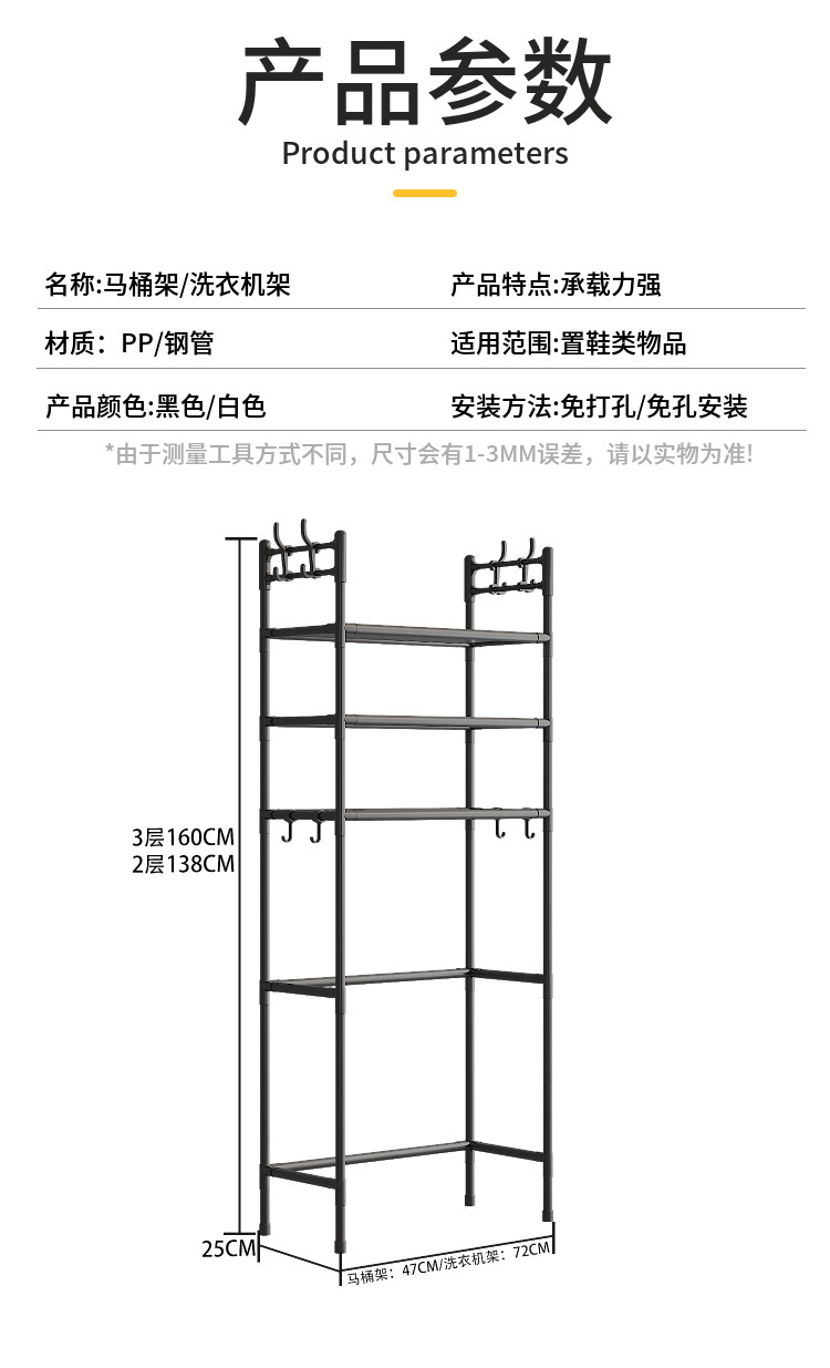 产品尺寸:2层马桶架47*25*138cm 3层马桶架47*25*160cm 2层洗衣机架72*25*138cm 3层洗衣机架72*25*160cm