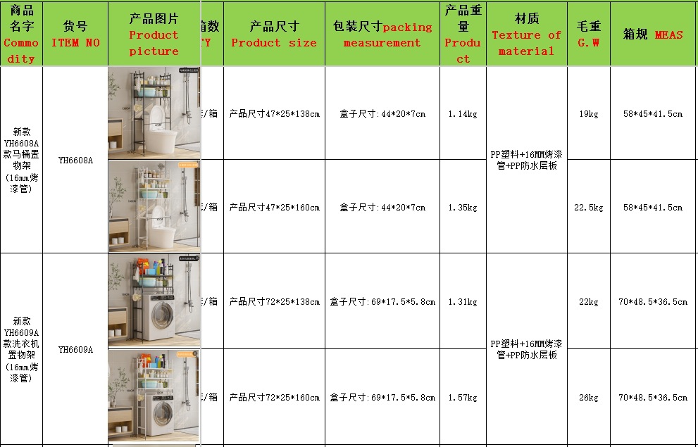 商品重量:2层马桶架1.14kg 3层马桶架1.35kg 2层洗衣机架1.31kg 3层洗衣机架1.57kg