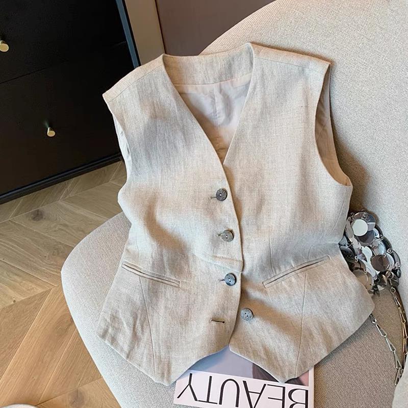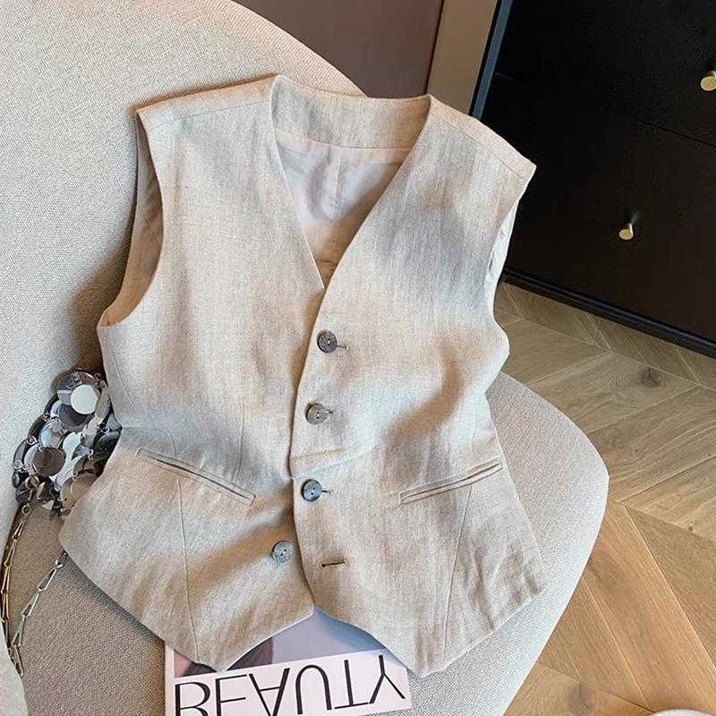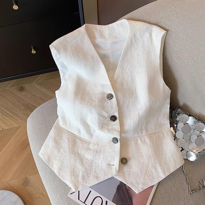 여성용 올드 머니 스타일 레이어드 린넨 정장 조끼, 모시 원단 정장 조끼, 민소매 조끼, 싱글 브레스트스토어 가기