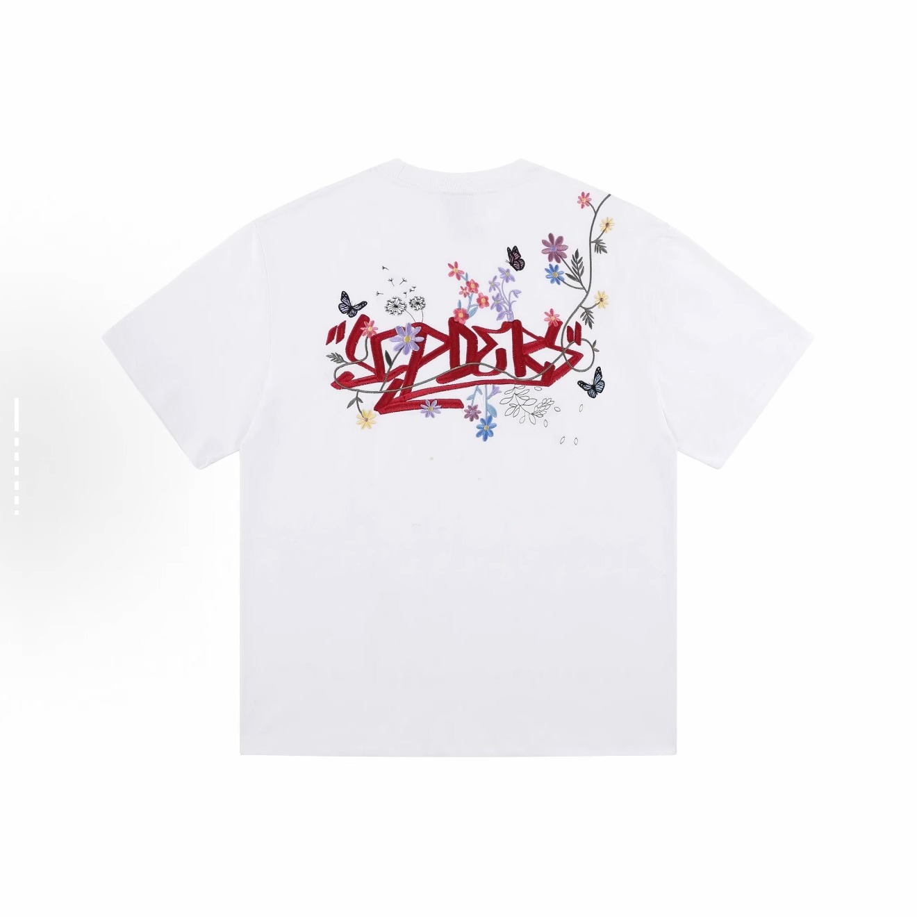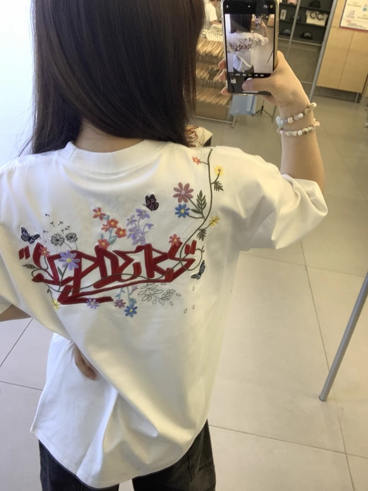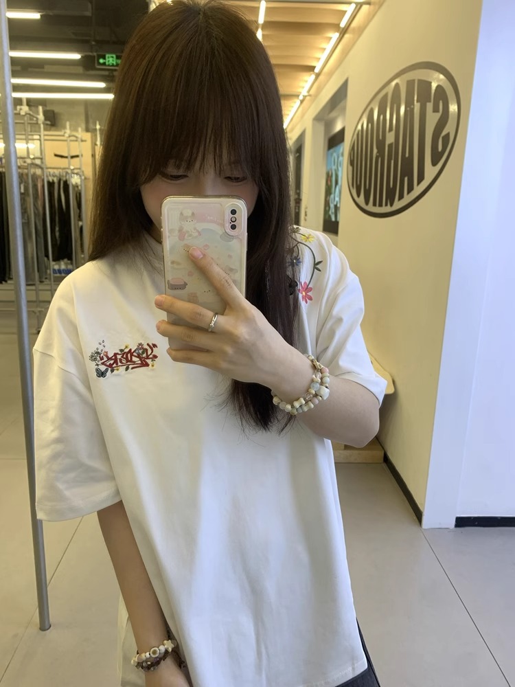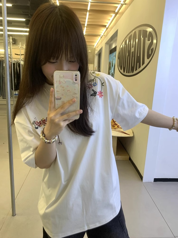 여름 반팔 루즈한 하이엔드 커플 스타일 트렌디 브랜드 코튼 탑 여성용 아메리칸 하이 스트리트 레터 자수 오른쪽 어깨 티셔츠스토어 가기