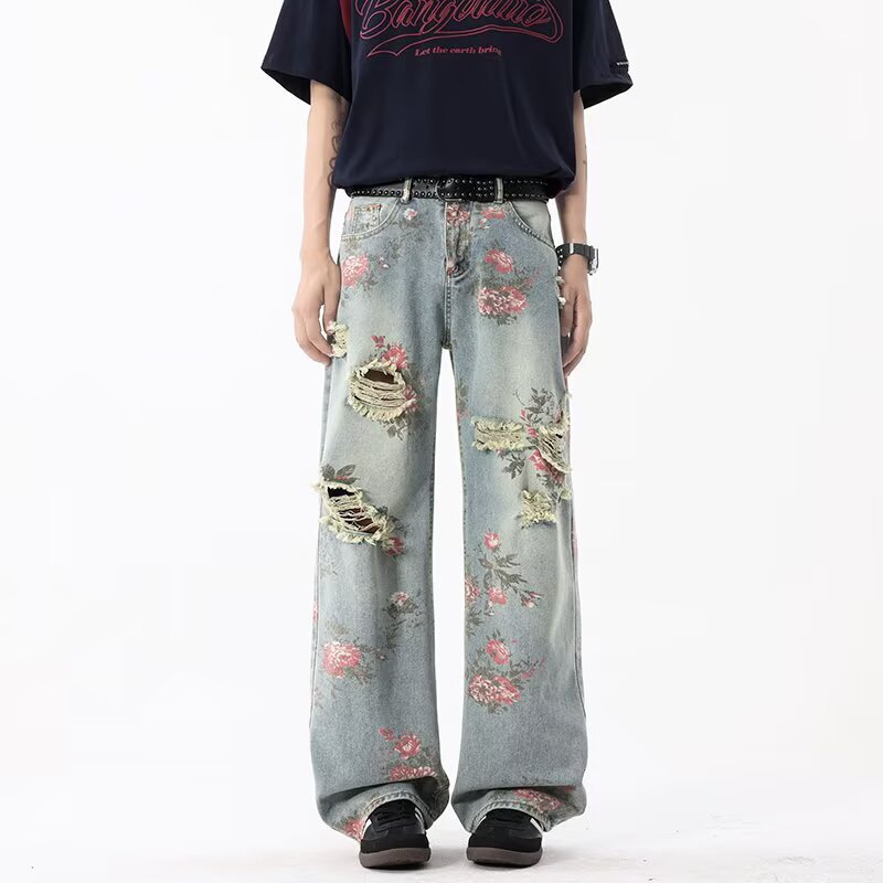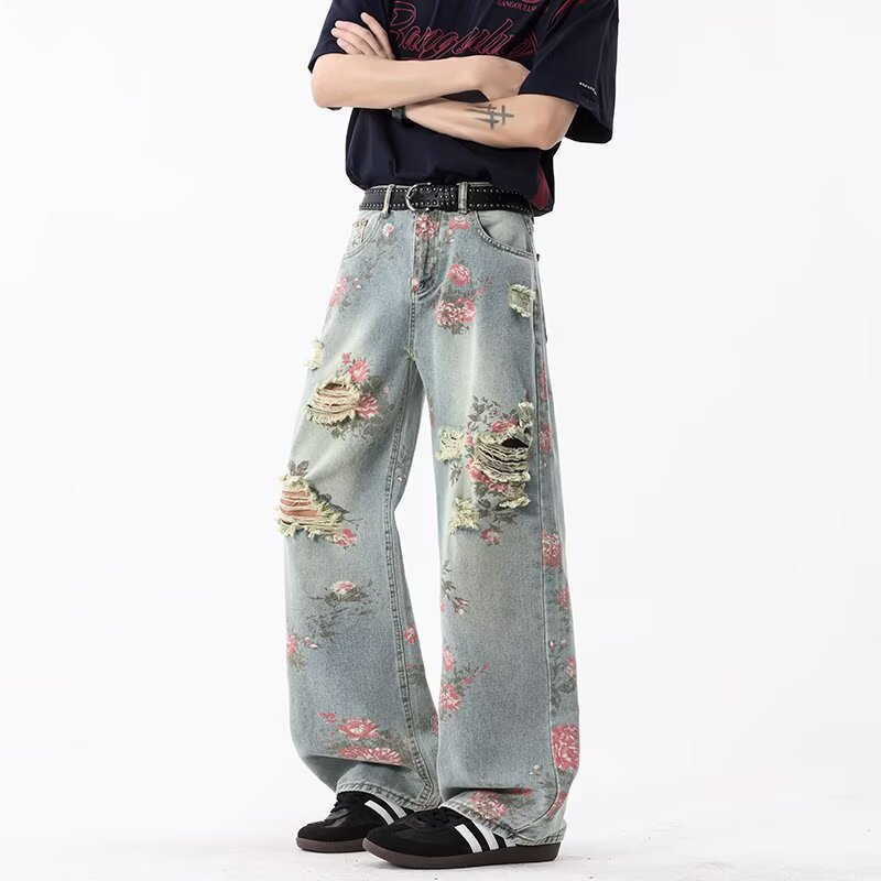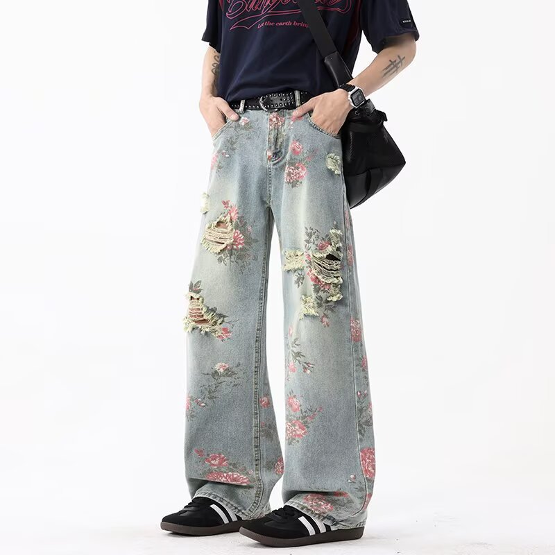 남성용 아메리칸 플로럴 찢어진 청바지, 여름 하이 스트리트 핸섬 디자인 팬츠, 루즈한 스트레이트 슬리밍 팬츠스토어 가기