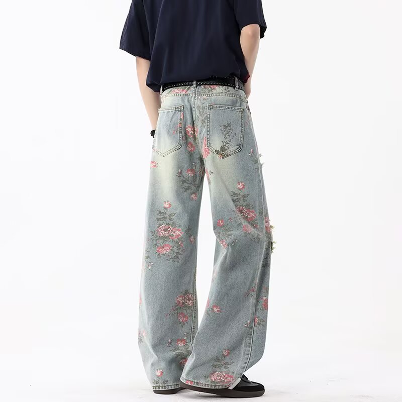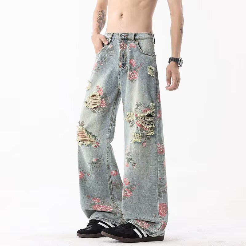 남성용 아메리칸 플로럴 찢어진 청바지, 여름 하이 스트리트 핸섬 디자인 팬츠, 루즈한 스트레이트 슬리밍 팬츠